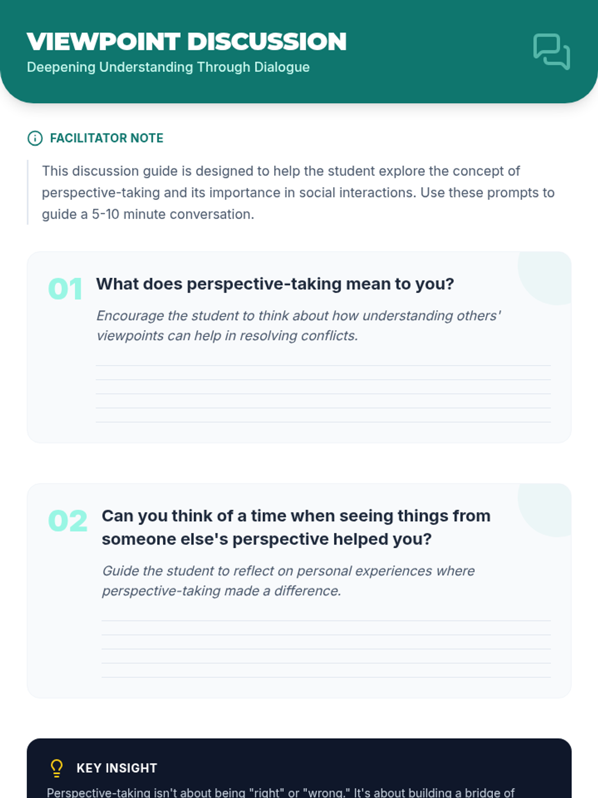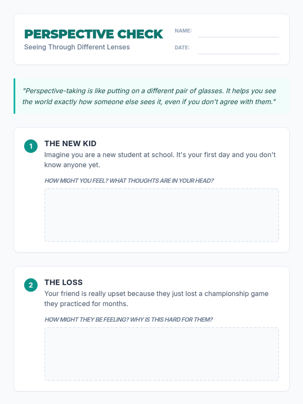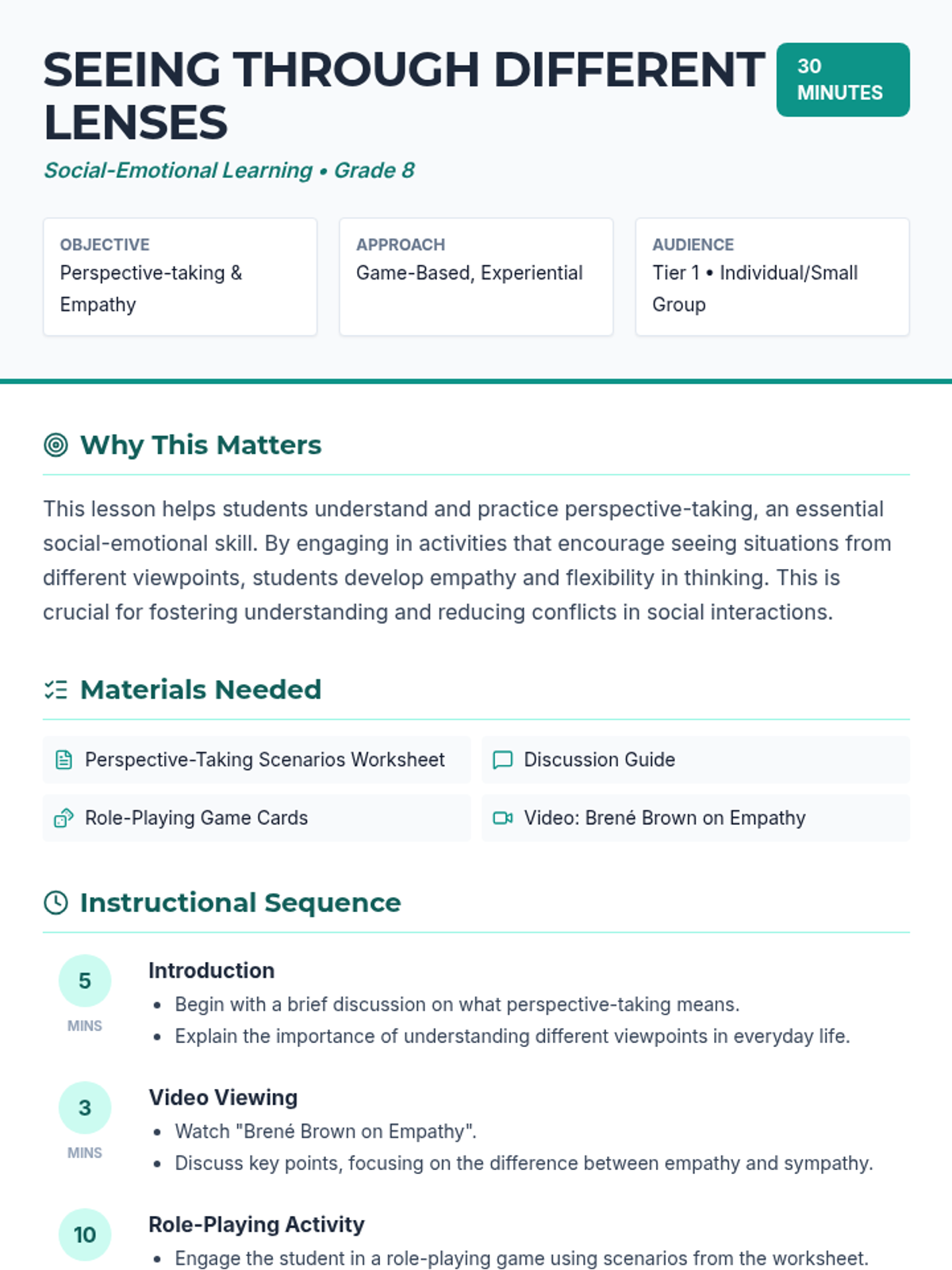 A lesson focused on perspective-taking and empathy, helping students understand different viewpoints through interactive activities and discussion.