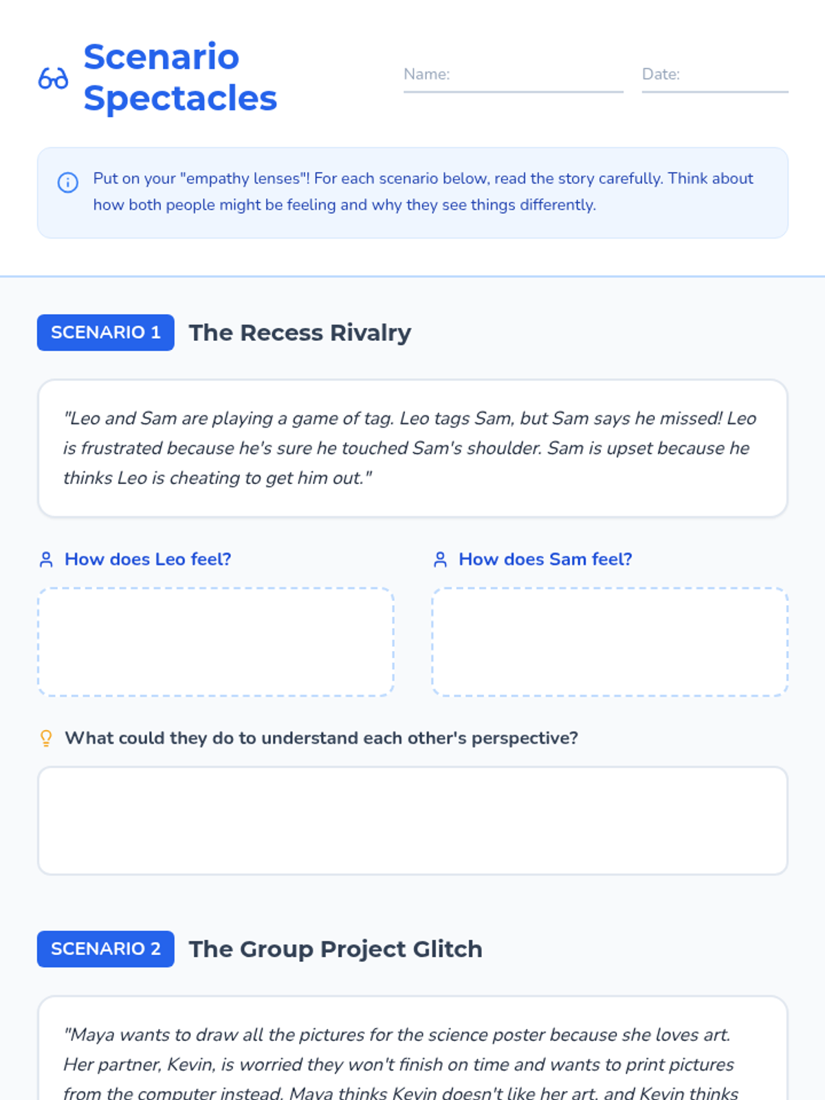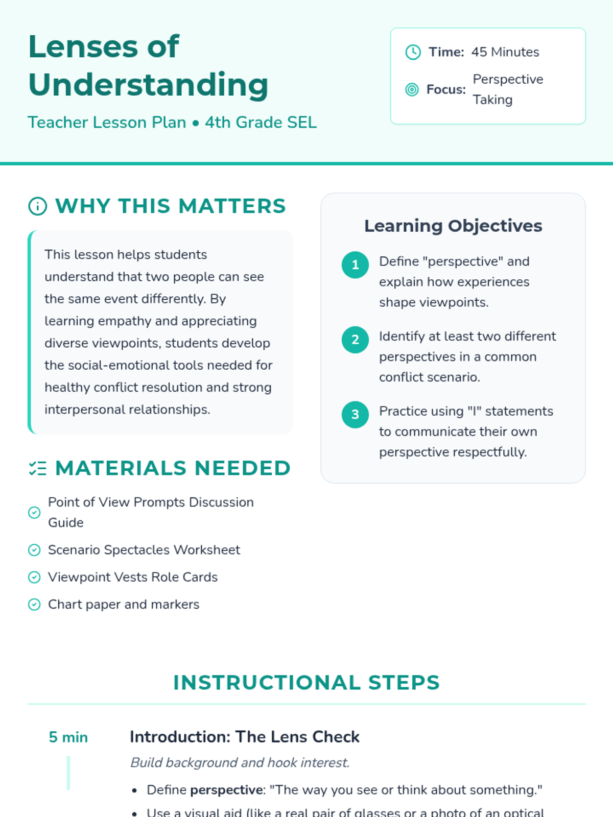 A Social-Emotional Learning lesson for 4th graders to develop empathy and perspective-taking skills through scenarios and role-play.