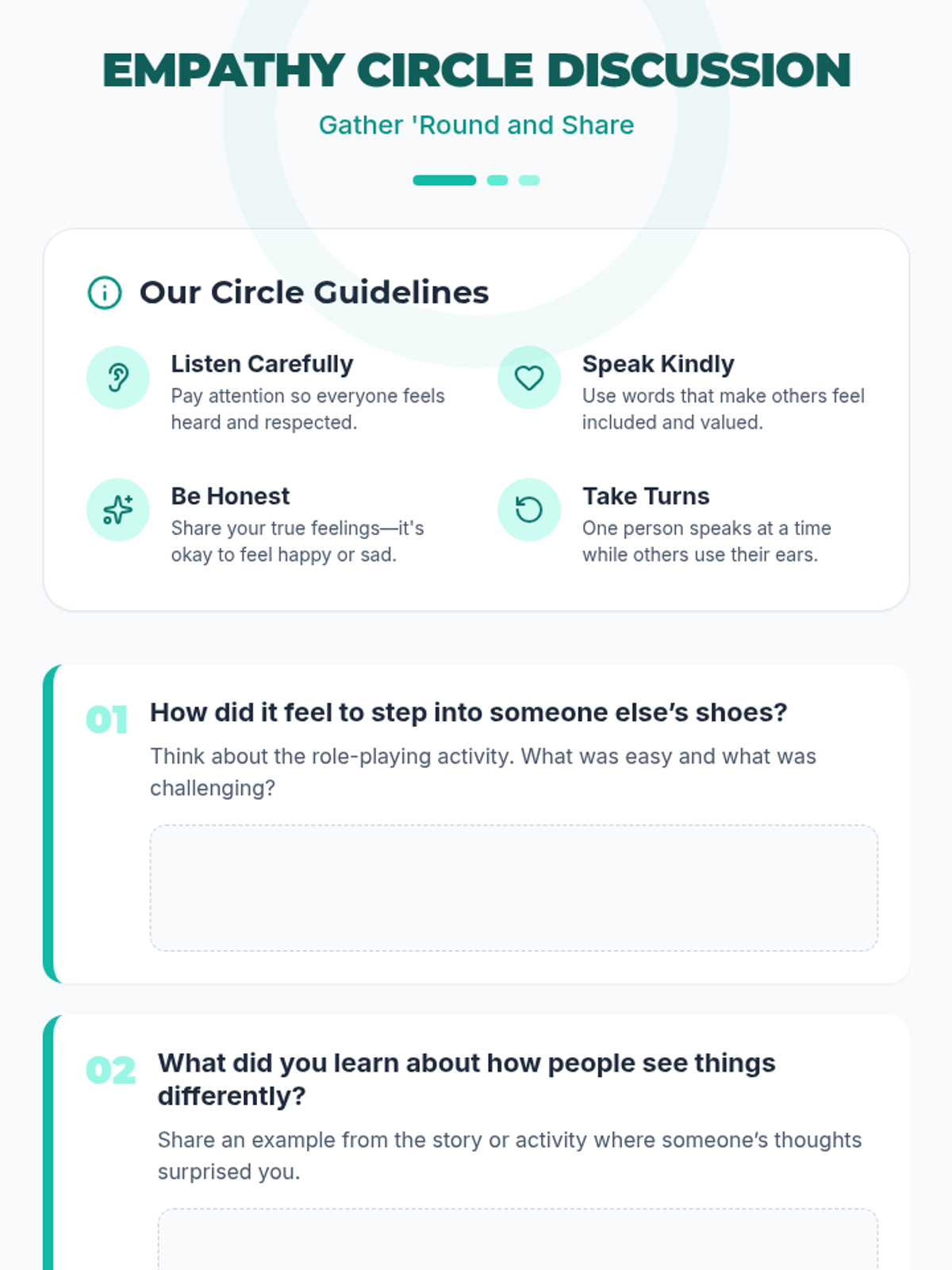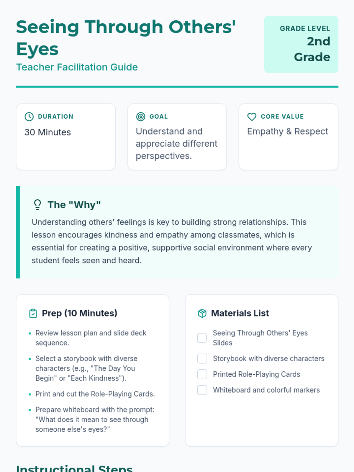 A 2nd-grade social awareness lesson focused on empathy and perspective-taking through storytelling, role-playing, and guided discussion. Students learn to 'see' through different eyes to build stronger classroom relationships.