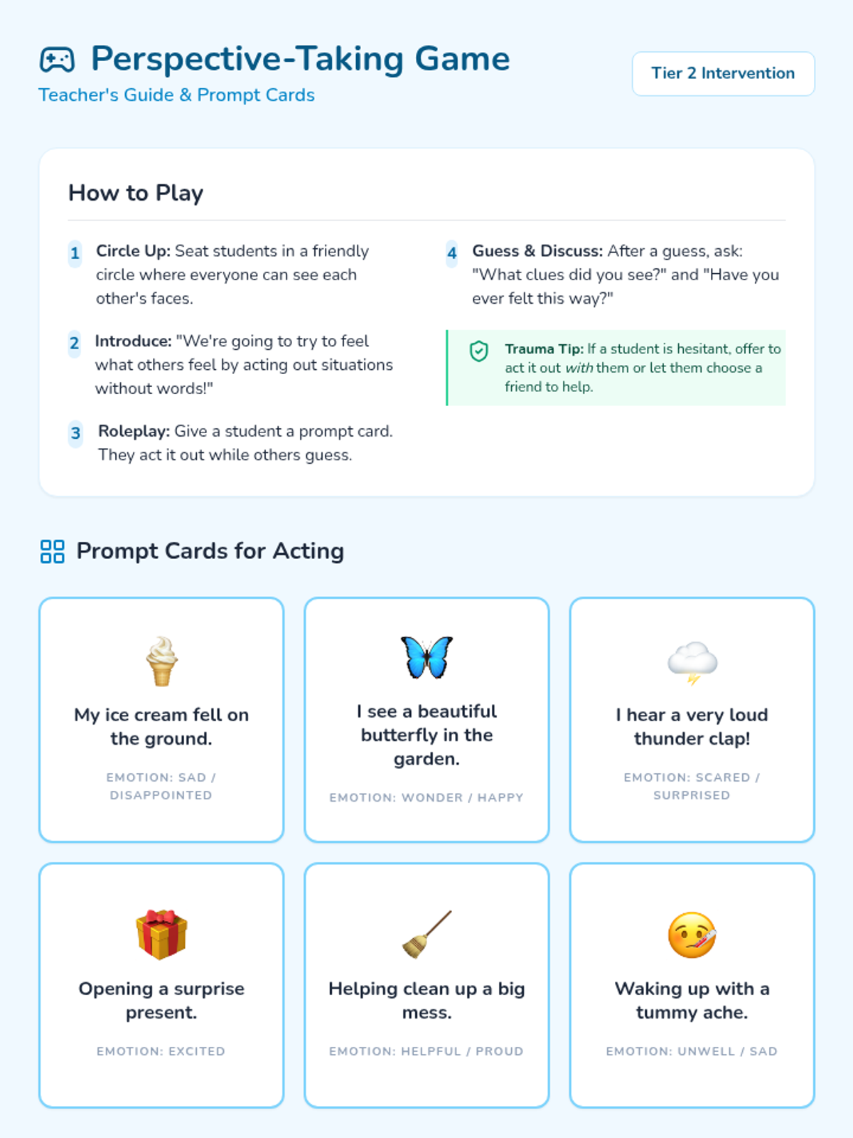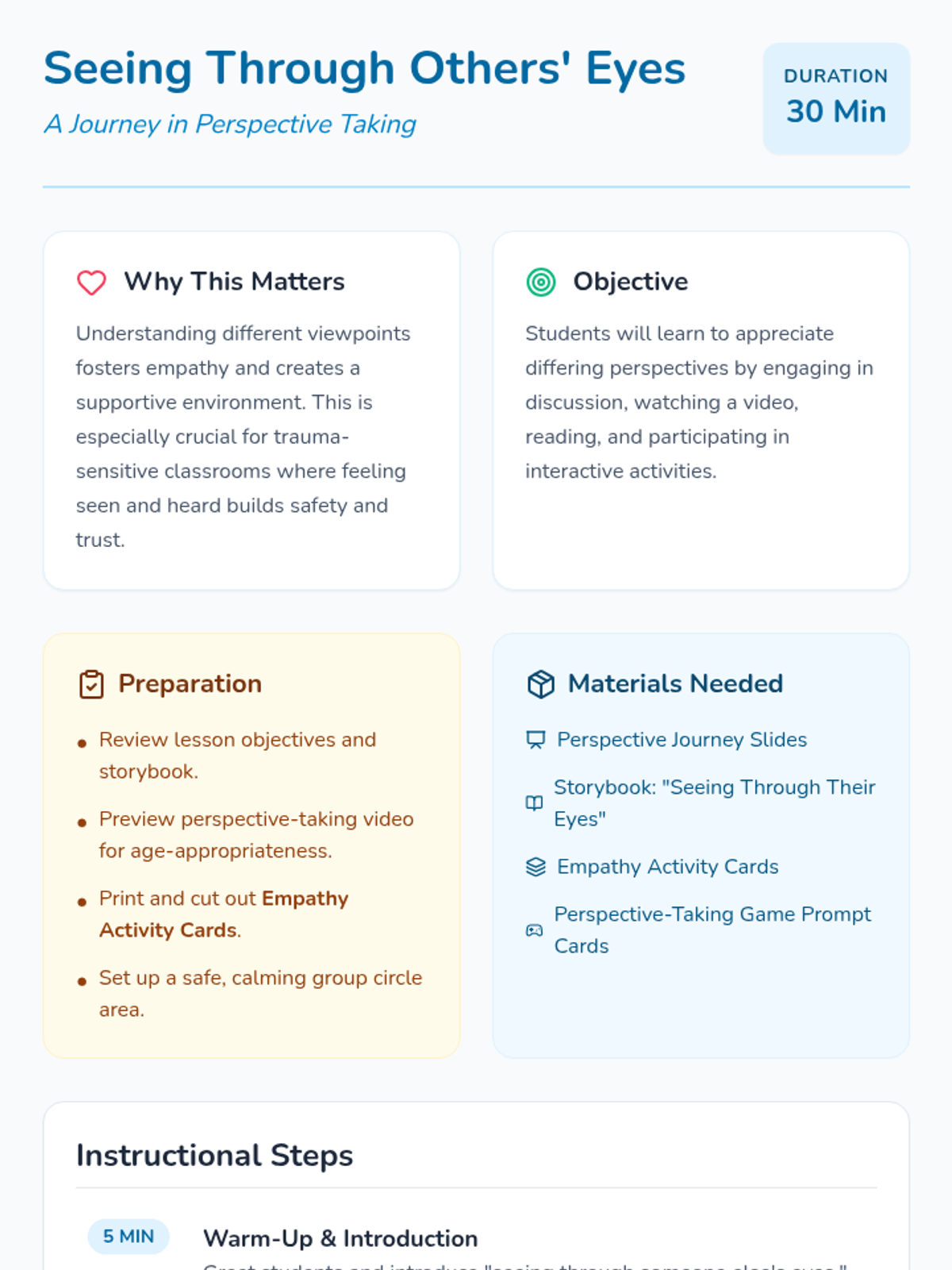 A trauma-informed perspective-taking lesson for kindergarteners, using storytelling and games to build empathy and social-emotional skills.
