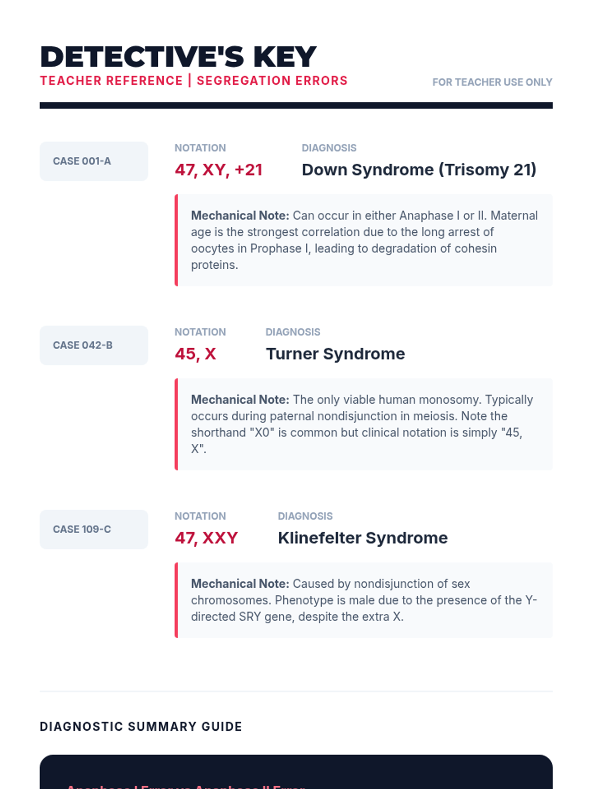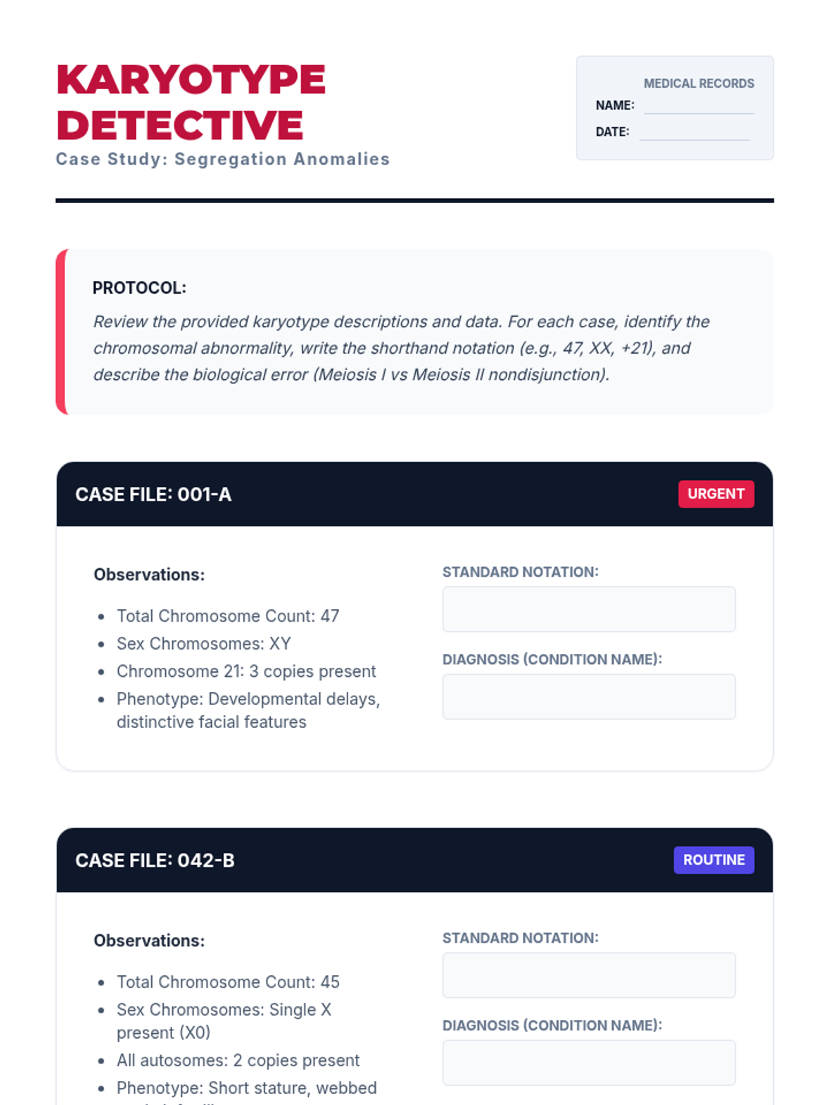 A 90-minute investigation into how genetic mutations and chromosomal abnormalities lead to human disorders. Students act as 'genetic consultants' to analyze karyotypes, pedigrees, and mutation types.