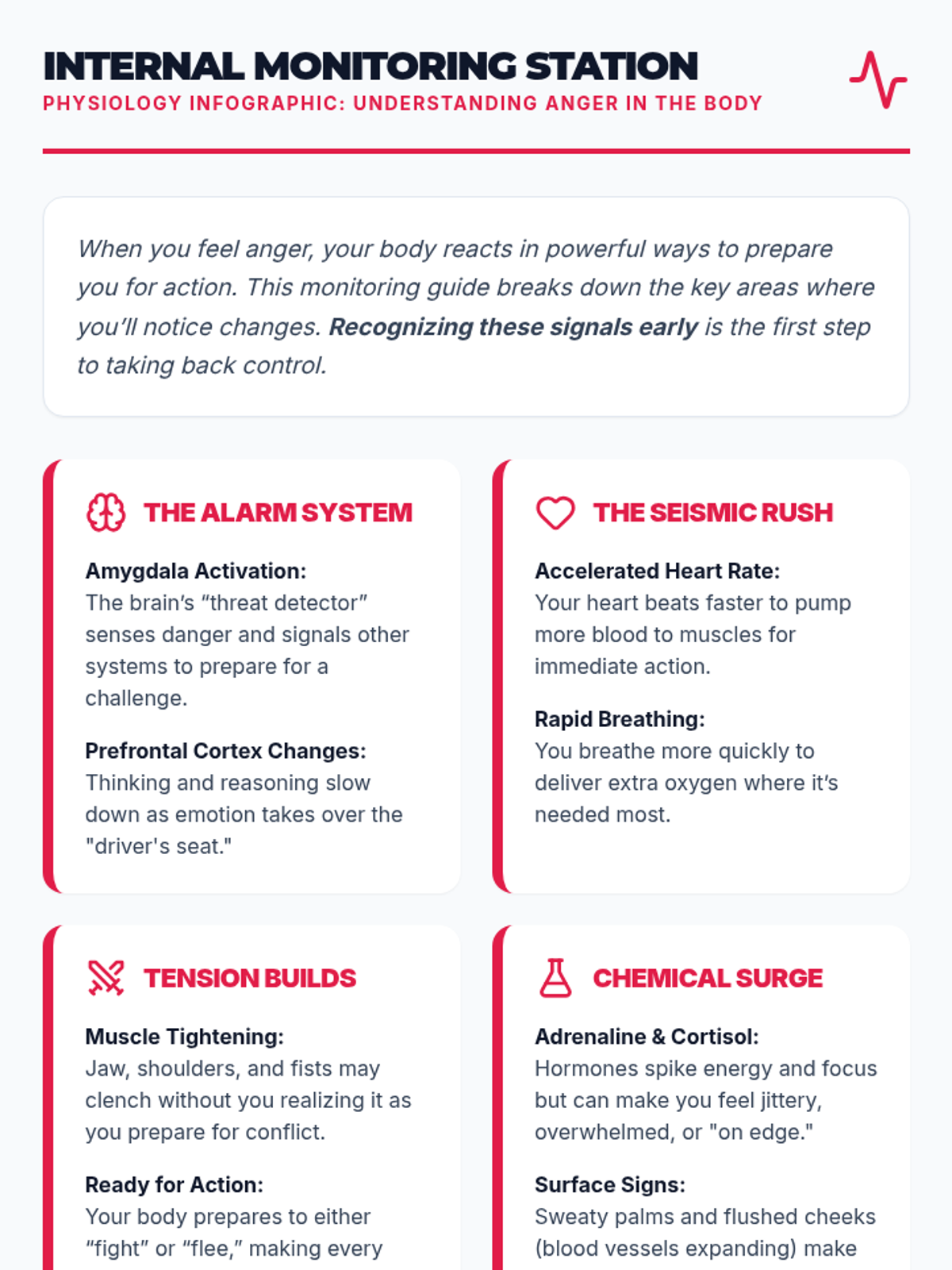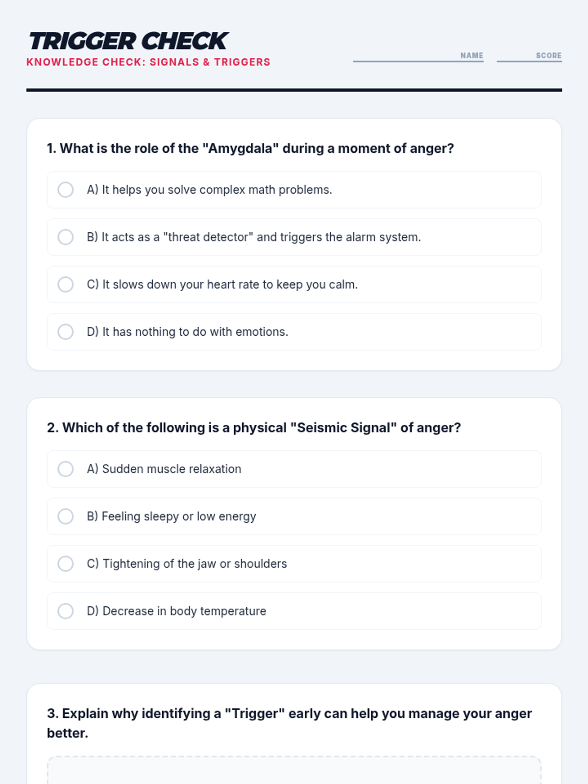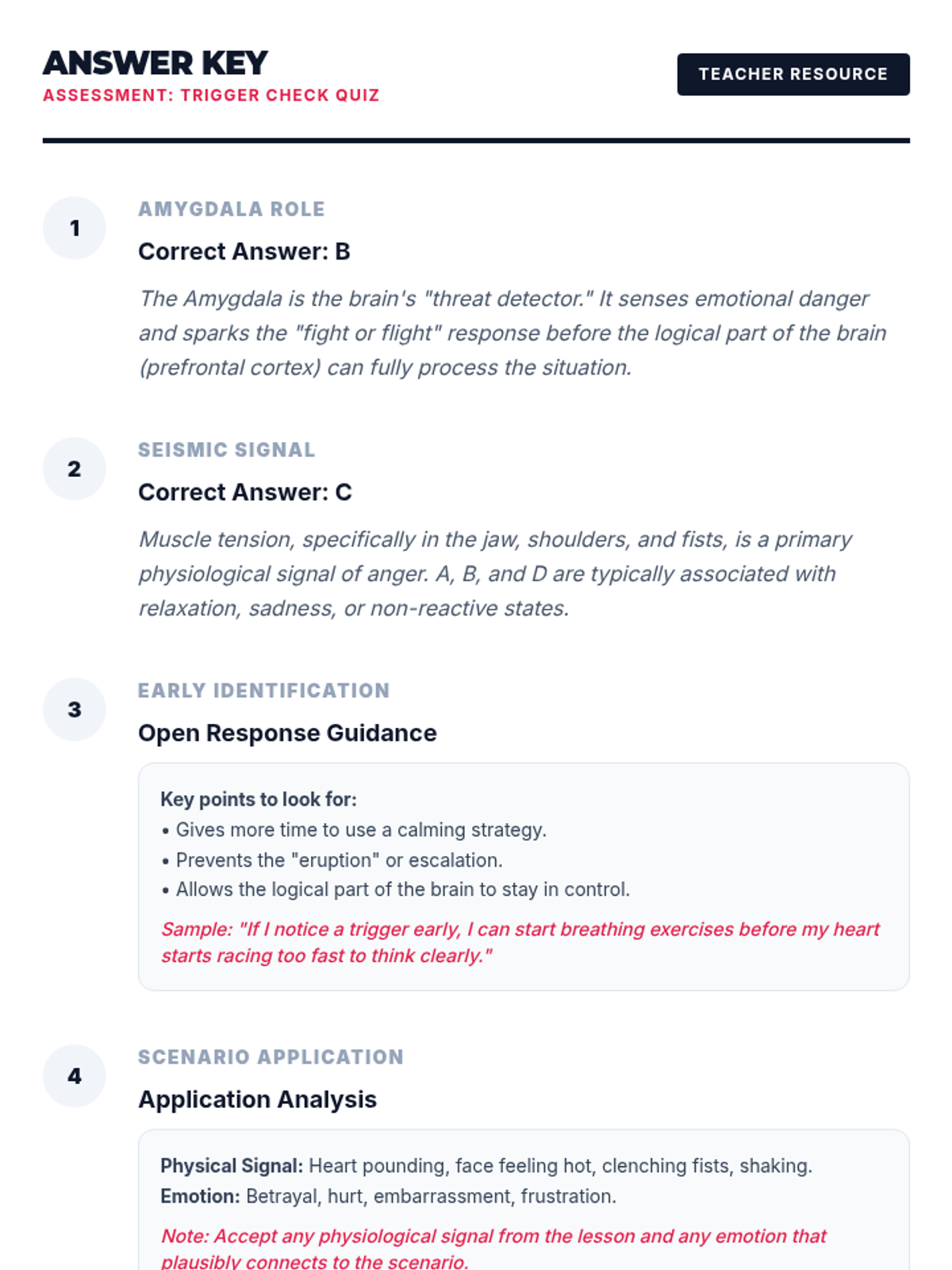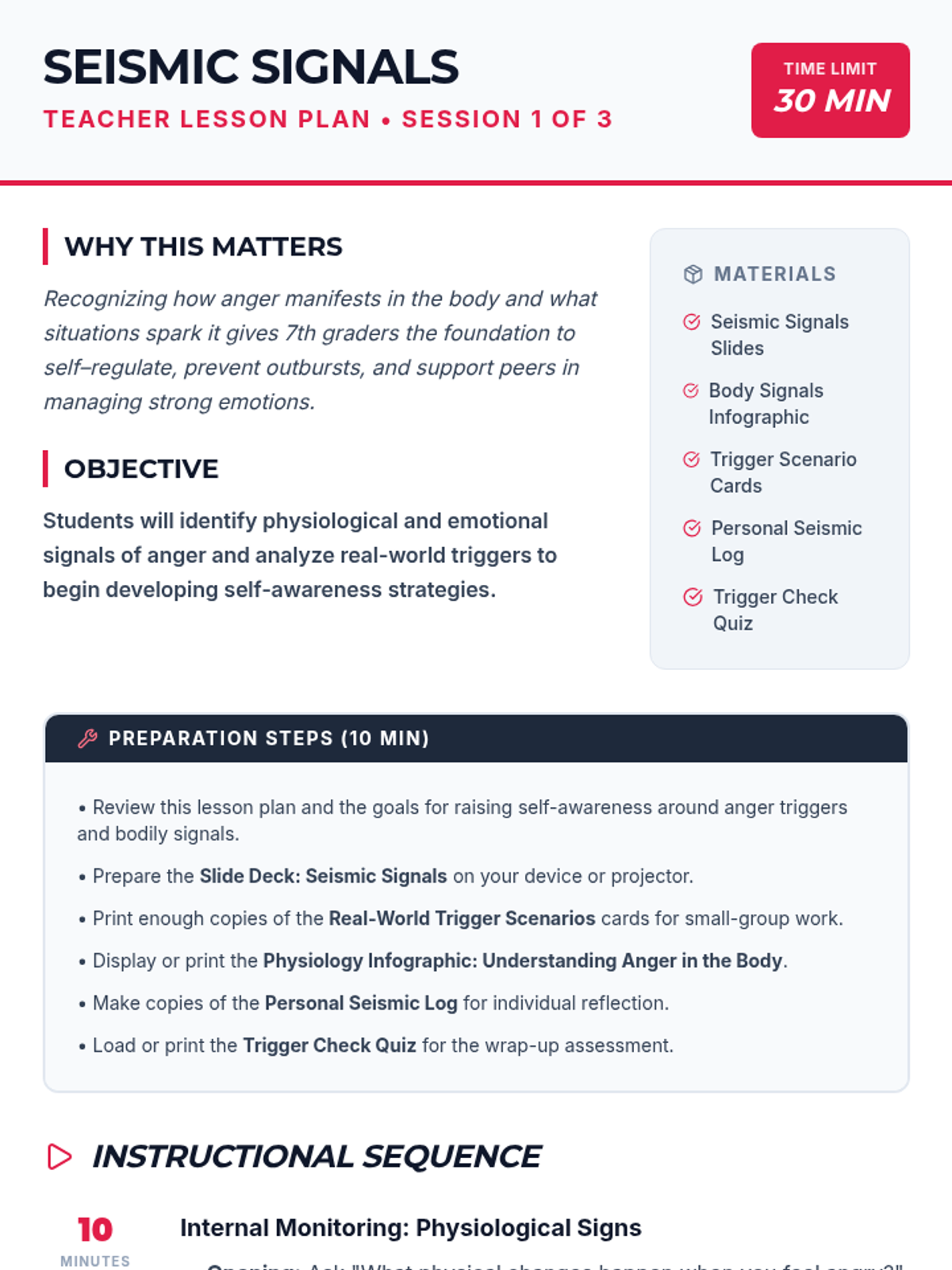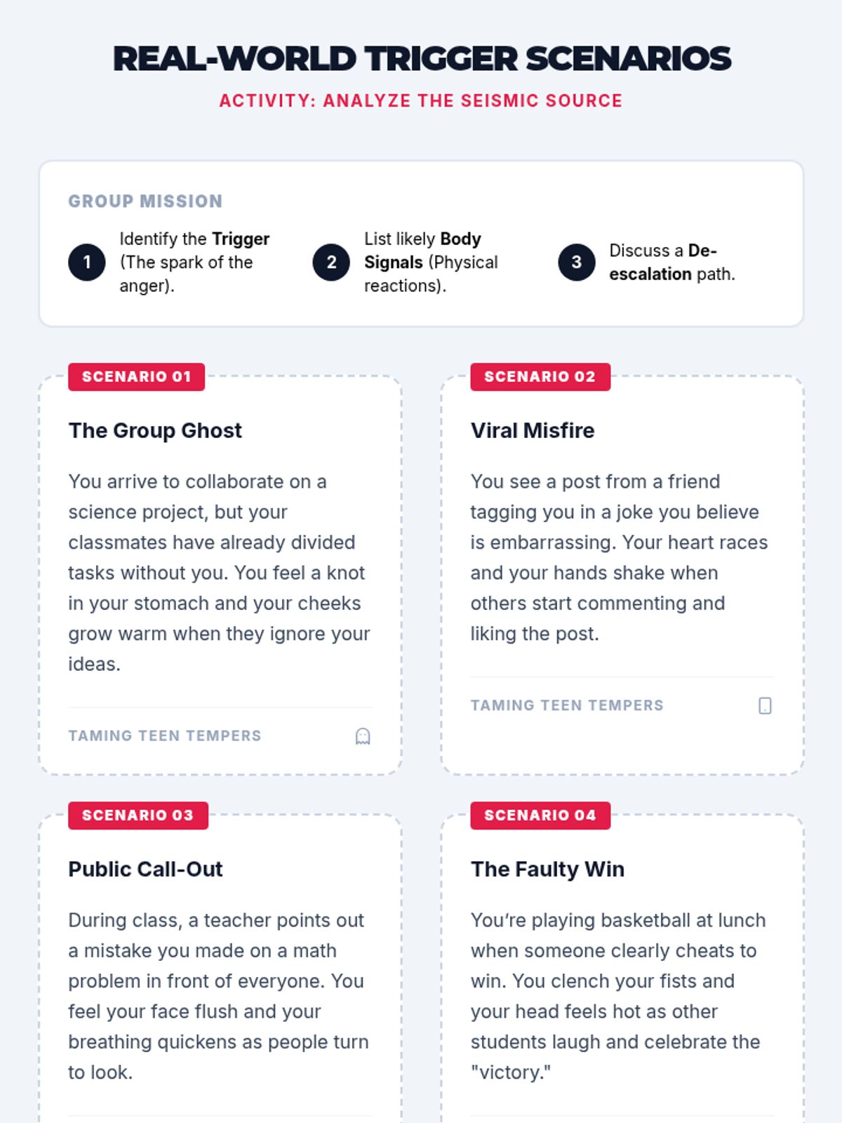 The first session of the Taming Teen Tempers series focuses on recognizing the physical warning signs of anger and identifying common social and environmental triggers for middle schoolers. Students will learn the science of the 'fight-or-flight' response and reflect on their own personal 'seismic signals.'