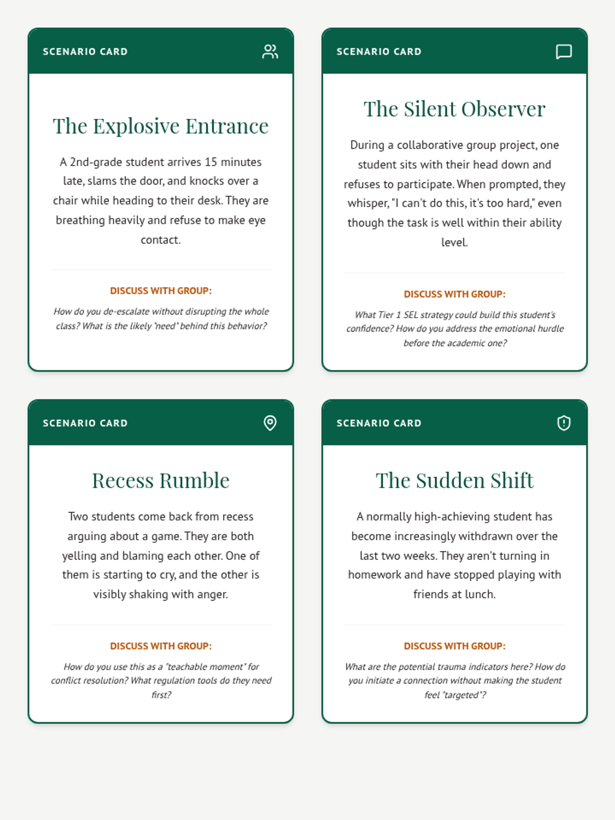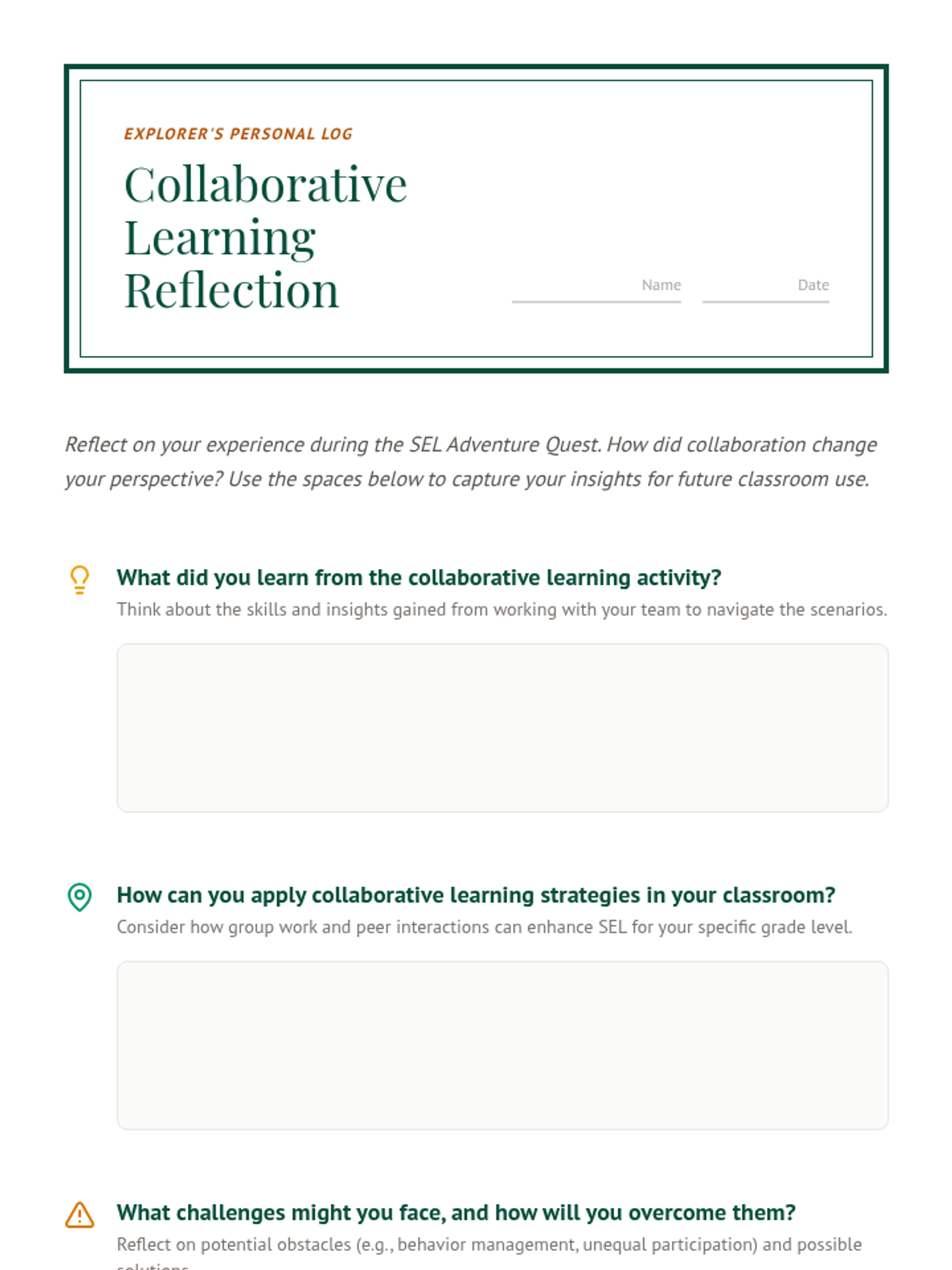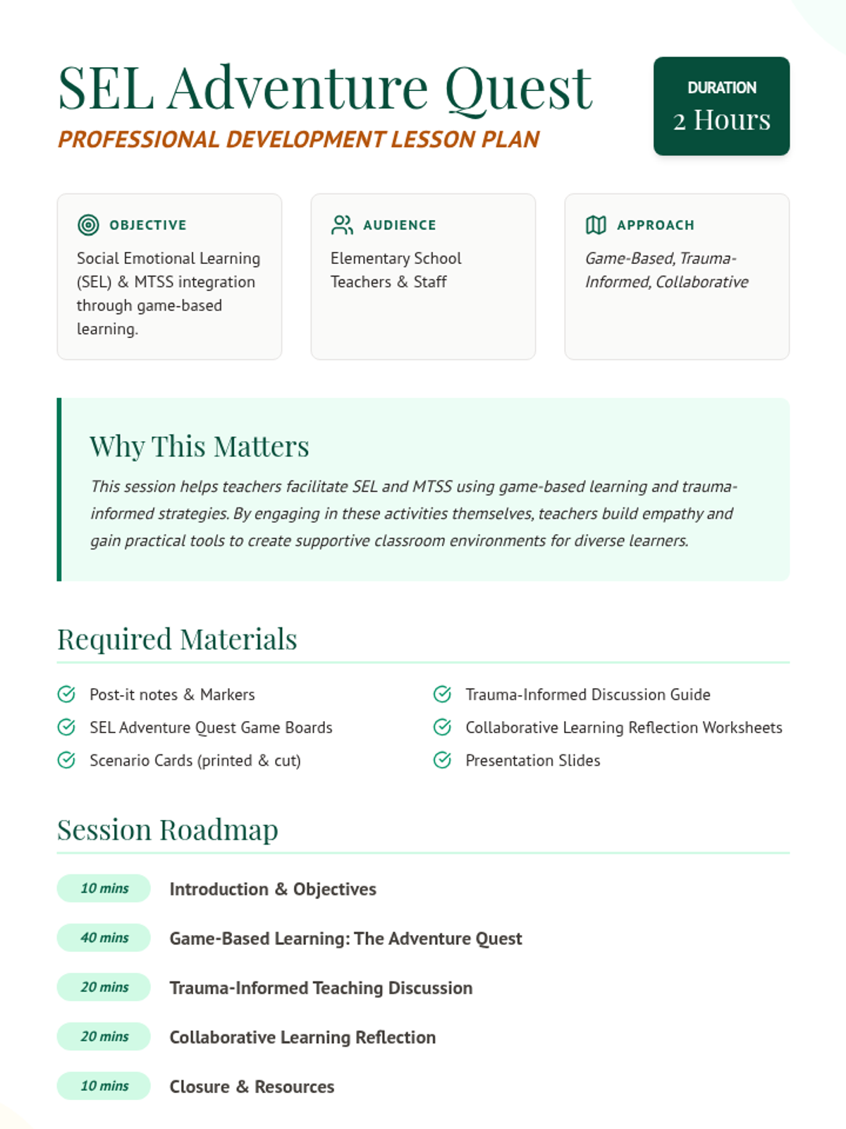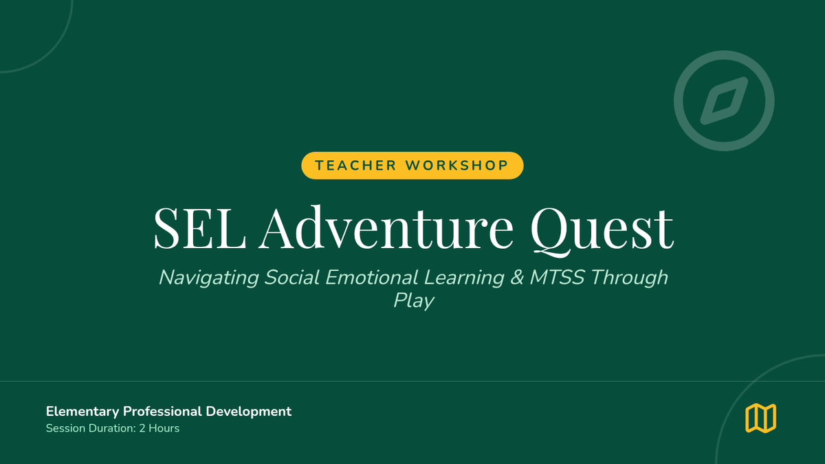 A professional development session for elementary teachers focused on SEL and MTSS using game-based learning and trauma-informed practices. Teachers navigate an "adventure quest" to build empathy, teamwork, and emotional regulation strategies.