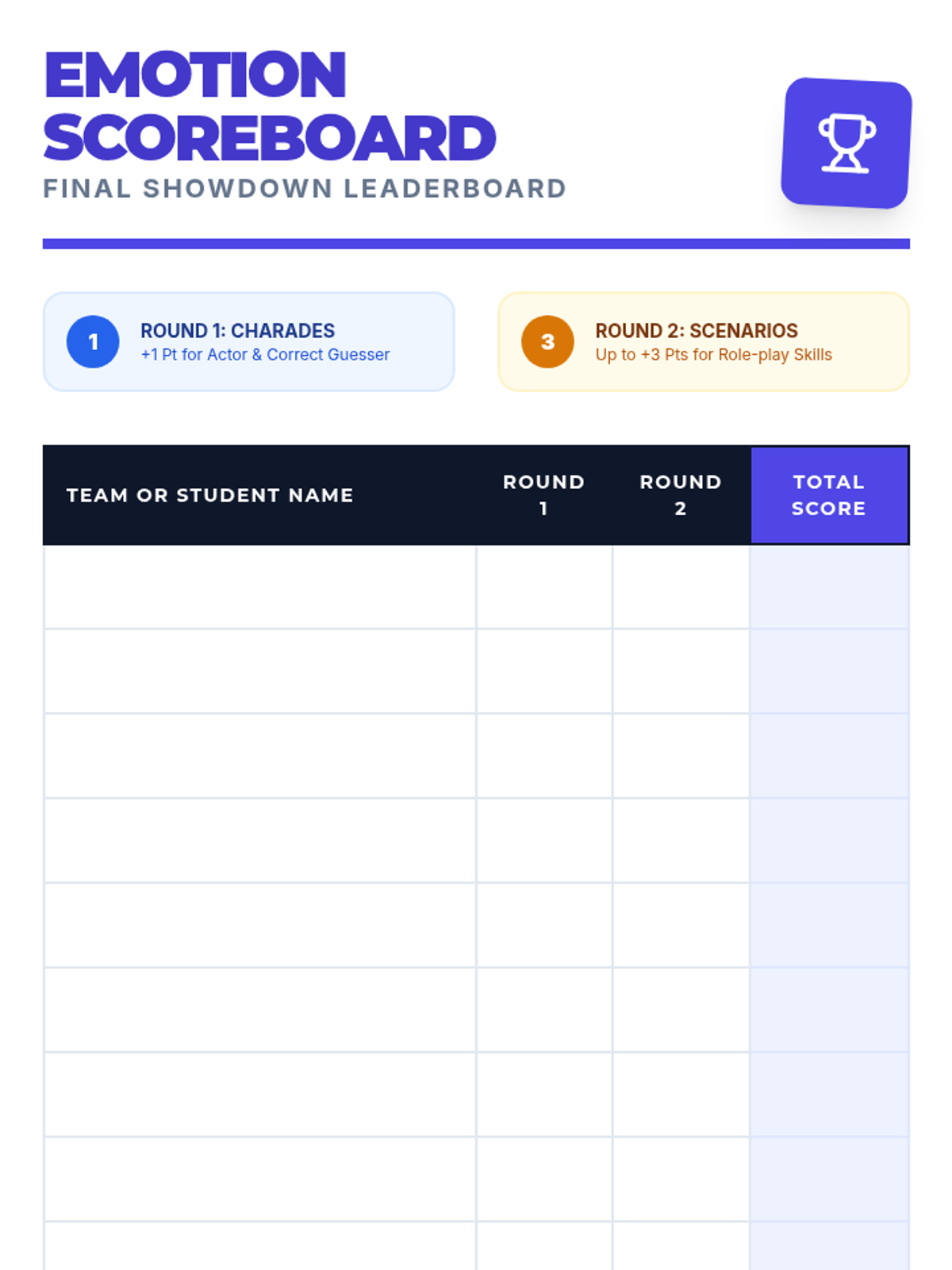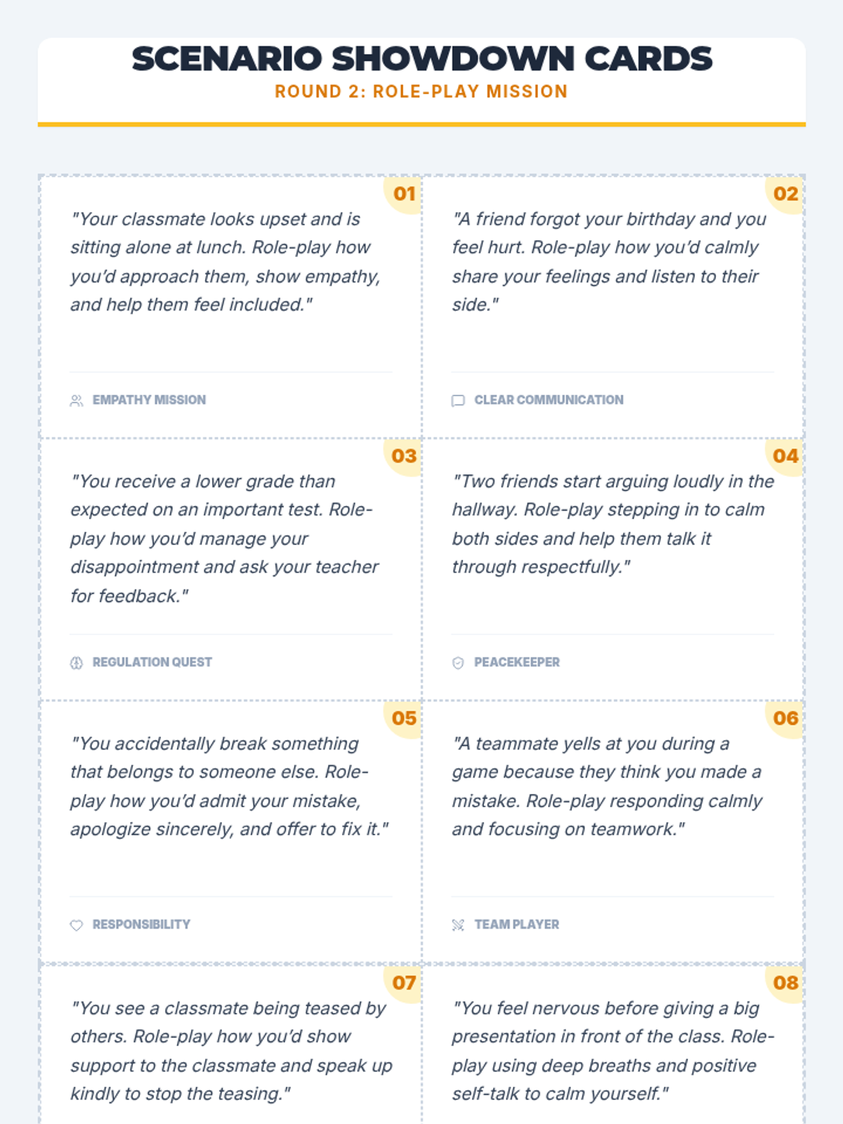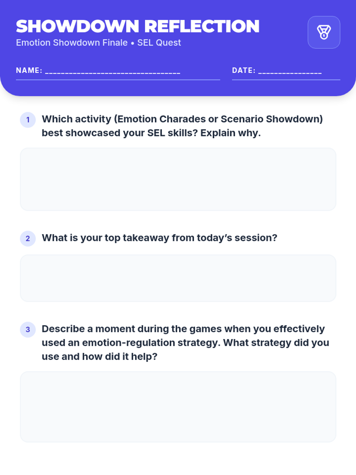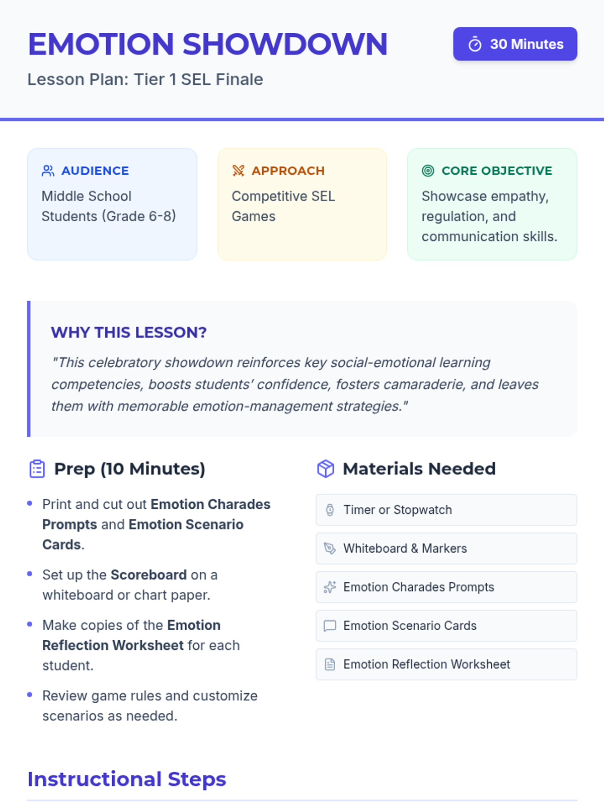 A 30-minute Tier 1 SEL finale where middle school students reflect on their growth through competitive games focused on empathy, emotion regulation, and communication.
