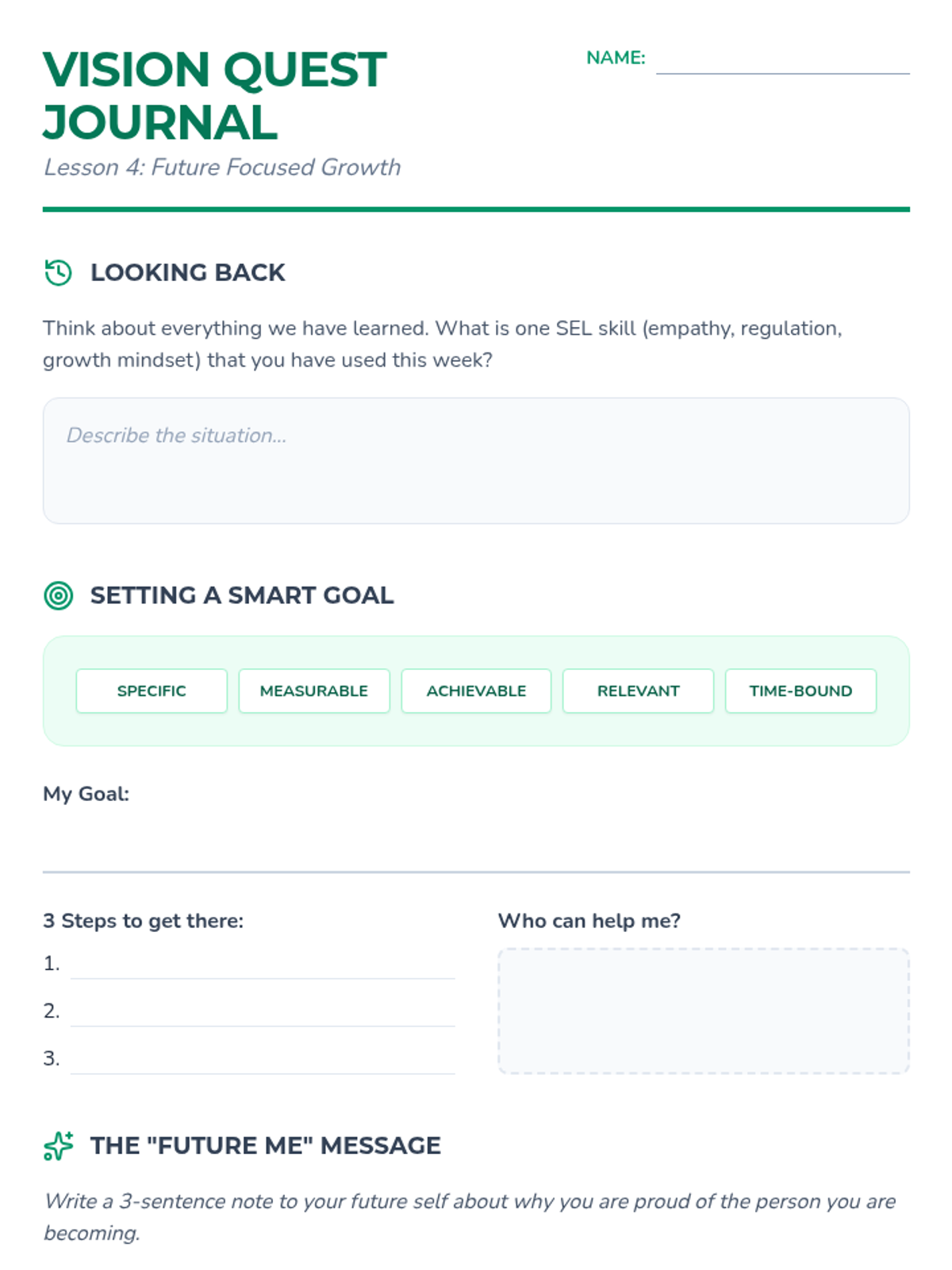 Students synthesize their learning to set meaningful goals and reflect on their personal growth journey.