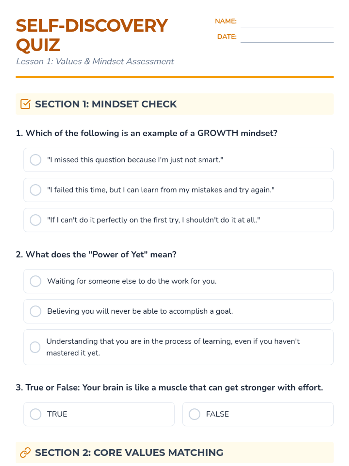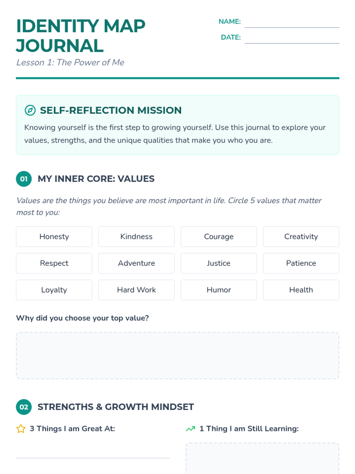 Students explore their personal values, identify their strengths, and develop a growth mindset to build a strong foundation for self-worth and resilience.