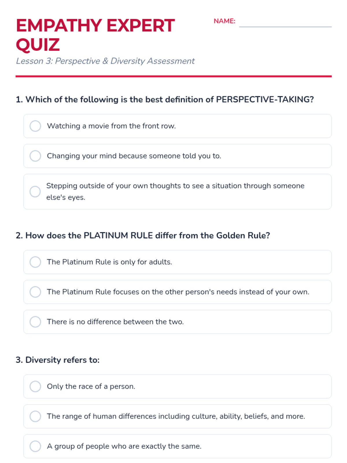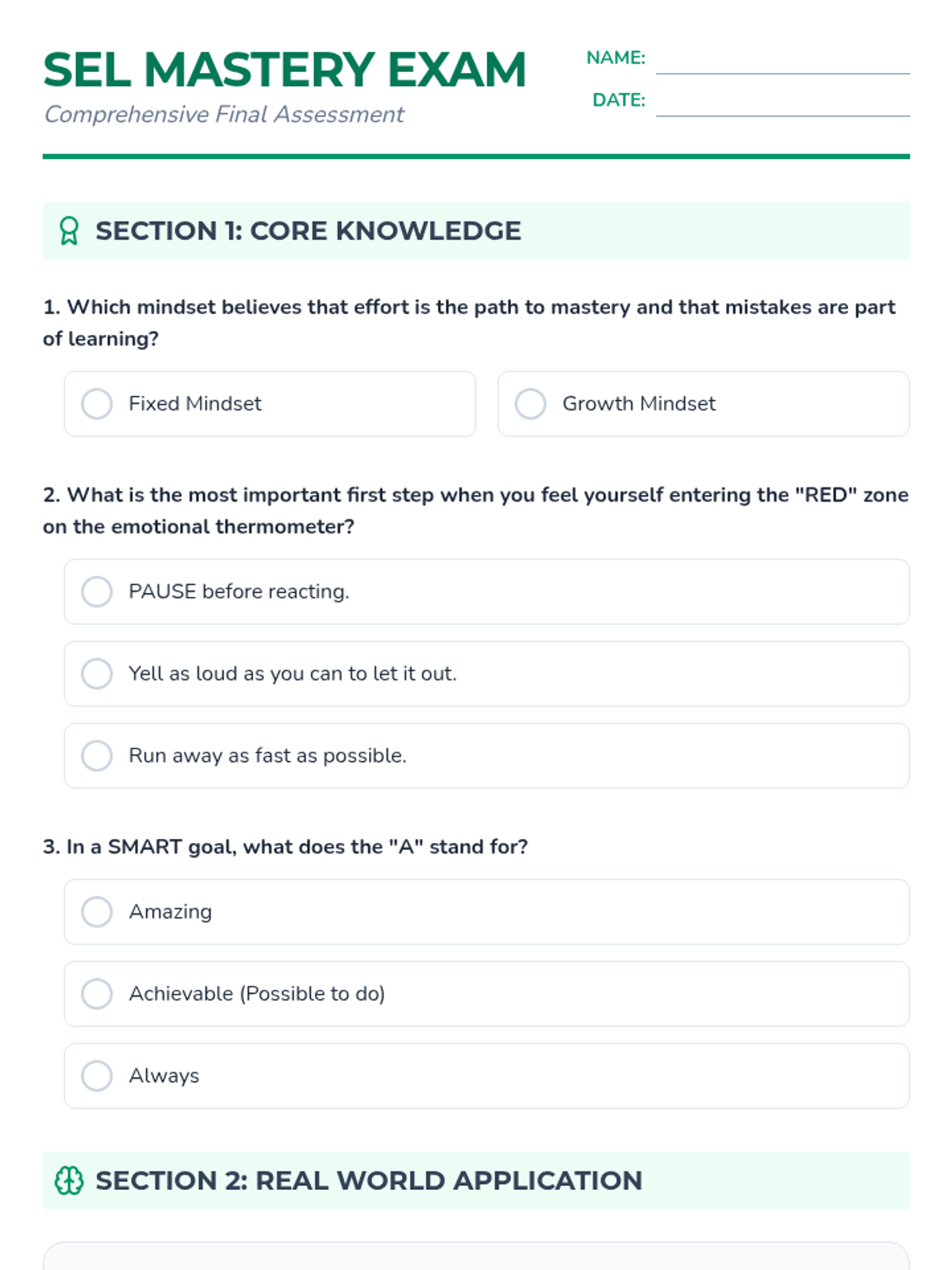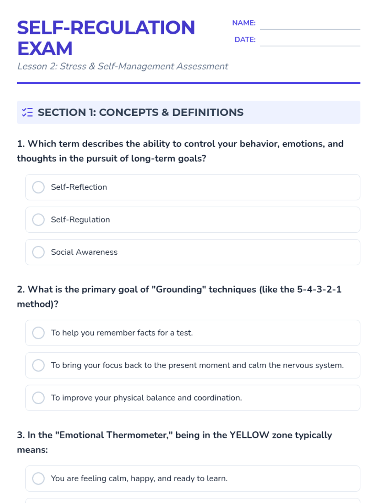 An assessment lesson designed to evaluate students' proficiency in core SEL competencies: self-awareness, self-management, and social awareness through diverse question types.