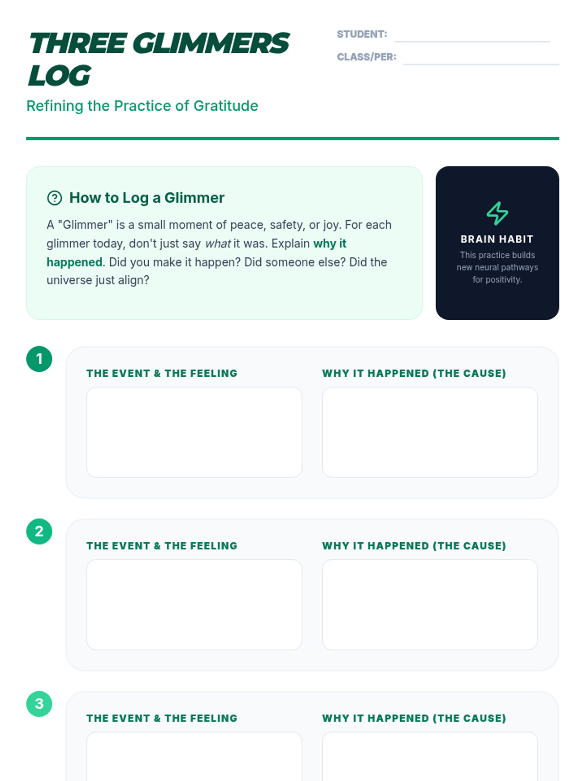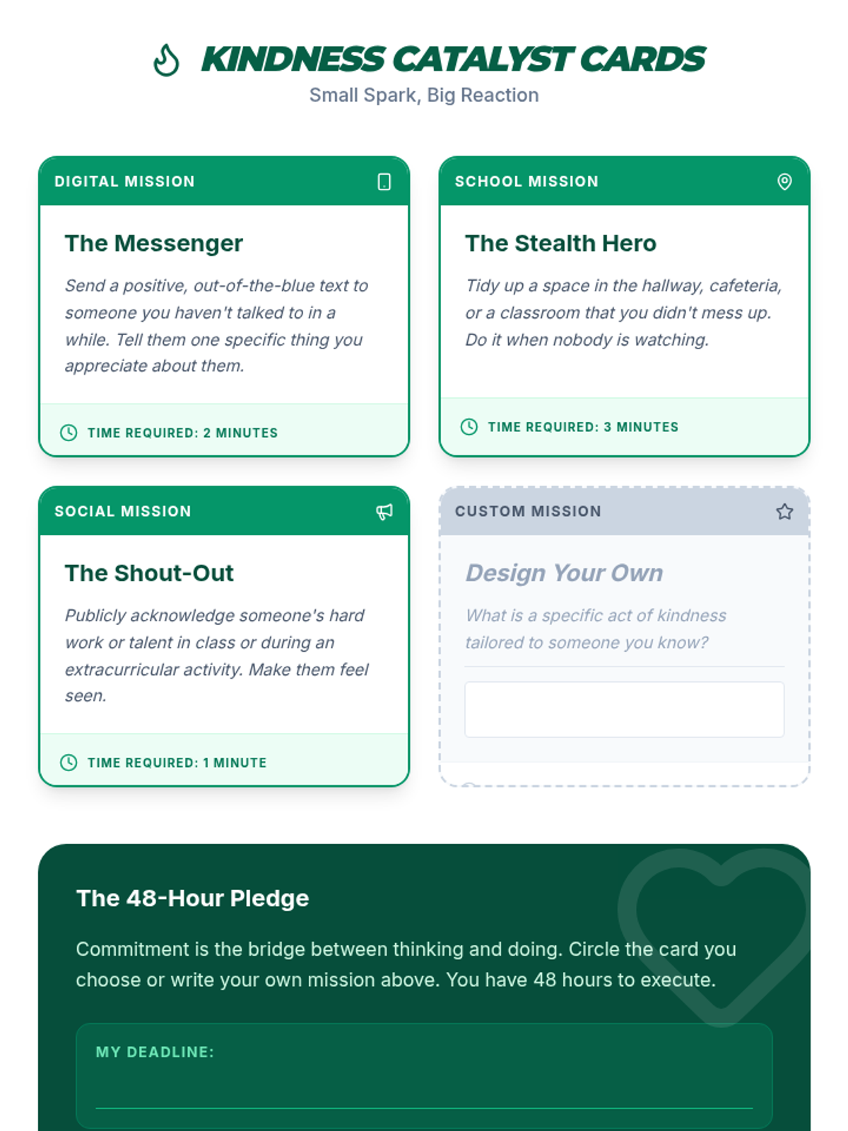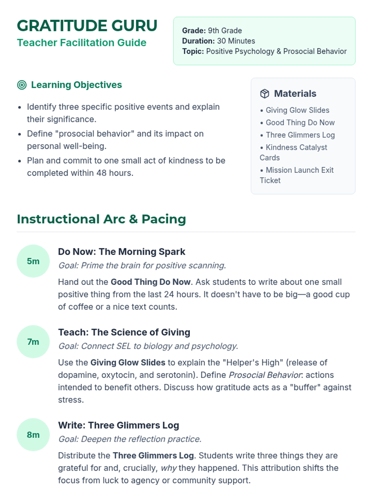 A 30-minute social-emotional learning lesson for 9th graders focused on the psychological benefits of gratitude and the 'helper's high' from prosocial behavior. Students reflect on positive experiences and commit to a specific, small act of kindness.