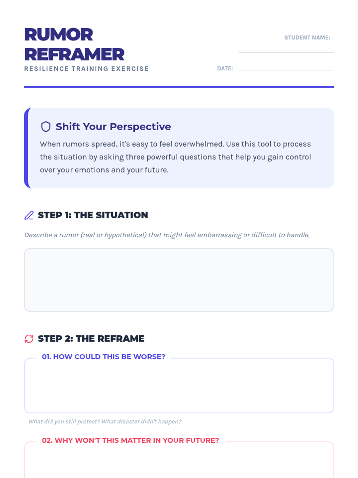 A lesson designed to help middle school students develop emotional resilience when facing rumors and gossip through perspective-shifting exercises and practical reframing techniques.