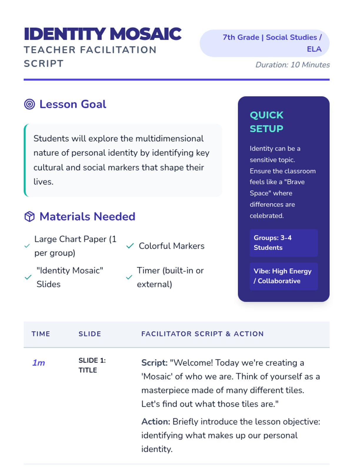 A fast-paced, high-energy 10-minute exploration of personal identity. Students define identity through seven key lenses and collaborate on a group 'Identity Mosaic' poster to visualize their shared and unique traits.