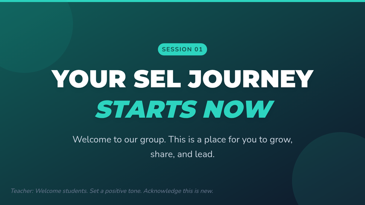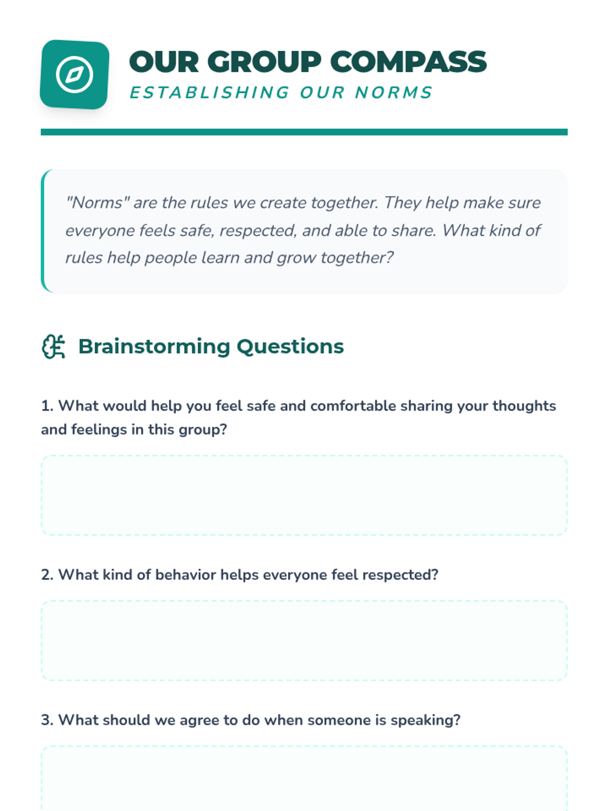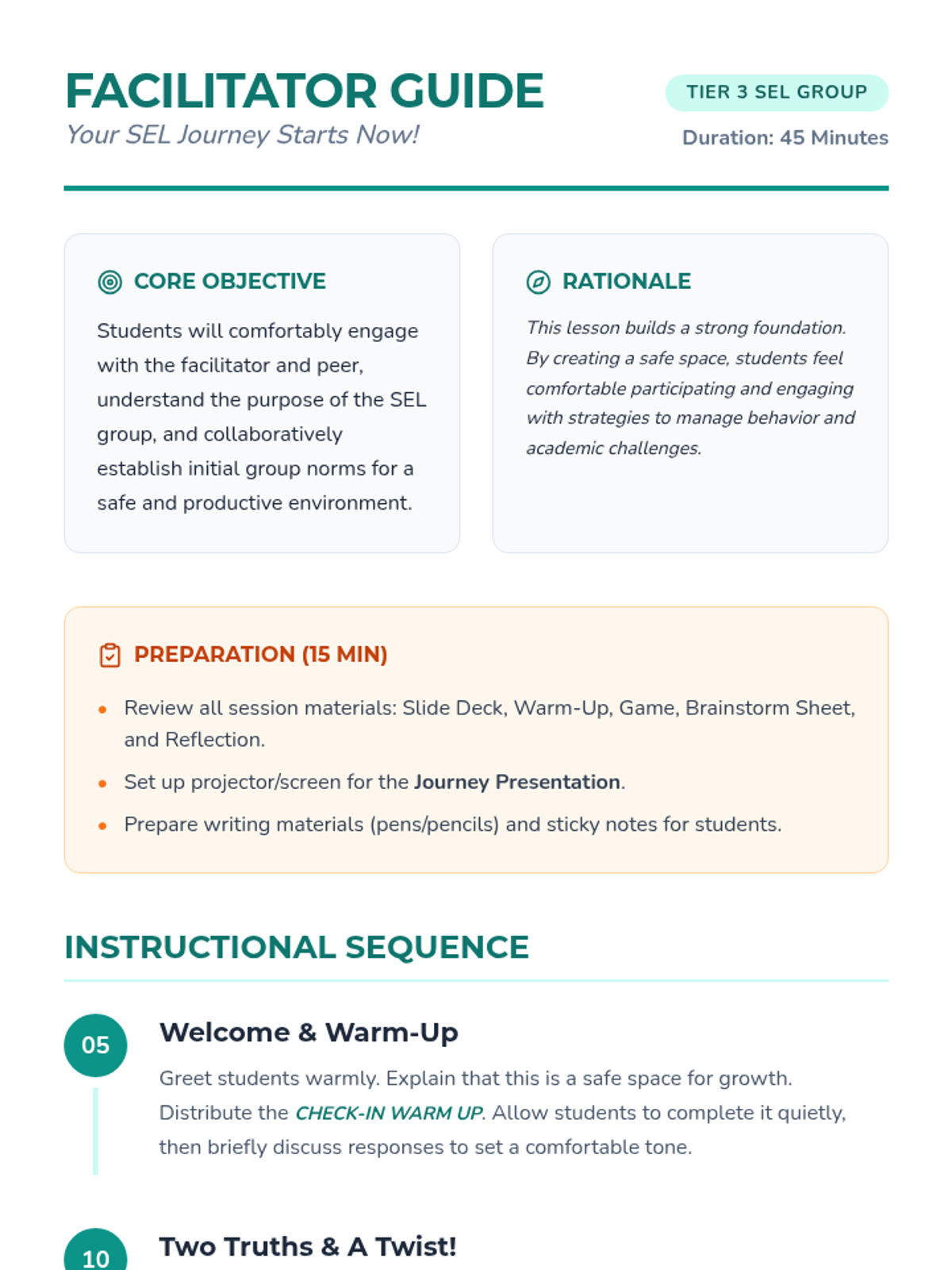 This introductory lesson for 8th-grade Tier 3 SEL groups focuses on rapport-building, establishing group norms, and introducing the core purpose of Social-Emotional Learning through interactive discussion and collaborative goal-setting.