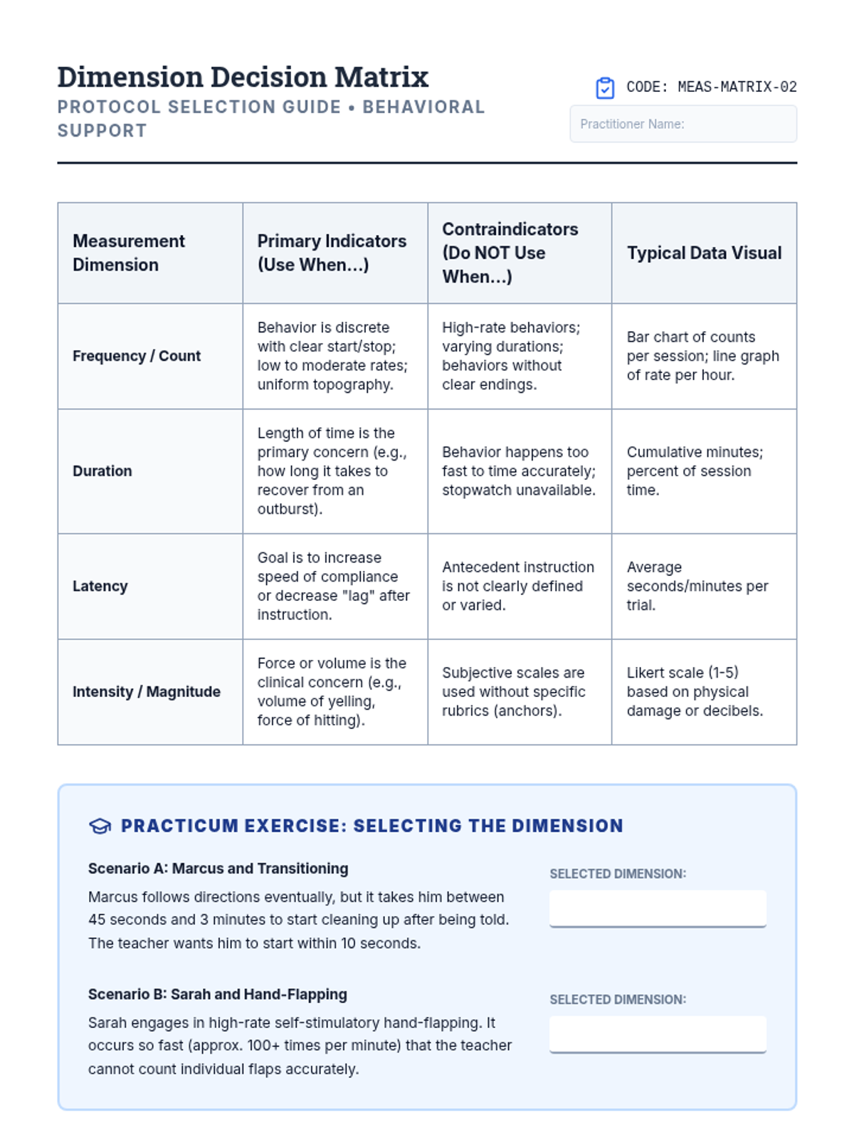This lesson analyzes when to use frequency, duration, latency, or interval recording based on the behavior's topography and clinical significance.