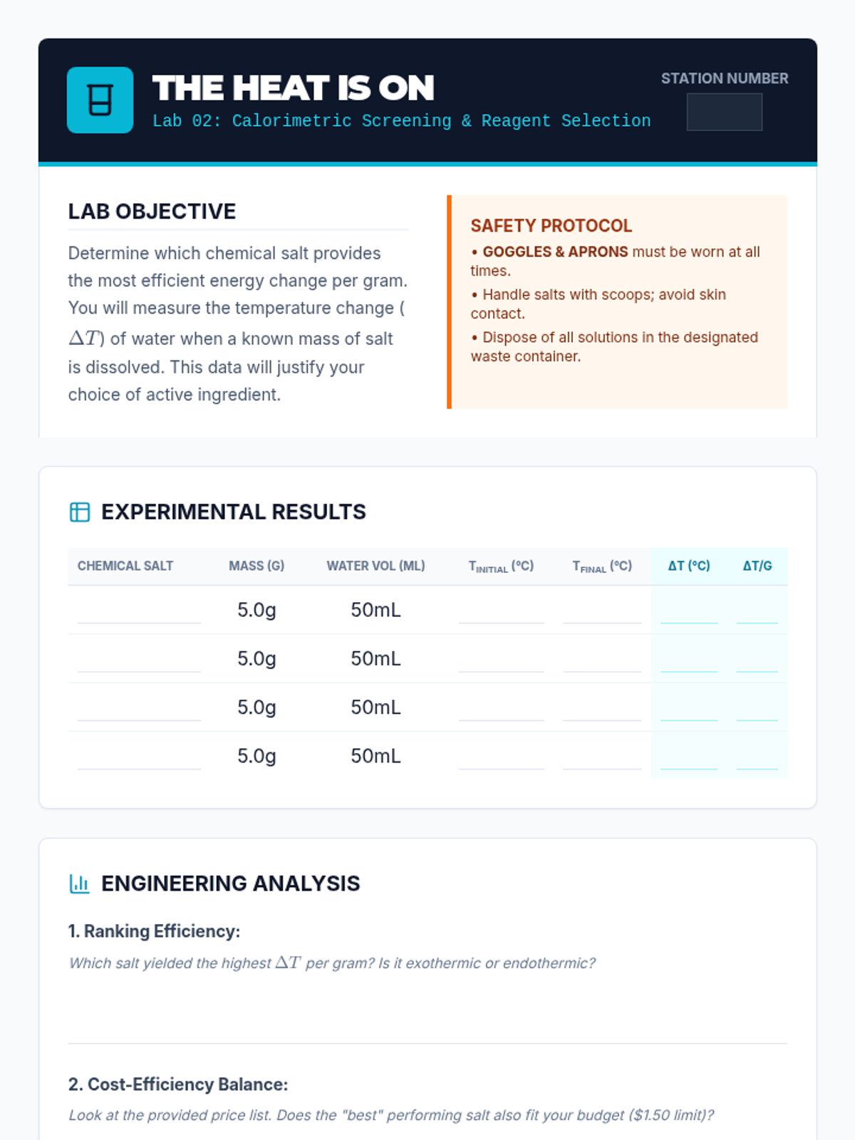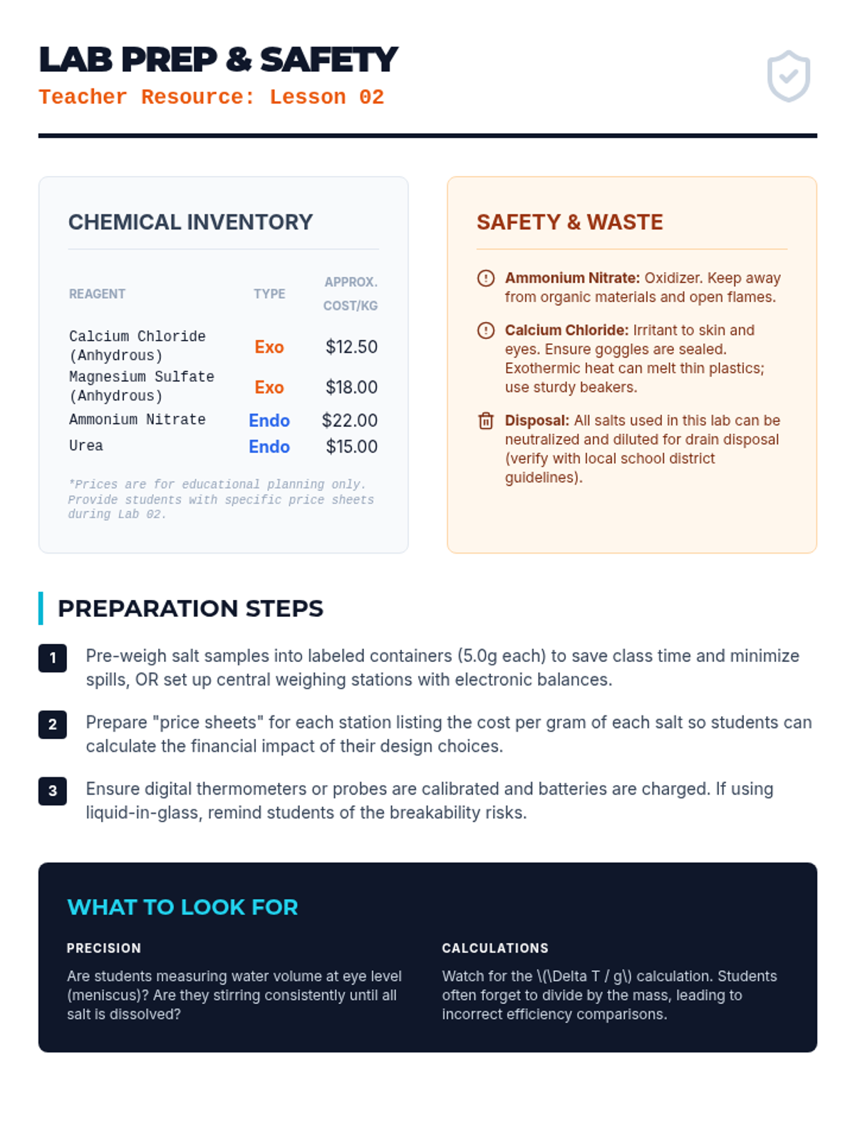 Teams conduct small-scale calorimetry tests on various salts to determine their efficiency and cost-effectiveness for heating or cooling.