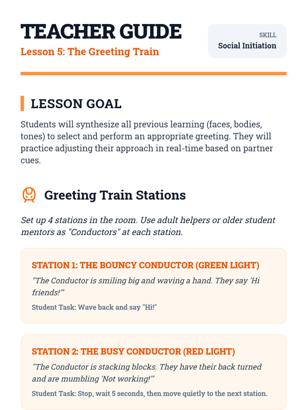 A comprehensive lesson on navigating classroom and school-wide transitions using visual supports. Students learn to recognize and follow visual cues to move smoothly between activities and locations.