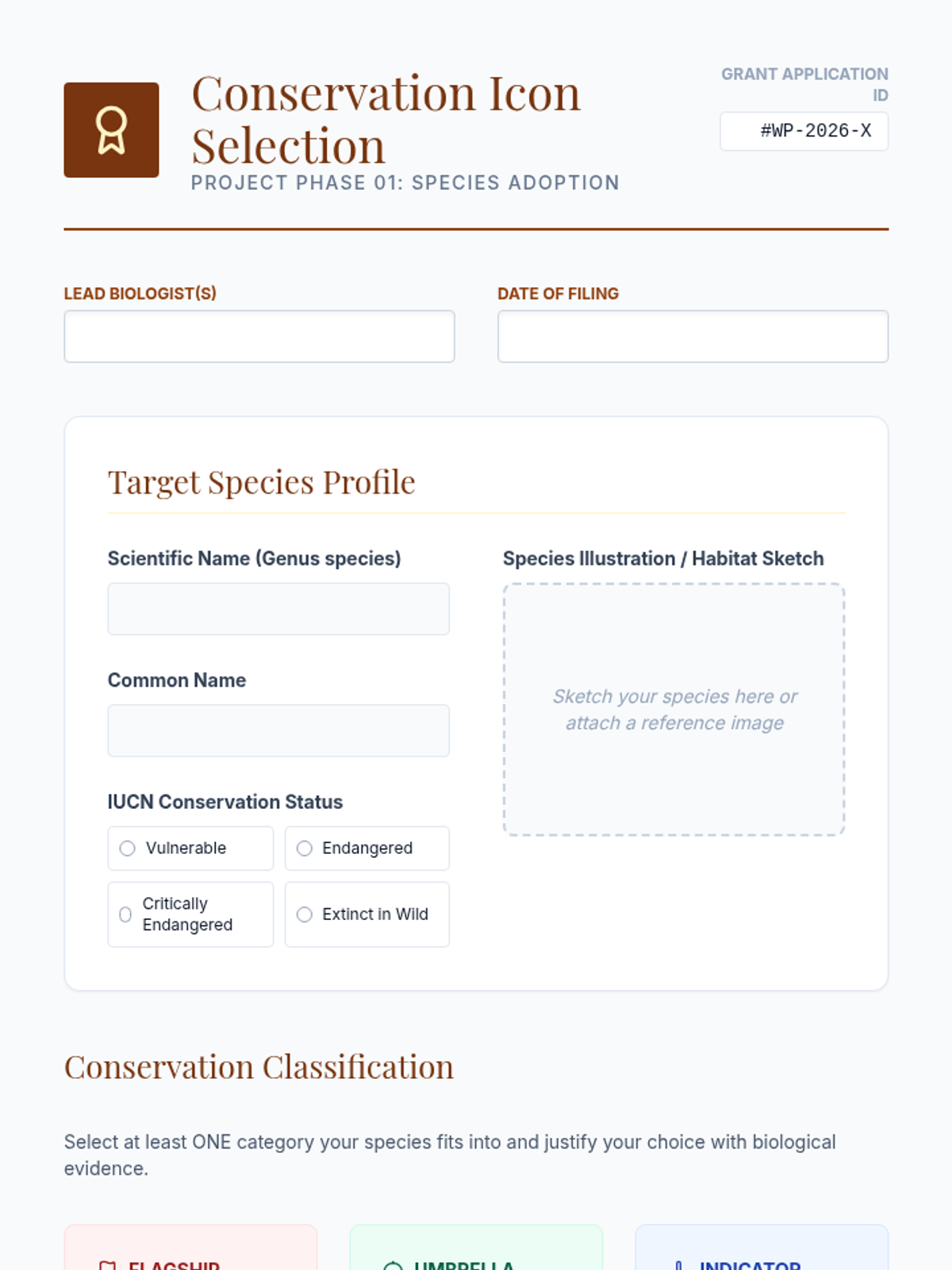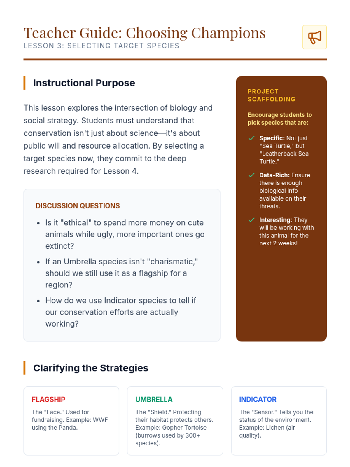 Students differentiate between flagship, umbrella, and indicator species to select a target animal for their conservation project.