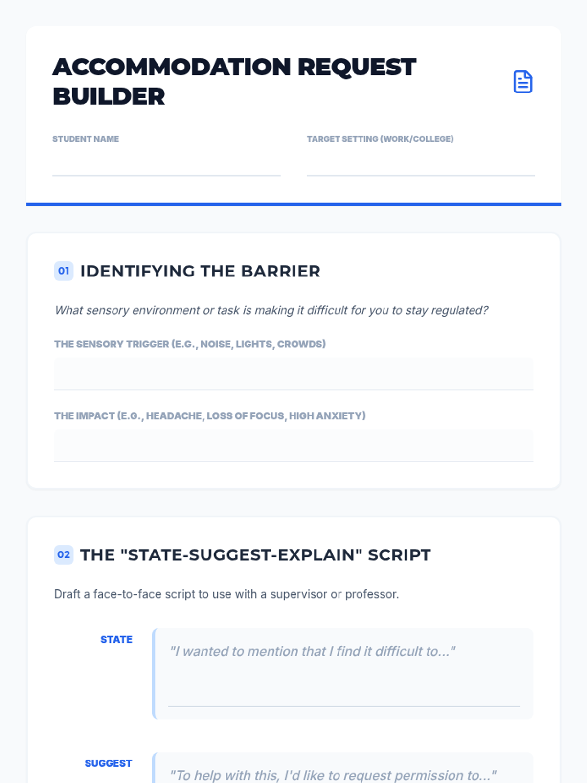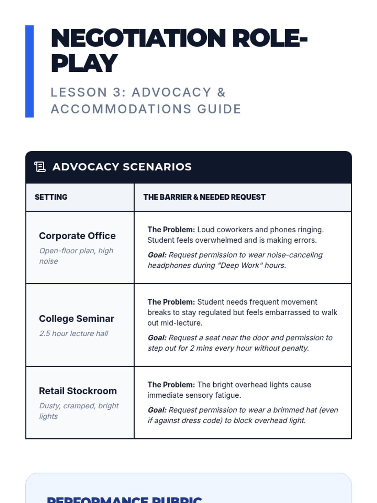 Students learn about ADA rights and practice communicating their sensory needs professionally through email and role-play.