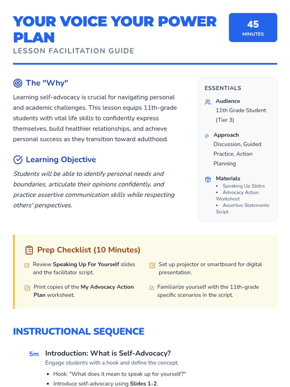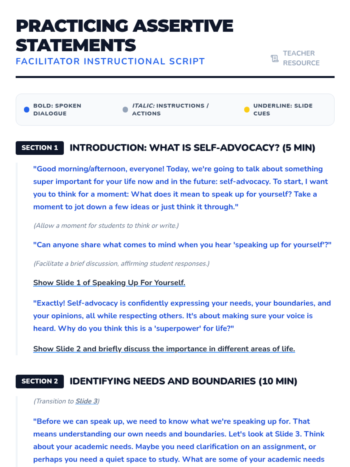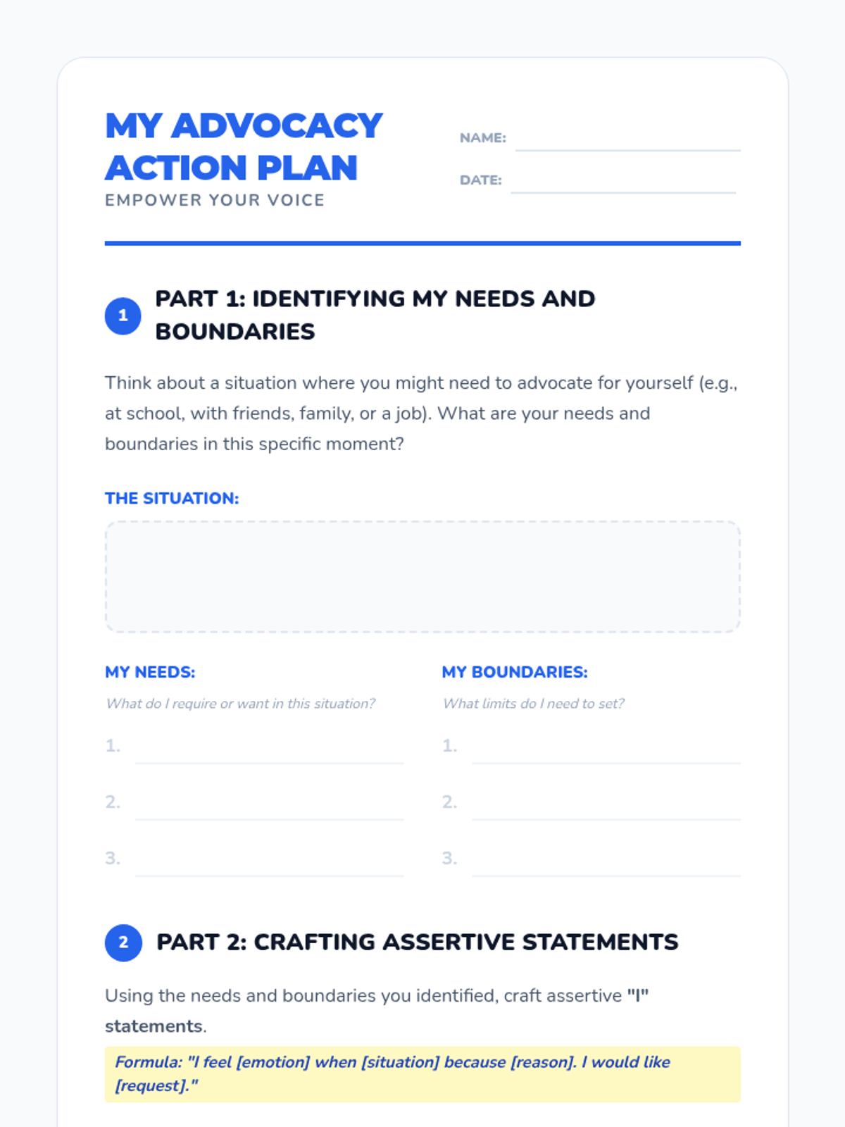 This lesson empowers individual students to confidently express their needs, boundaries, and opinions while respecting others. Learning self-advocacy is a vital life skill for personal success and navigating challenges in the 11th grade and beyond.