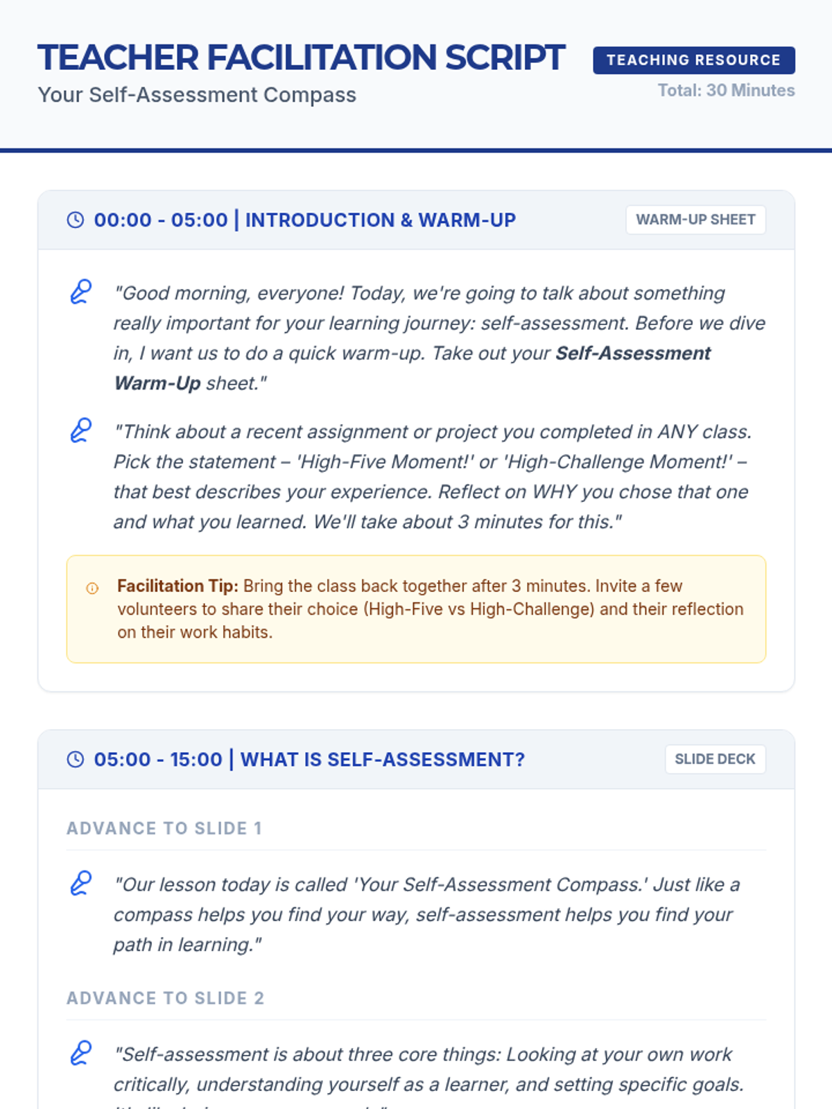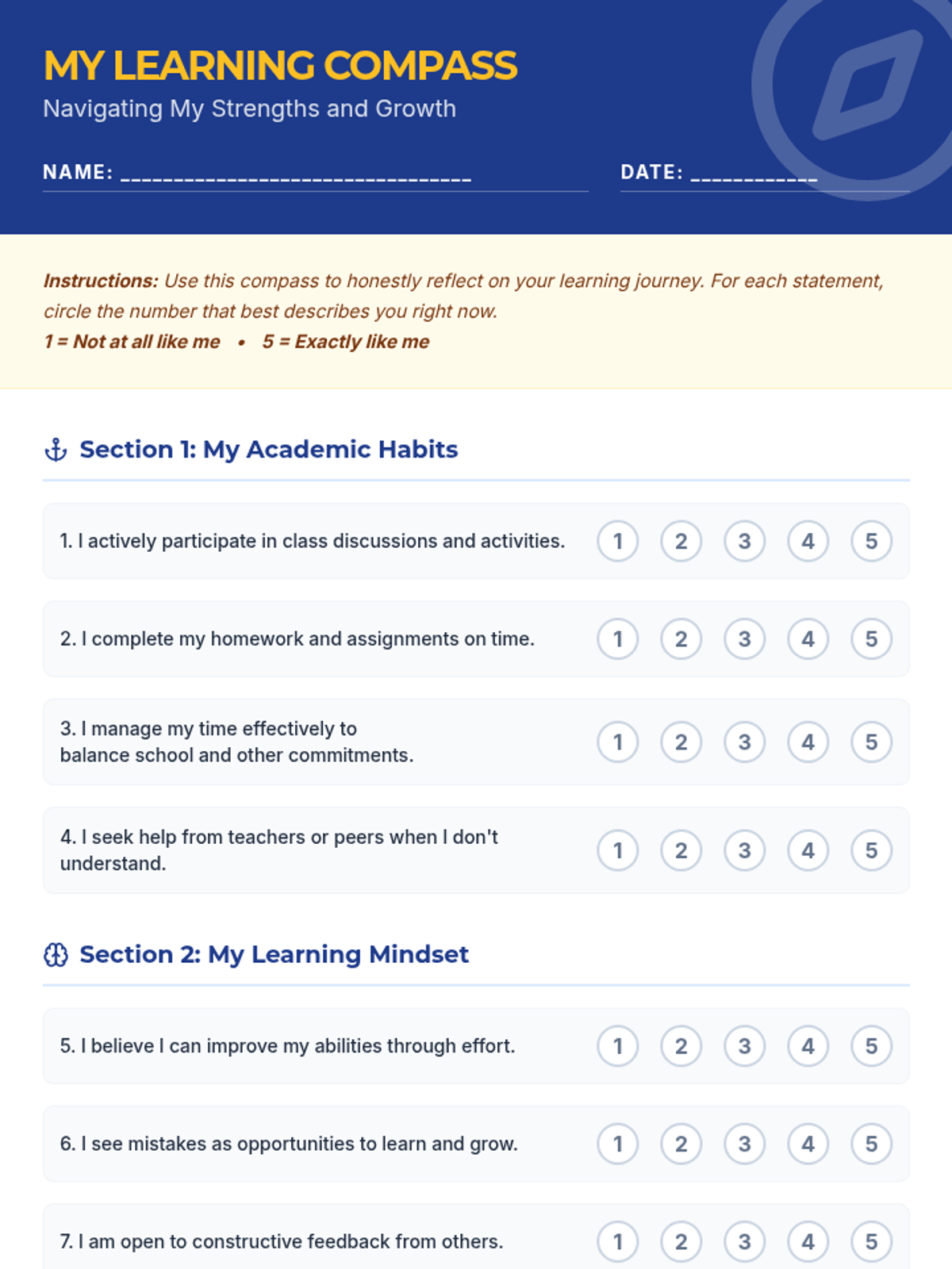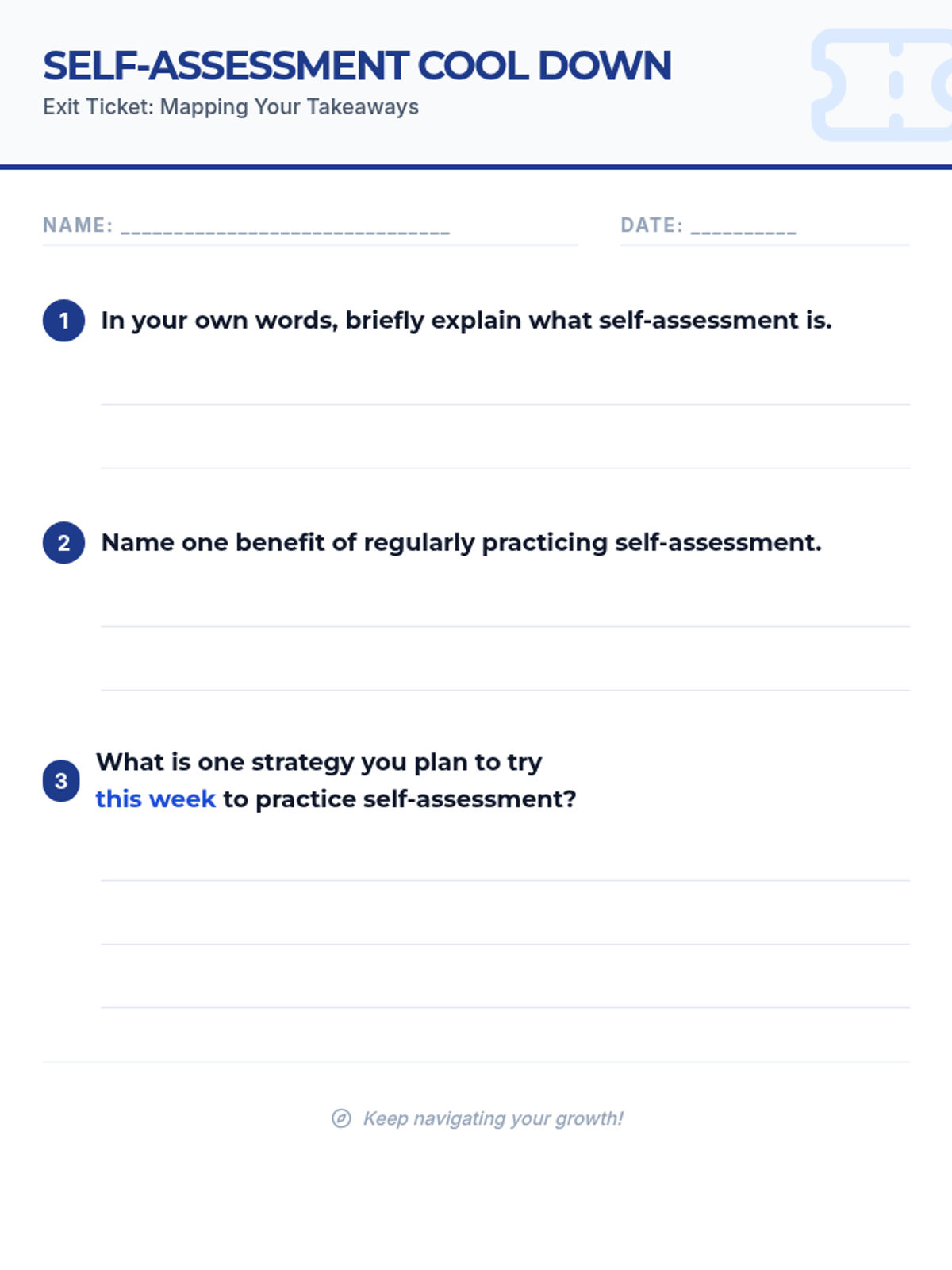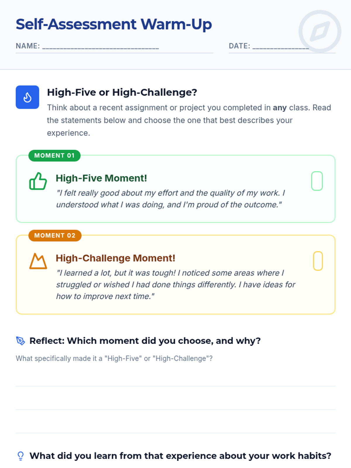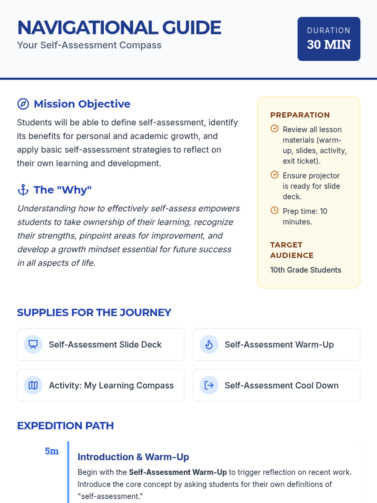 A 30-minute introductory lesson for 10th-grade students on the power of self-assessment, using a navigation theme to help students map their strengths and growth areas.