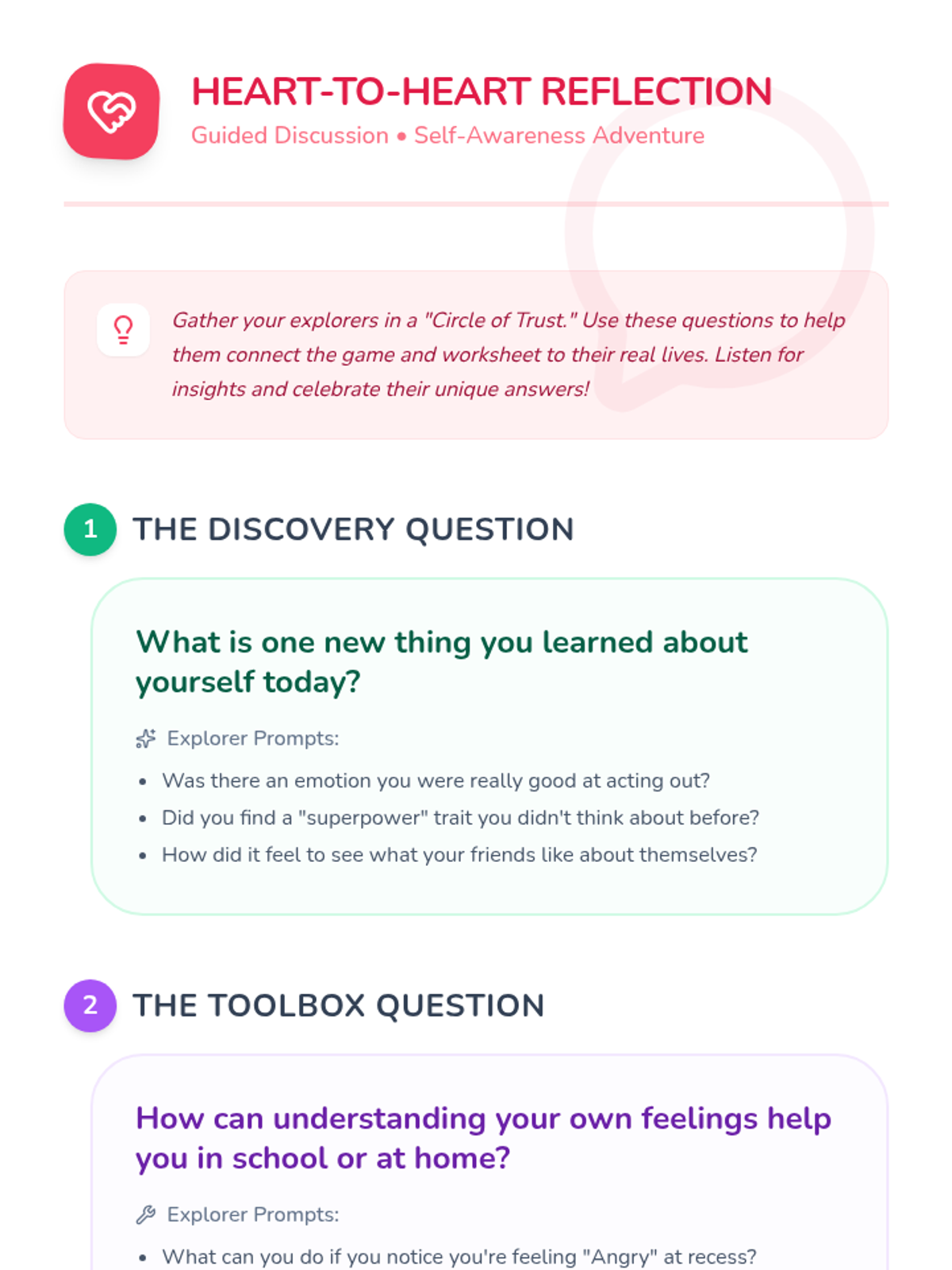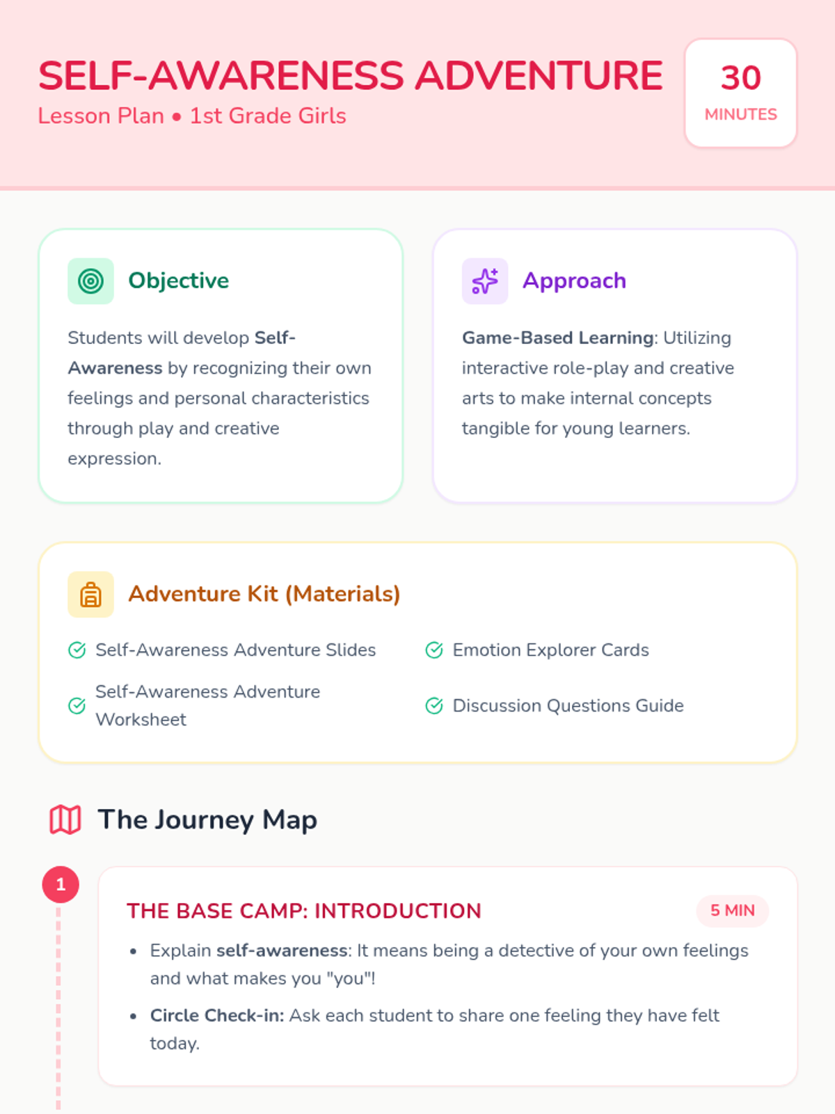 A 1st grade lesson focused on recognizing emotions and personal traits through interactive games and creative expression, fostering emotional intelligence in a small group setting.