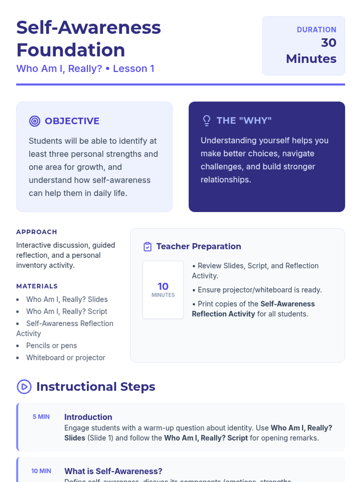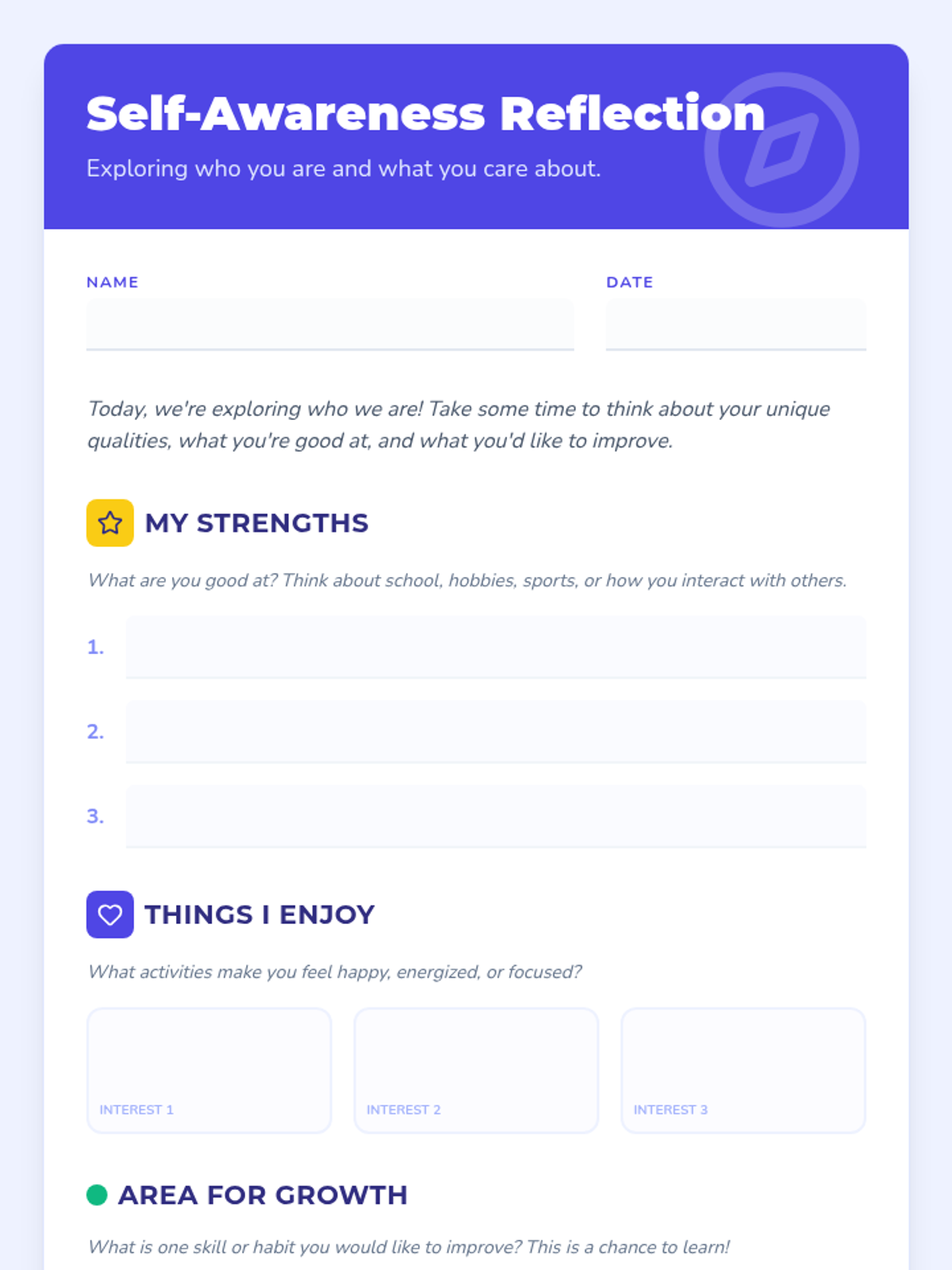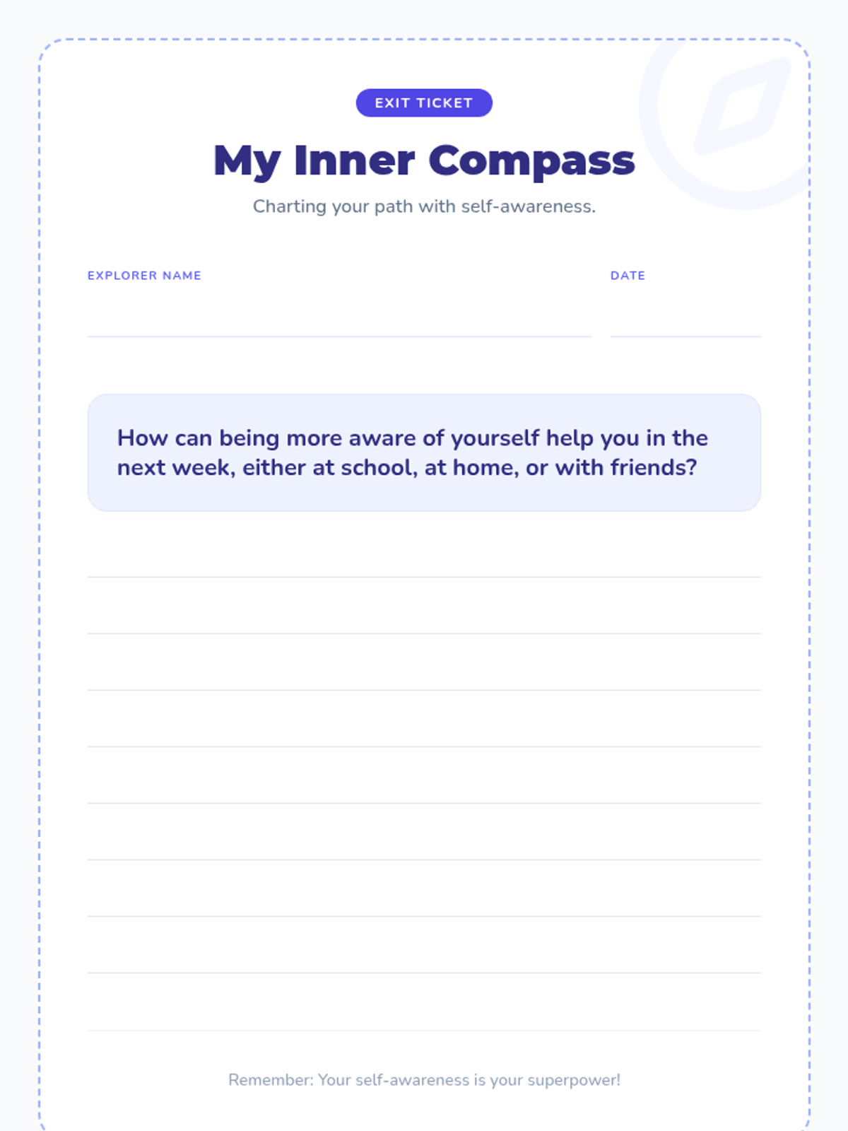 Students define self-awareness, identify personal strengths and areas for growth, and understand why self-knowledge is a "superpower."
