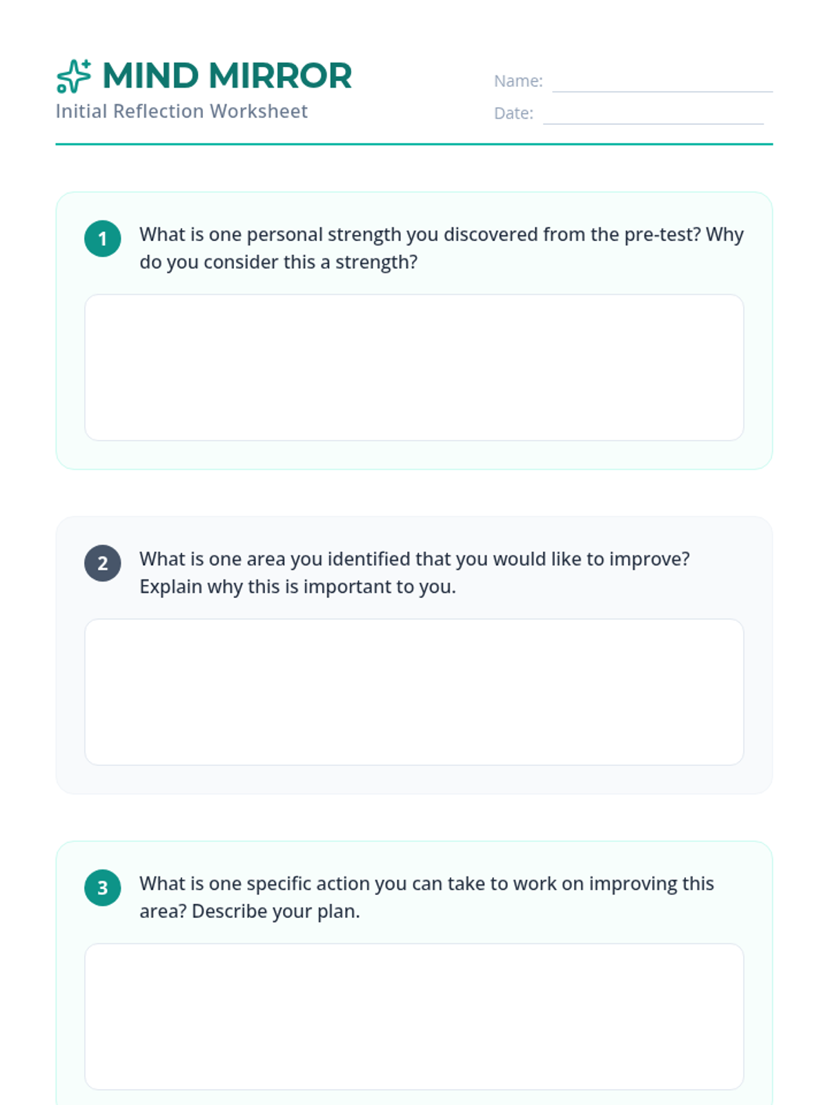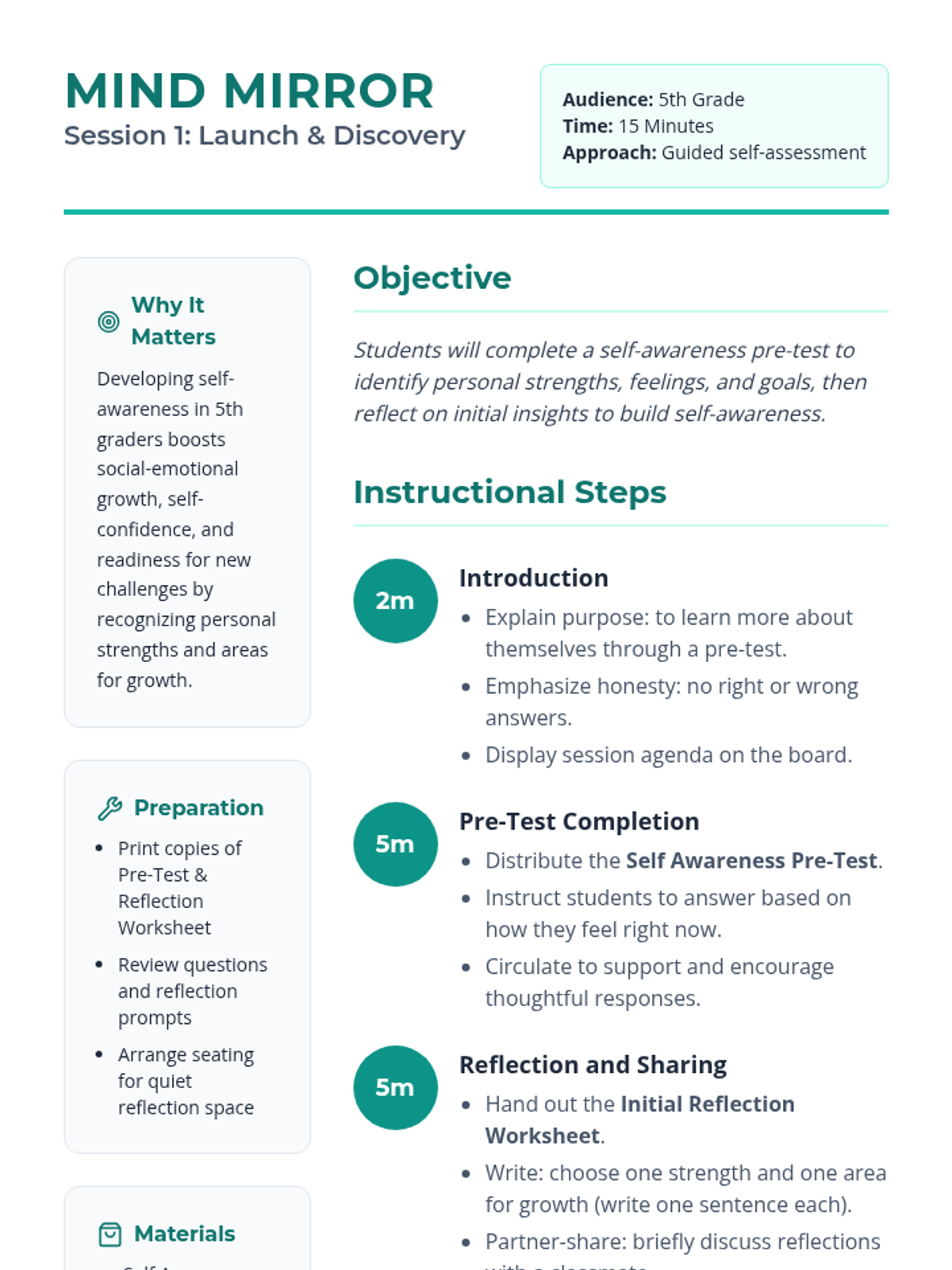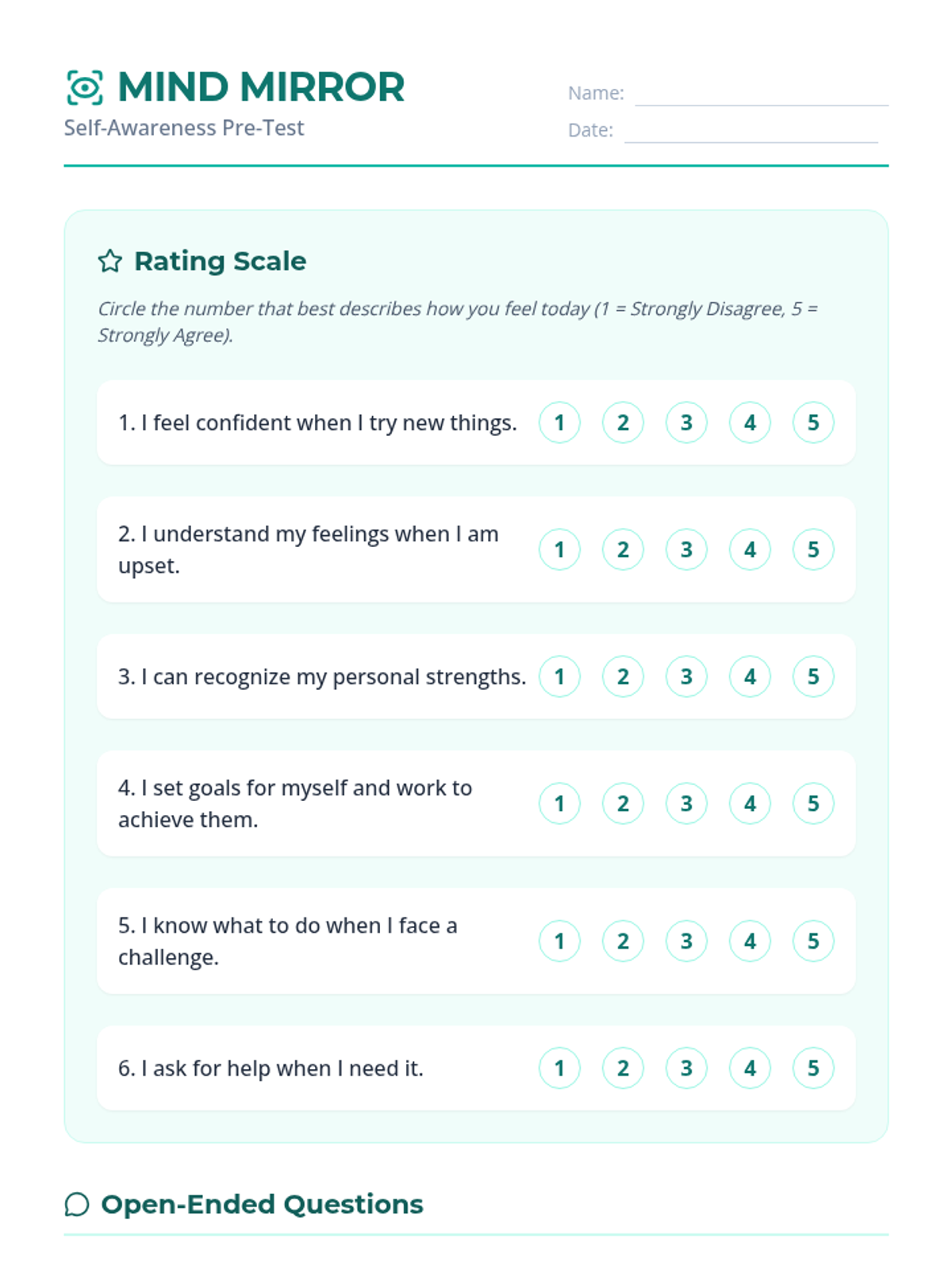 In this session, 5th graders complete a self-awareness pre-test to identify personal strengths, feelings, and goals, followed by a reflection activity to build self-confidence and clarity.