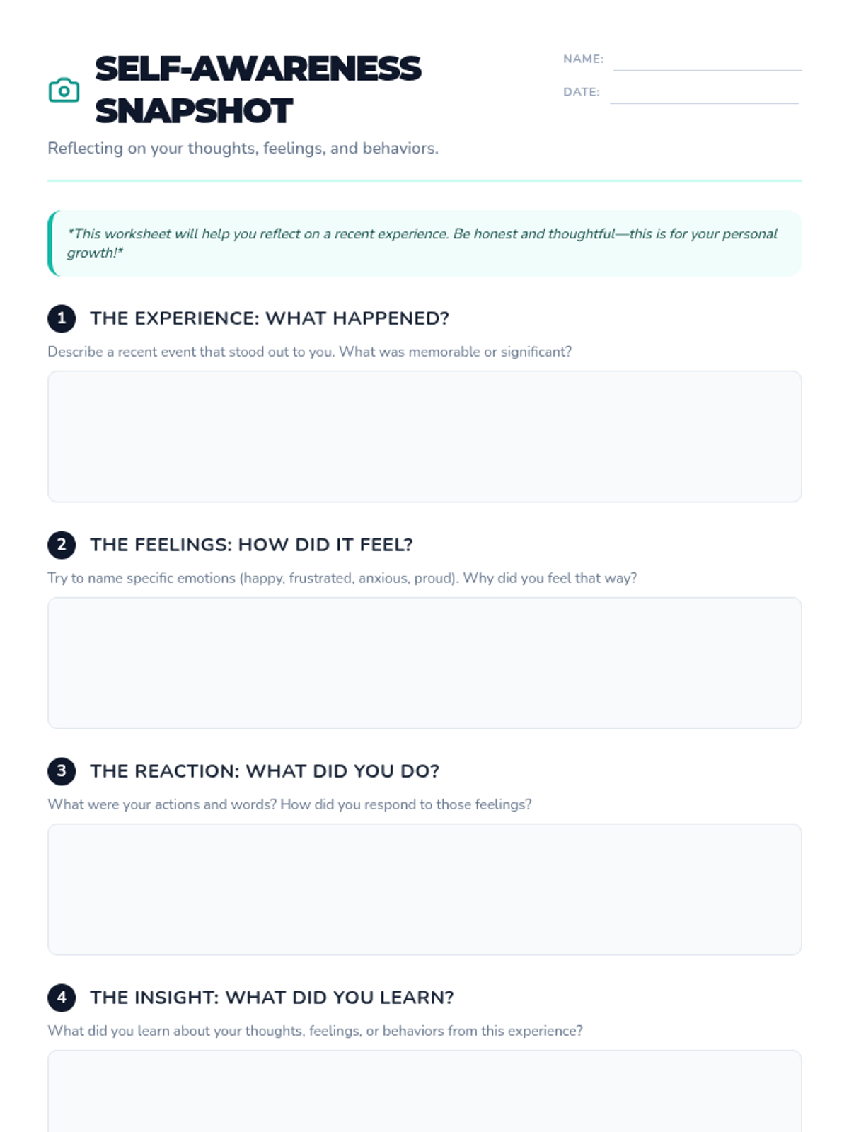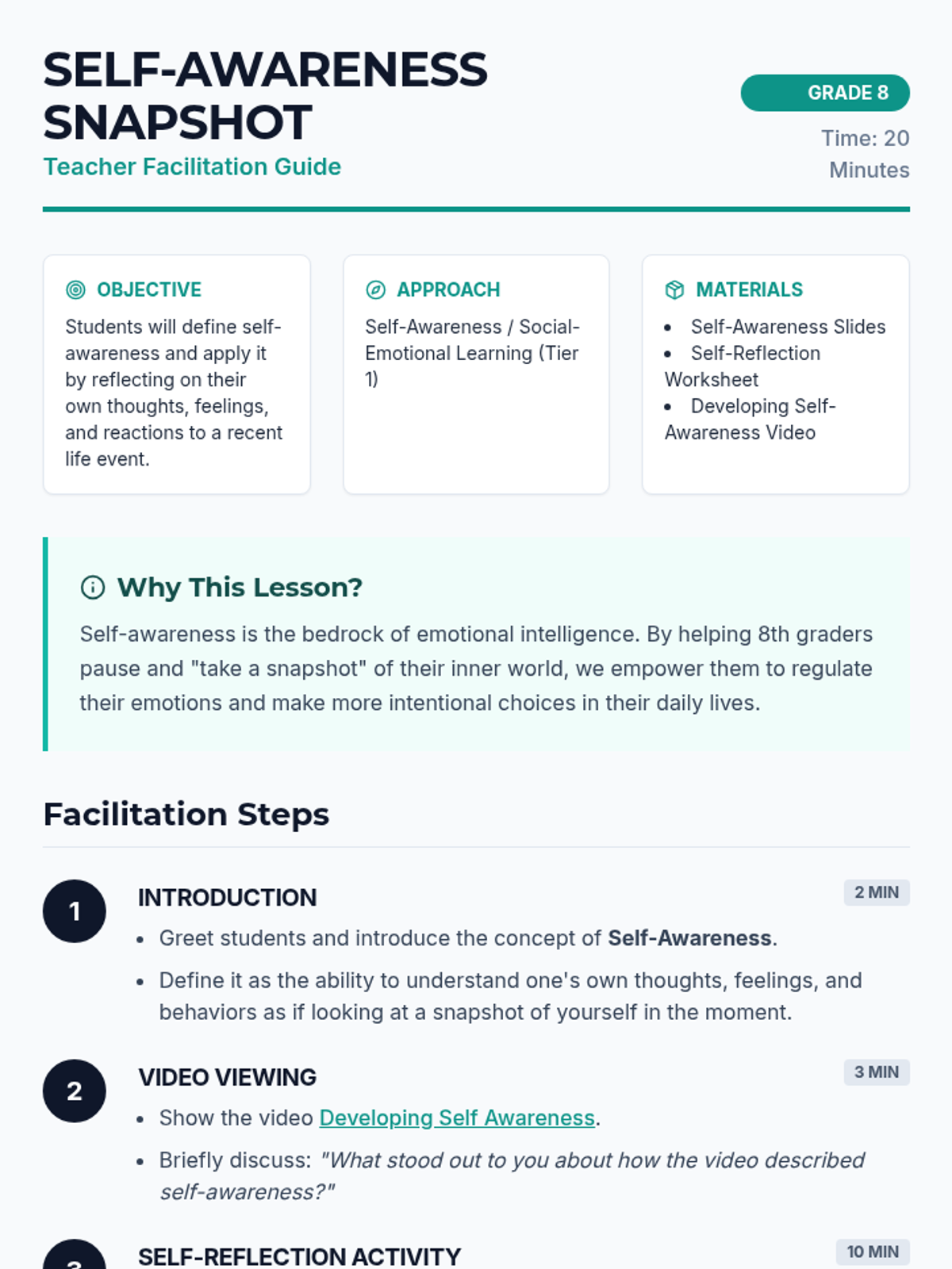 A 20-minute introductory lesson for 8th graders to explore self-awareness through video observation and personal reflection using a 'snapshot' metaphor.