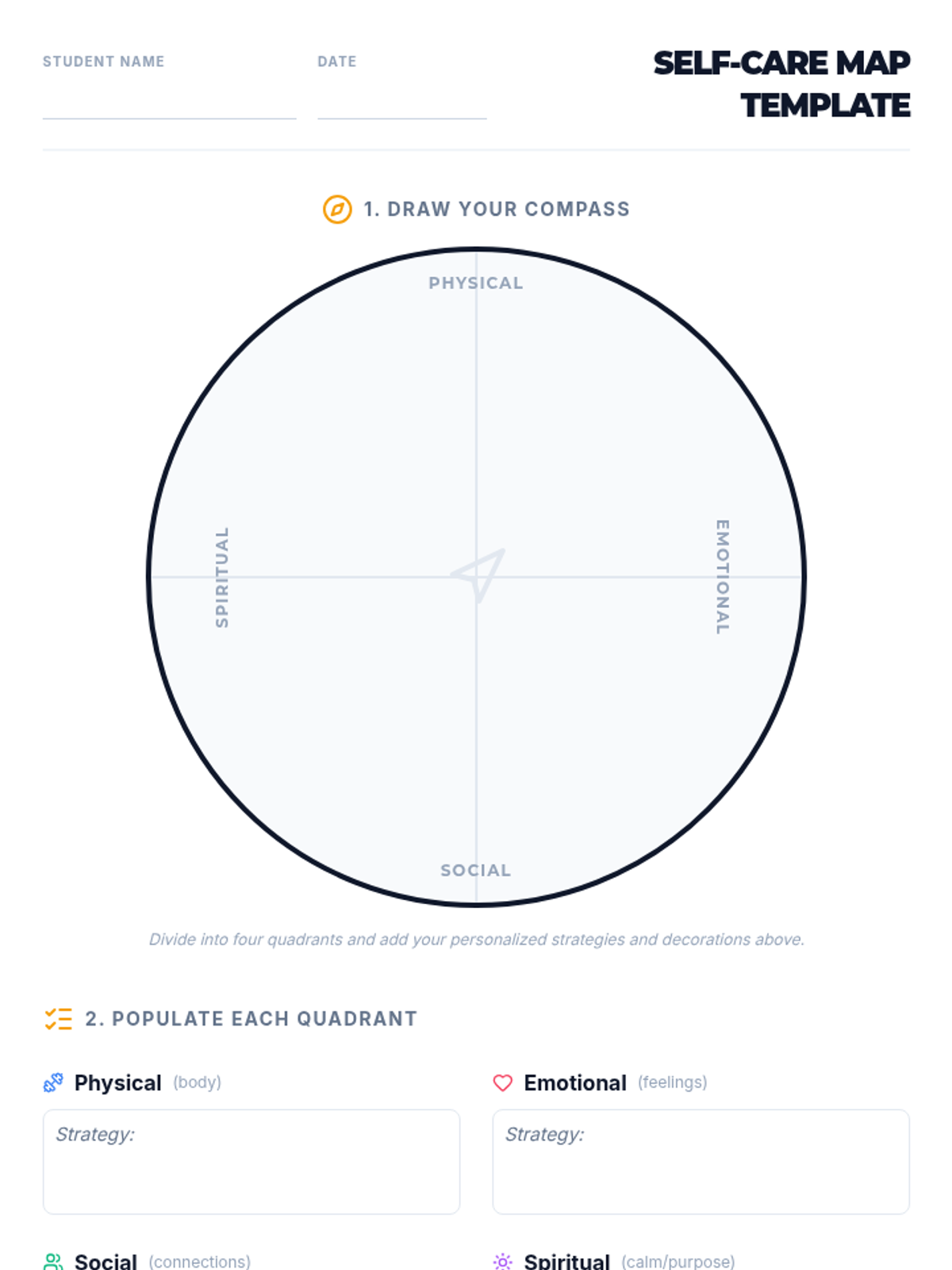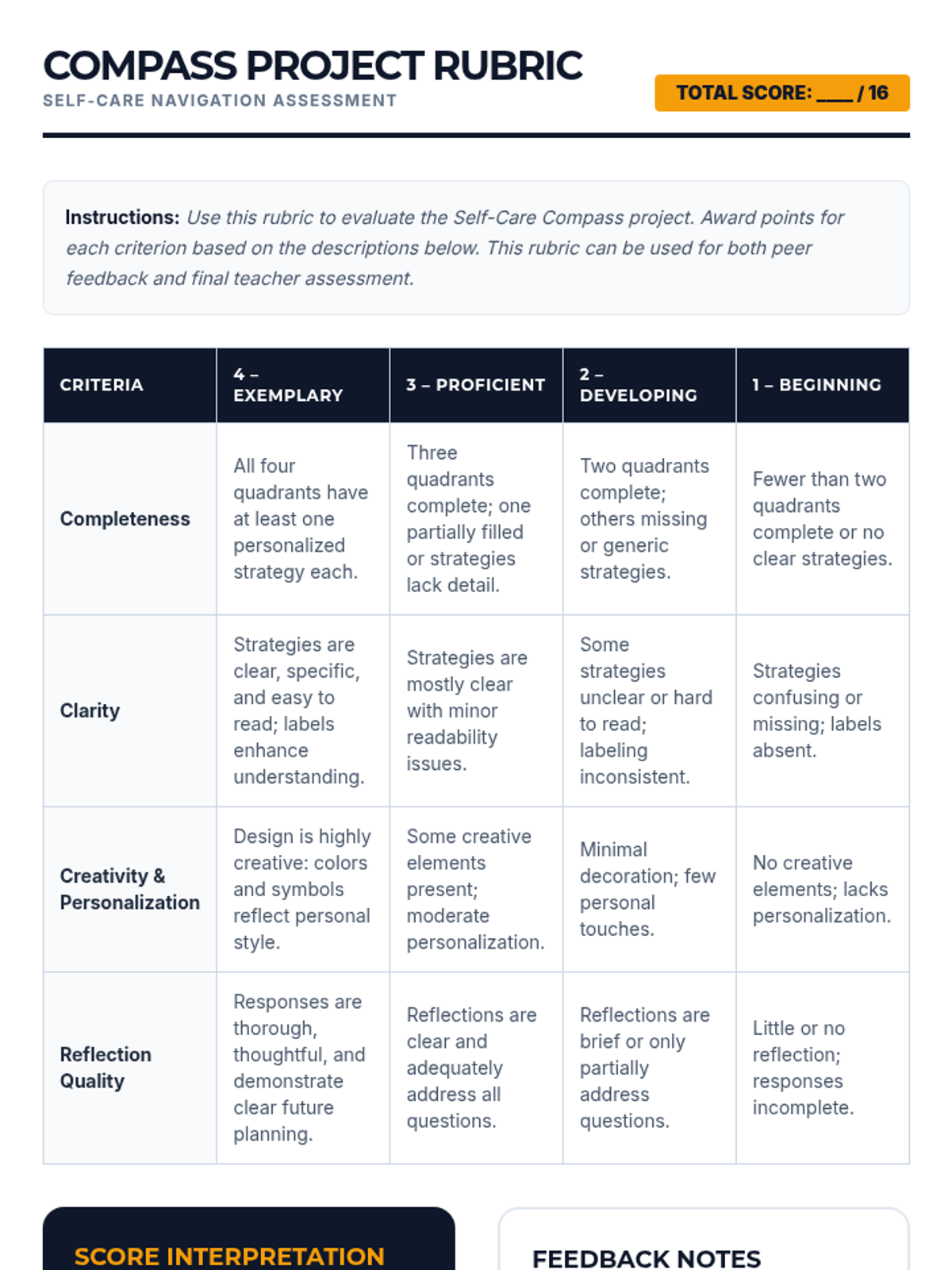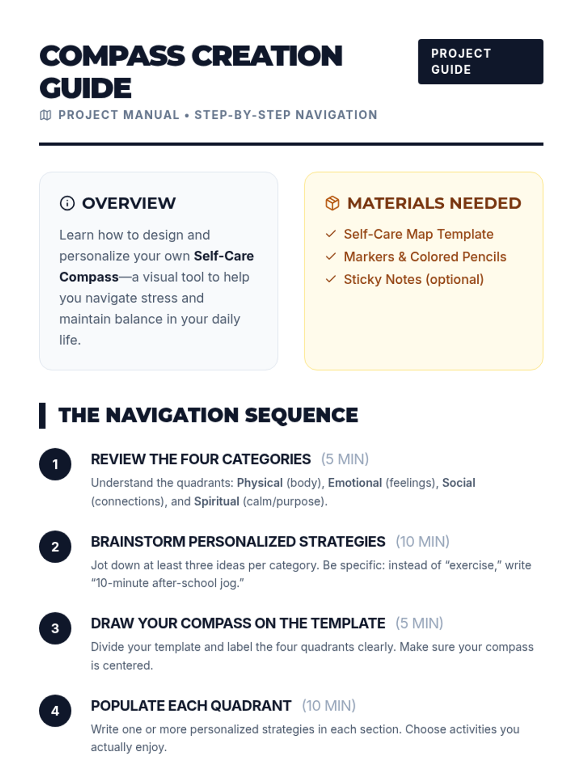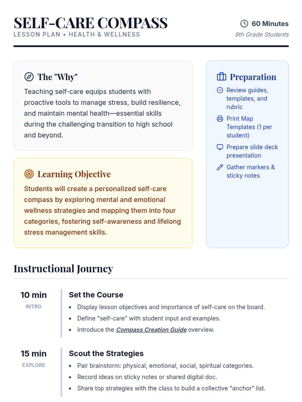 A 60-minute health and wellness lesson where 9th-grade students explore mental and emotional health by creating a personalized "Self-Care Compass" to navigate stress and maintain life balance.