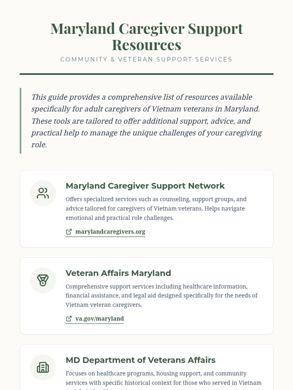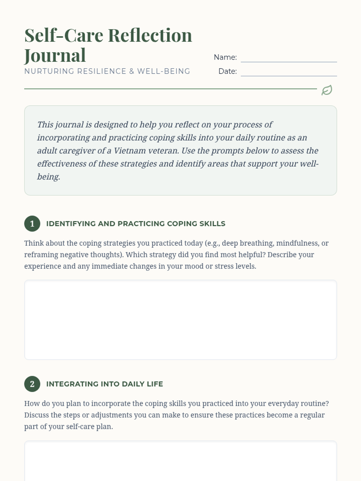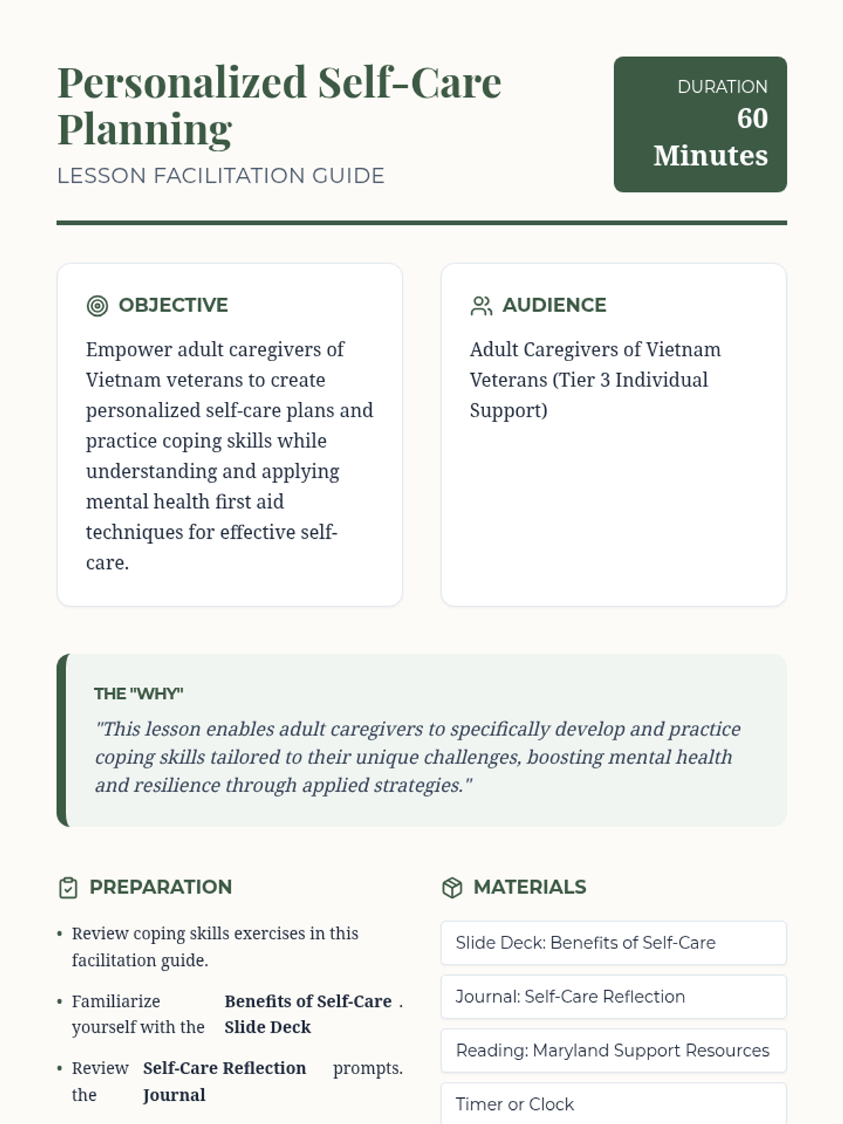 A 60-minute lesson designed for adult caregivers of Vietnam veterans, focusing on personalized self-care strategies, coping skills practice, and mental health first aid.