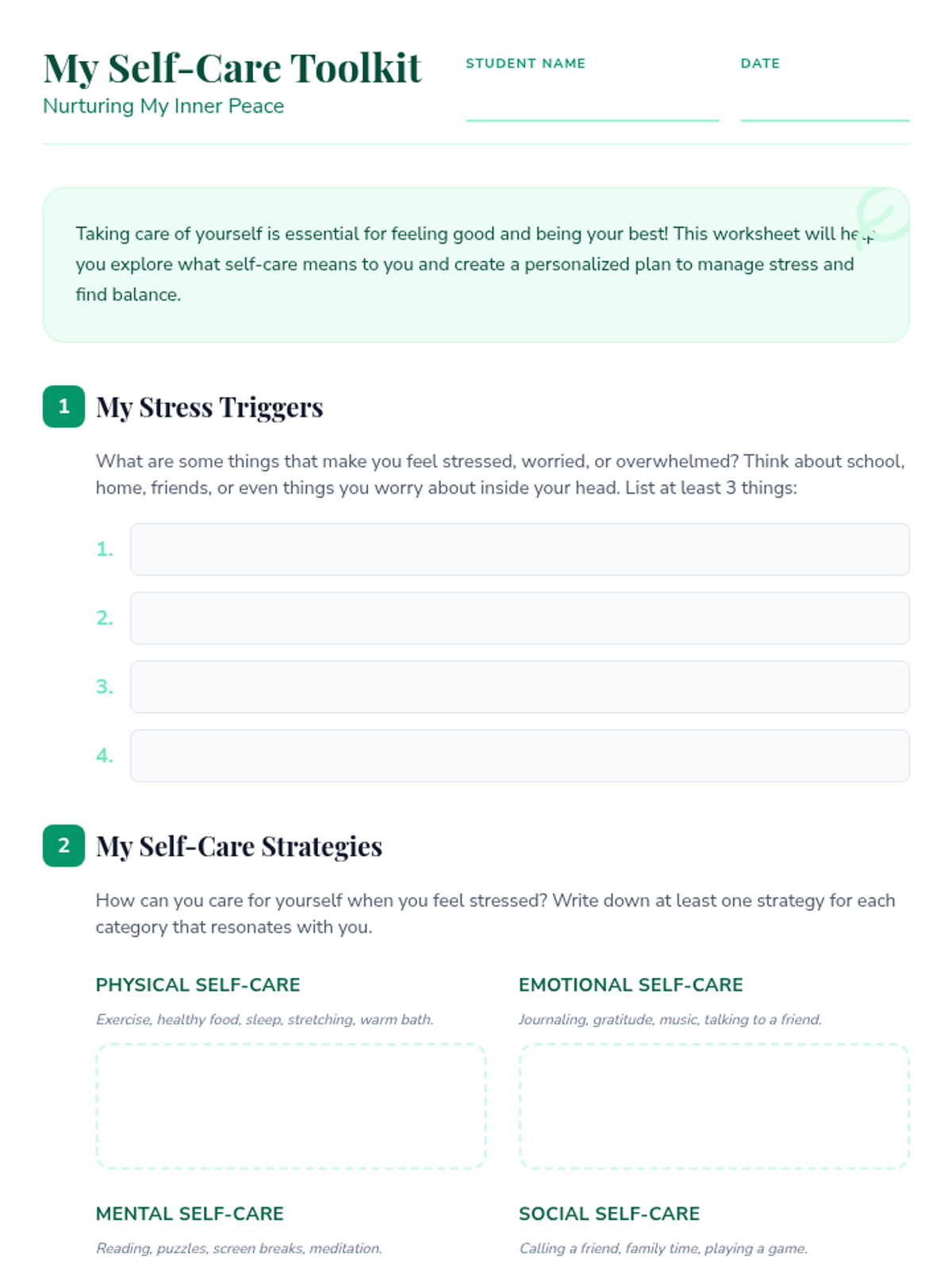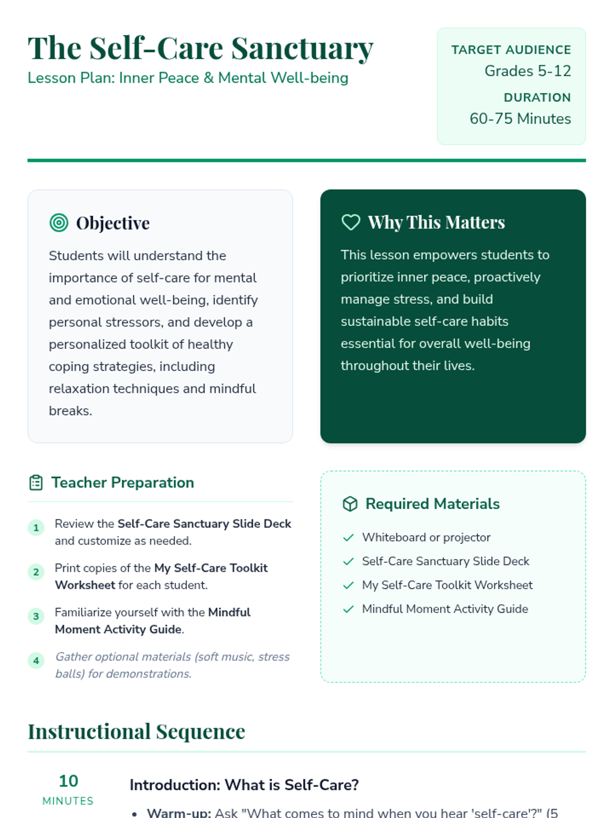 A comprehensive lesson for grades 5-12 focusing on self-care, identifying personal stressors, and developing a personalized toolkit of healthy coping strategies to build sustainable mental and emotional well-being.