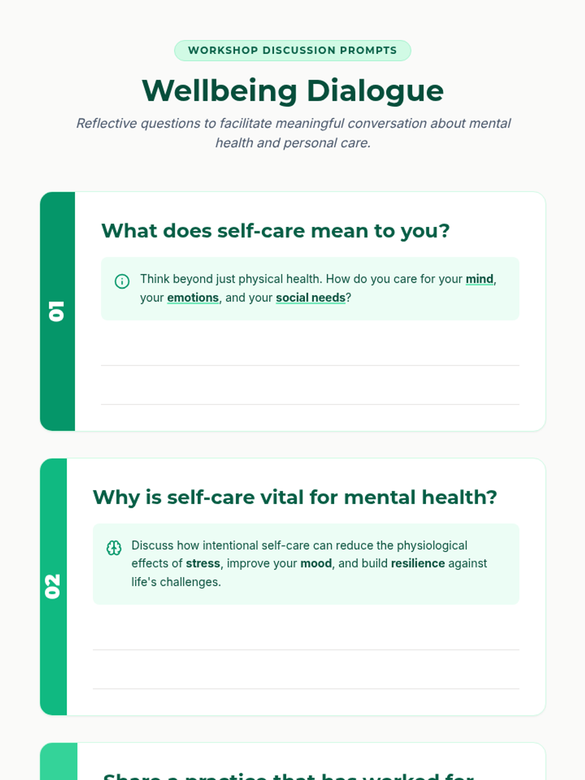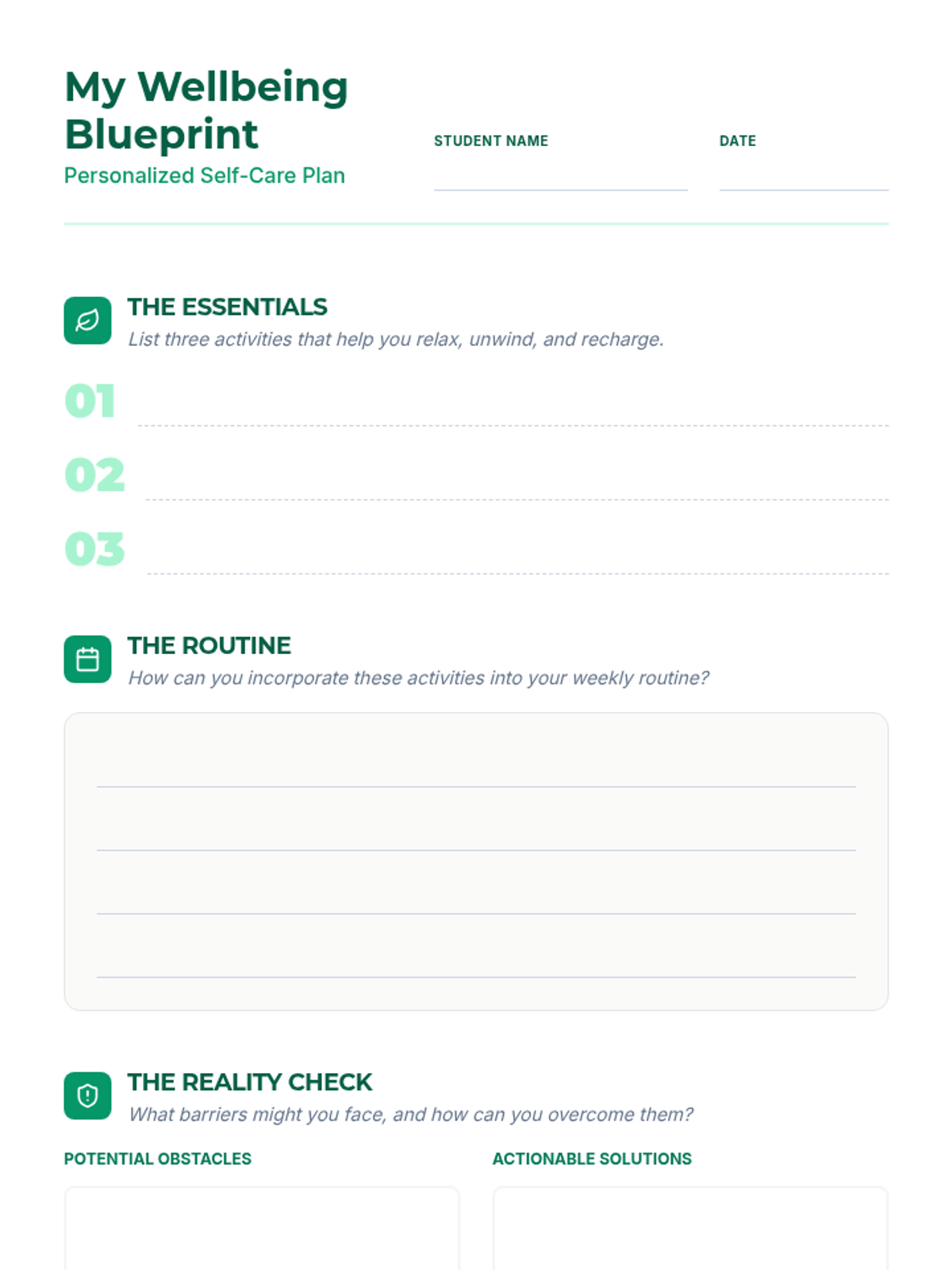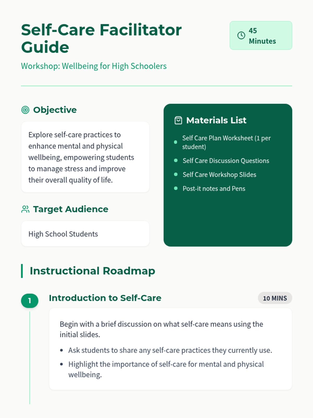 A 45-minute interactive workshop for high school students to explore self-care practices, identify personal wellbeing needs, and create an actionable plan to manage stress and improve quality of life.