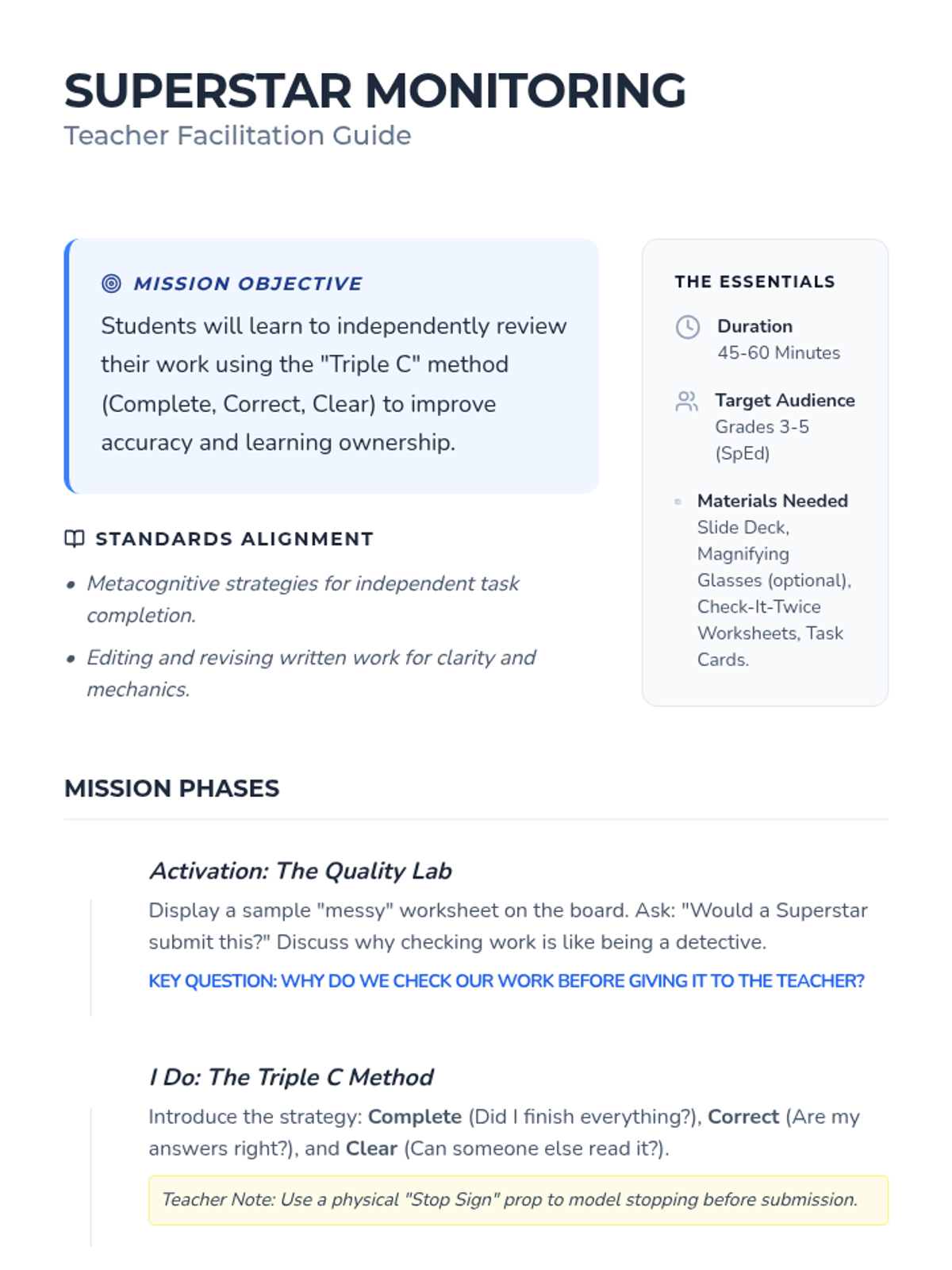 A comprehensive lesson designed to teach 3rd-5th grade special education students the essential skills of self-monitoring and reviewing their work for accuracy and completeness before submission.