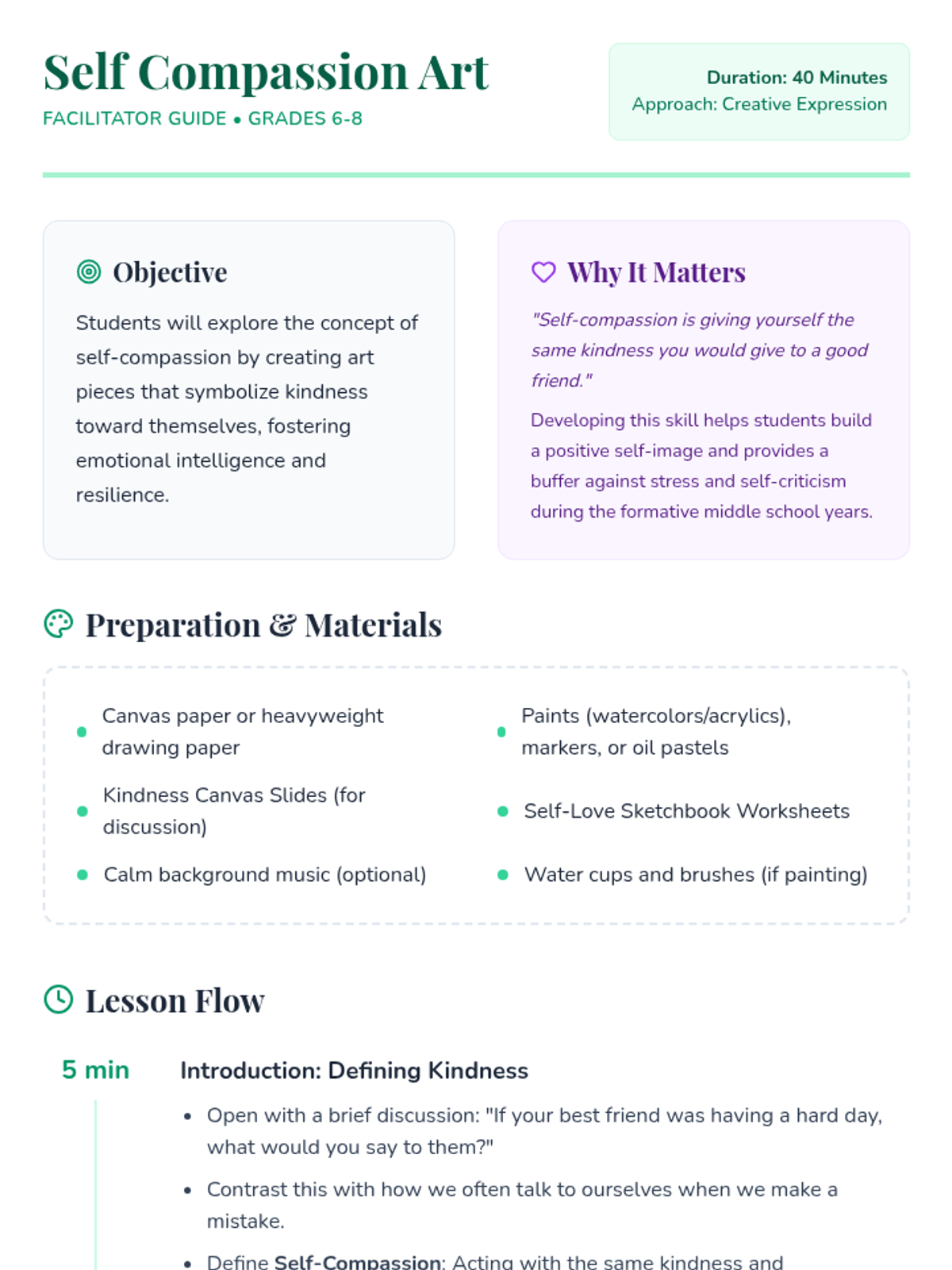 A 40-minute lesson for grades 6-8 that uses artistic expression to explore and practice self-compassion, helping students develop emotional resilience and a positive self-image.