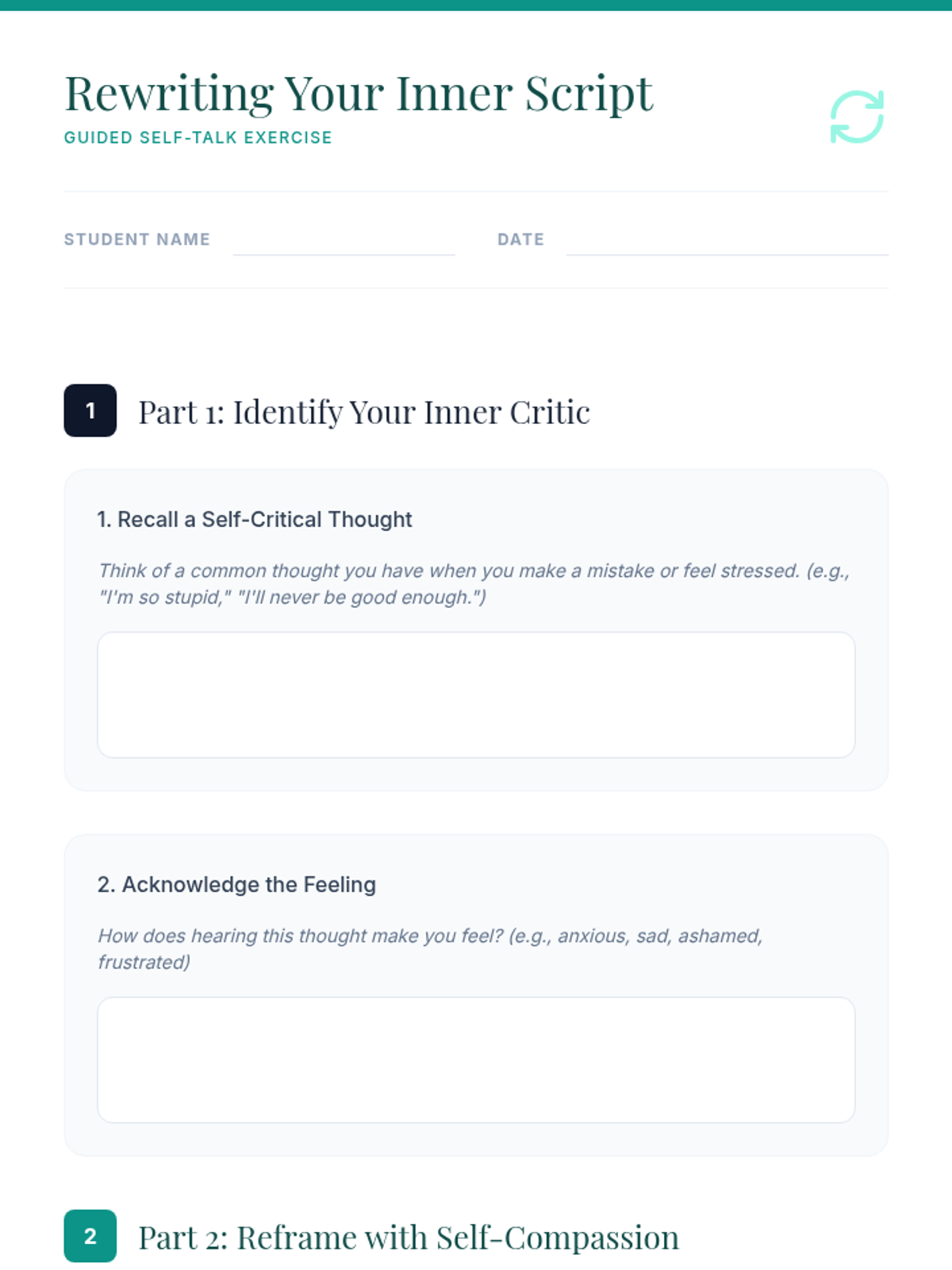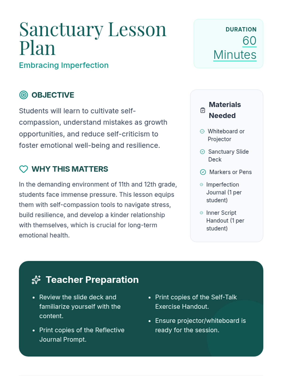 A 60-minute lesson for 11th and 12th graders to cultivate self-compassion, navigate stress, and reduce self-criticism through reflection and guided exercises.