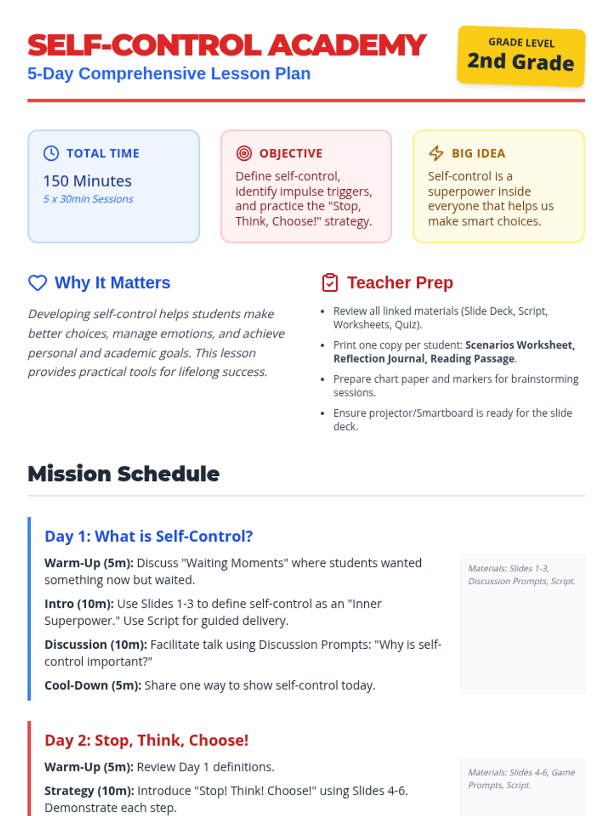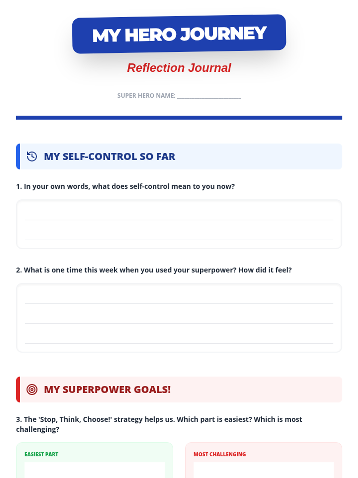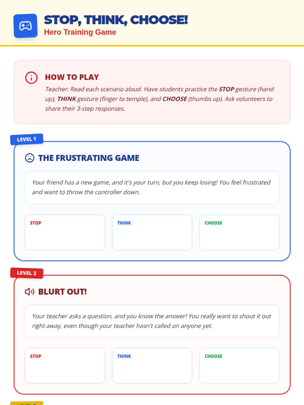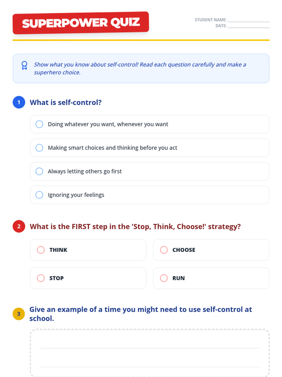A 5-session curriculum where students learn to identify impulses, apply the 'Stop, Think, Choose!' method, and reflect on their journey to becoming self-control masters.