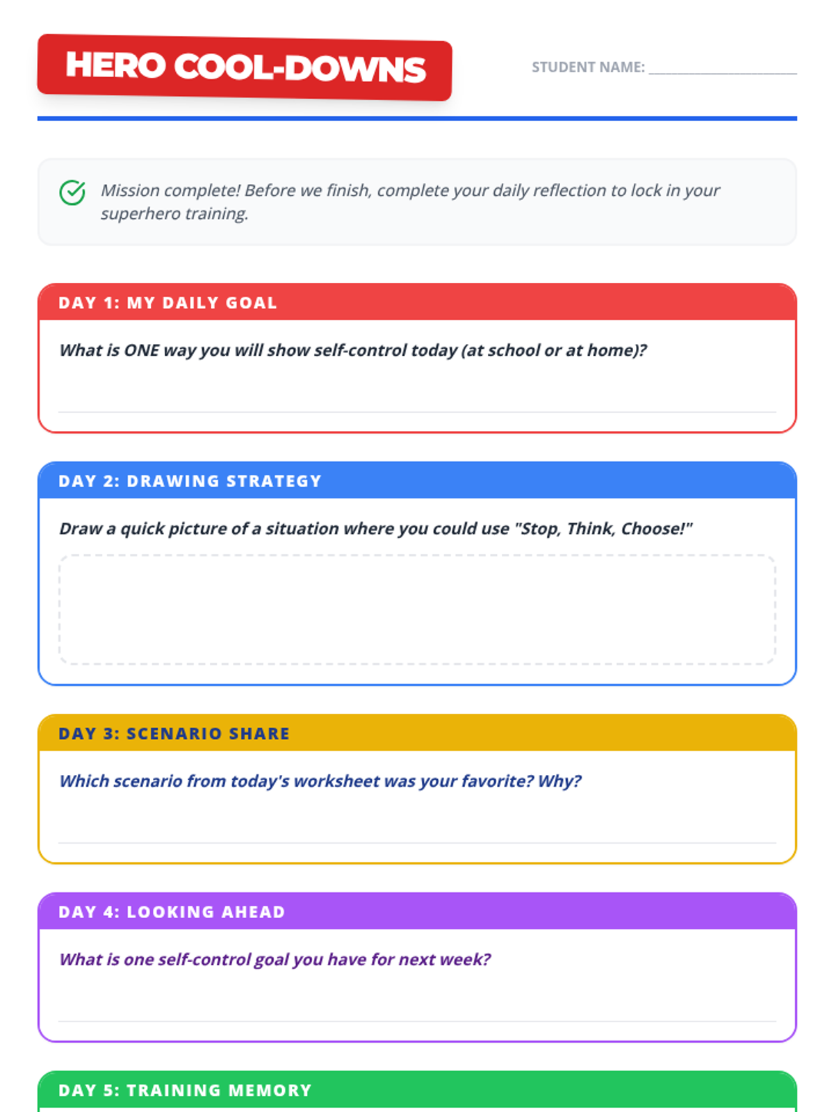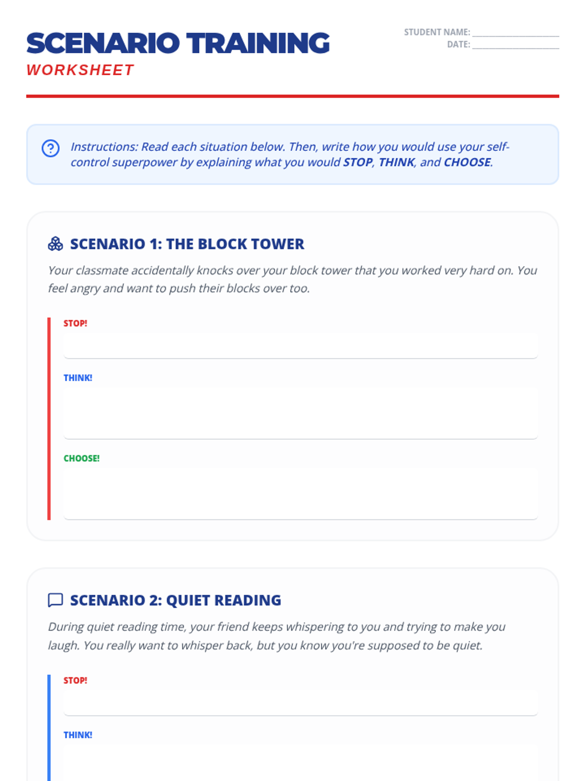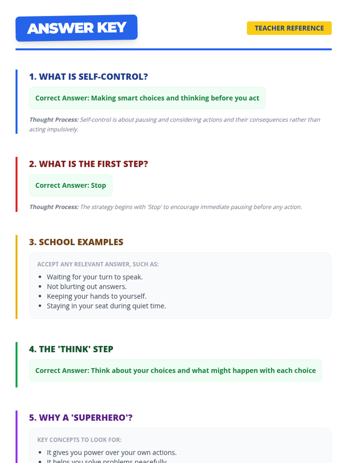 A 5-session curriculum where students learn to identify impulses, apply the 'Stop, Think, Choose!' method, and reflect on their journey to becoming self-control masters.