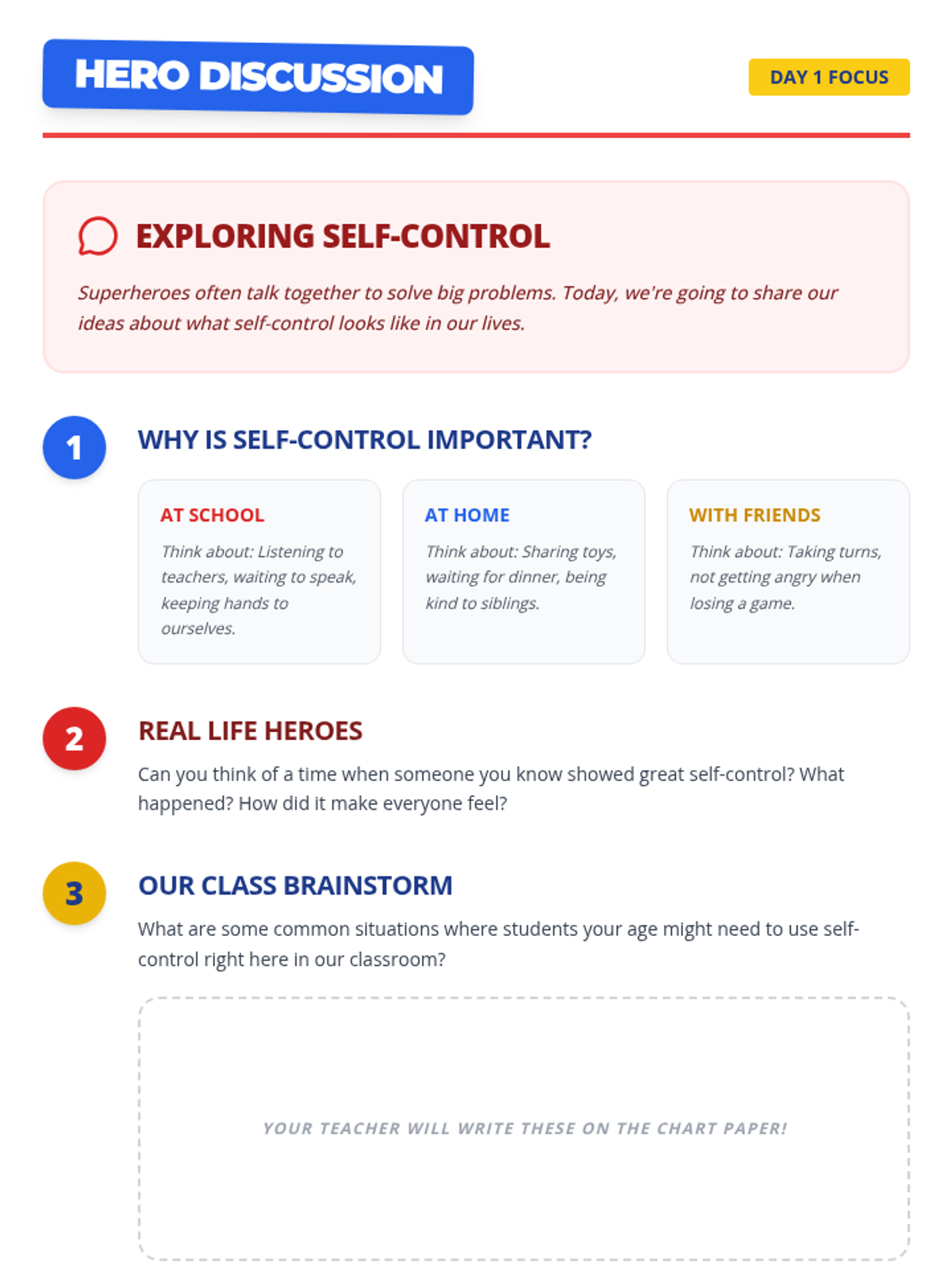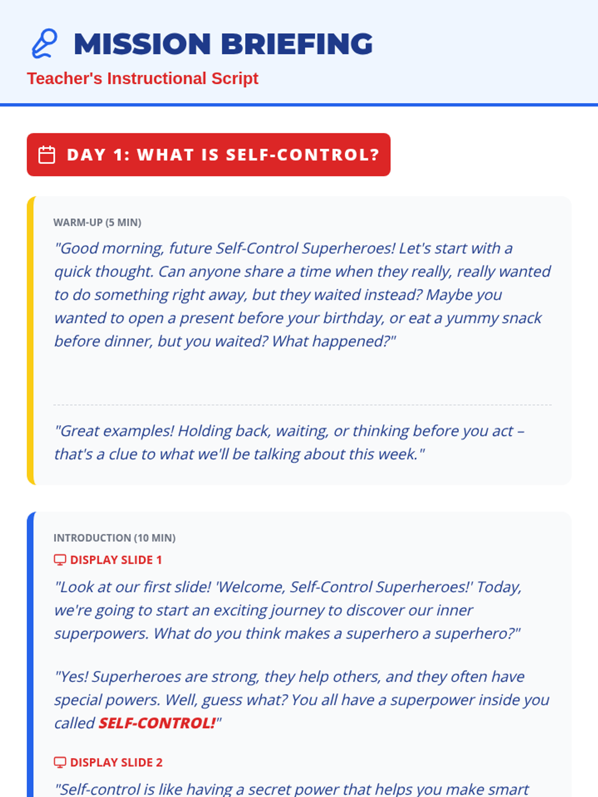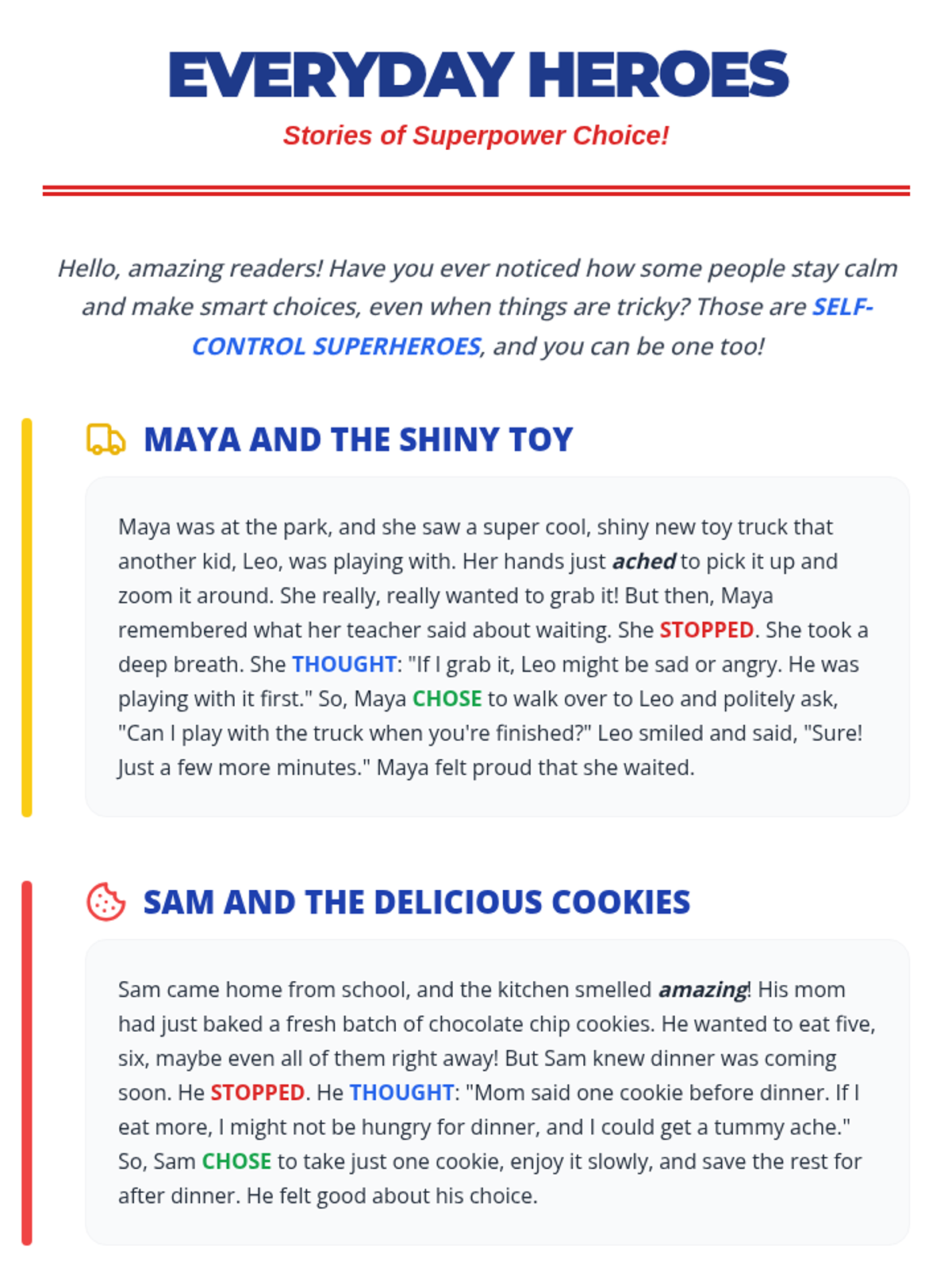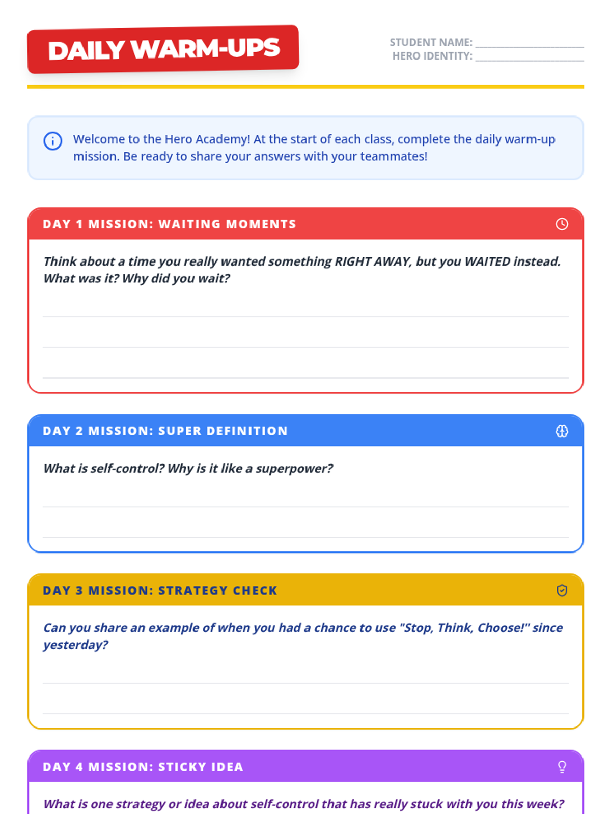 A 5-session curriculum where students learn to identify impulses, apply the 'Stop, Think, Choose!' method, and reflect on their journey to becoming self-control masters.