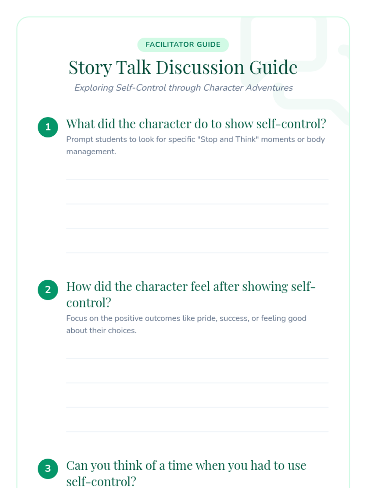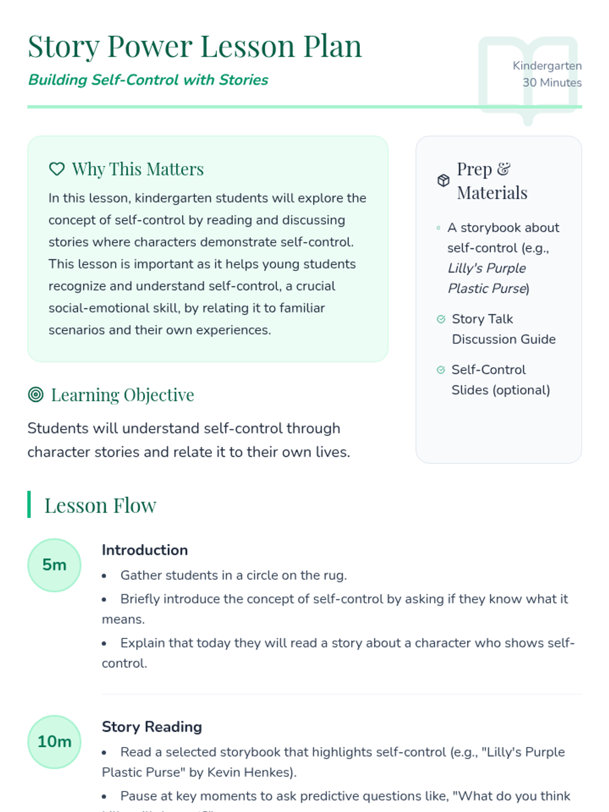 A kindergarten lesson using stories to teach the concept of self-control, helping students recognize and practice managing their emotions and actions.