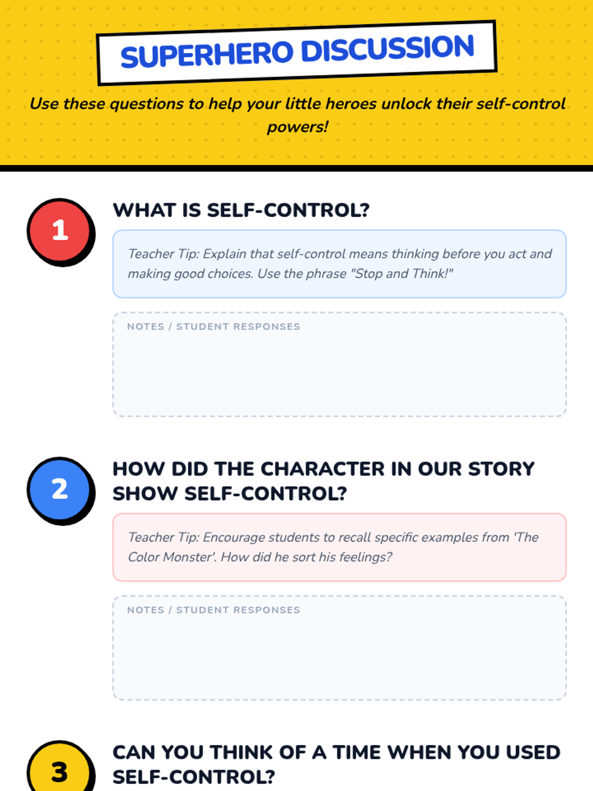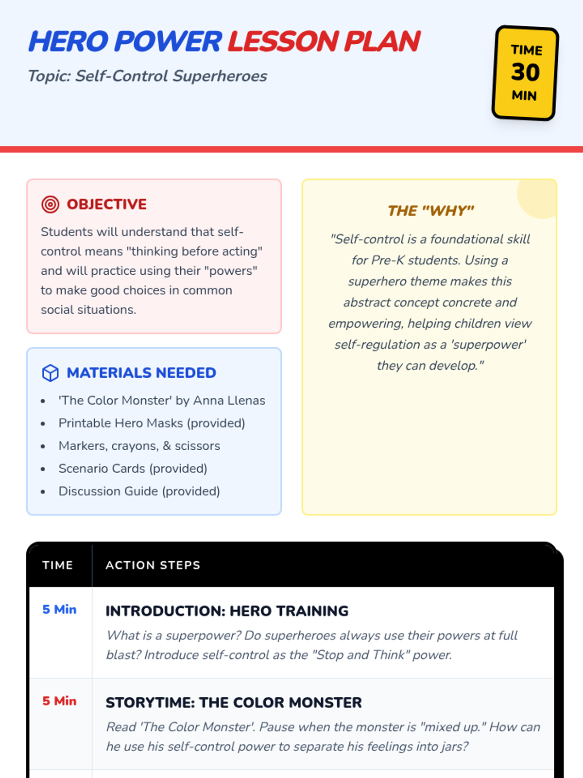 An engaging Pre-K lesson that uses a superhero theme to teach the concept of self-control through story, discussion, and role-play.