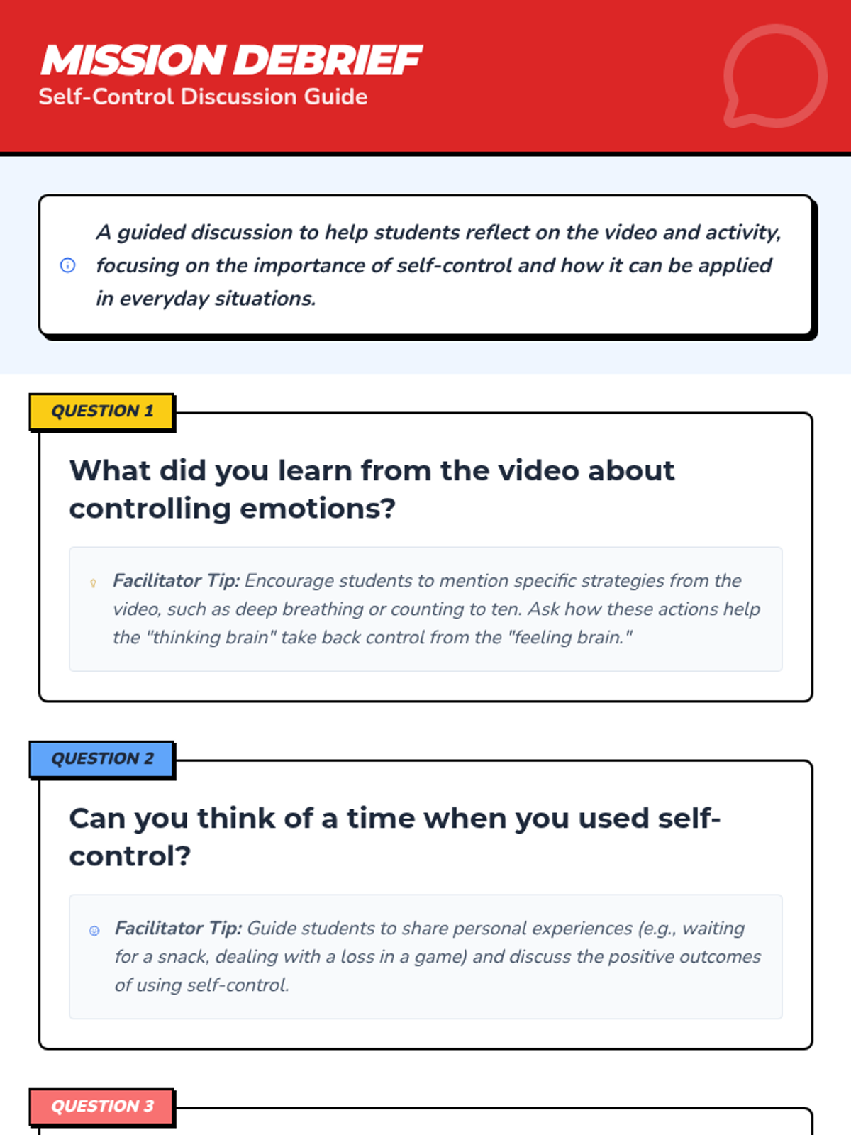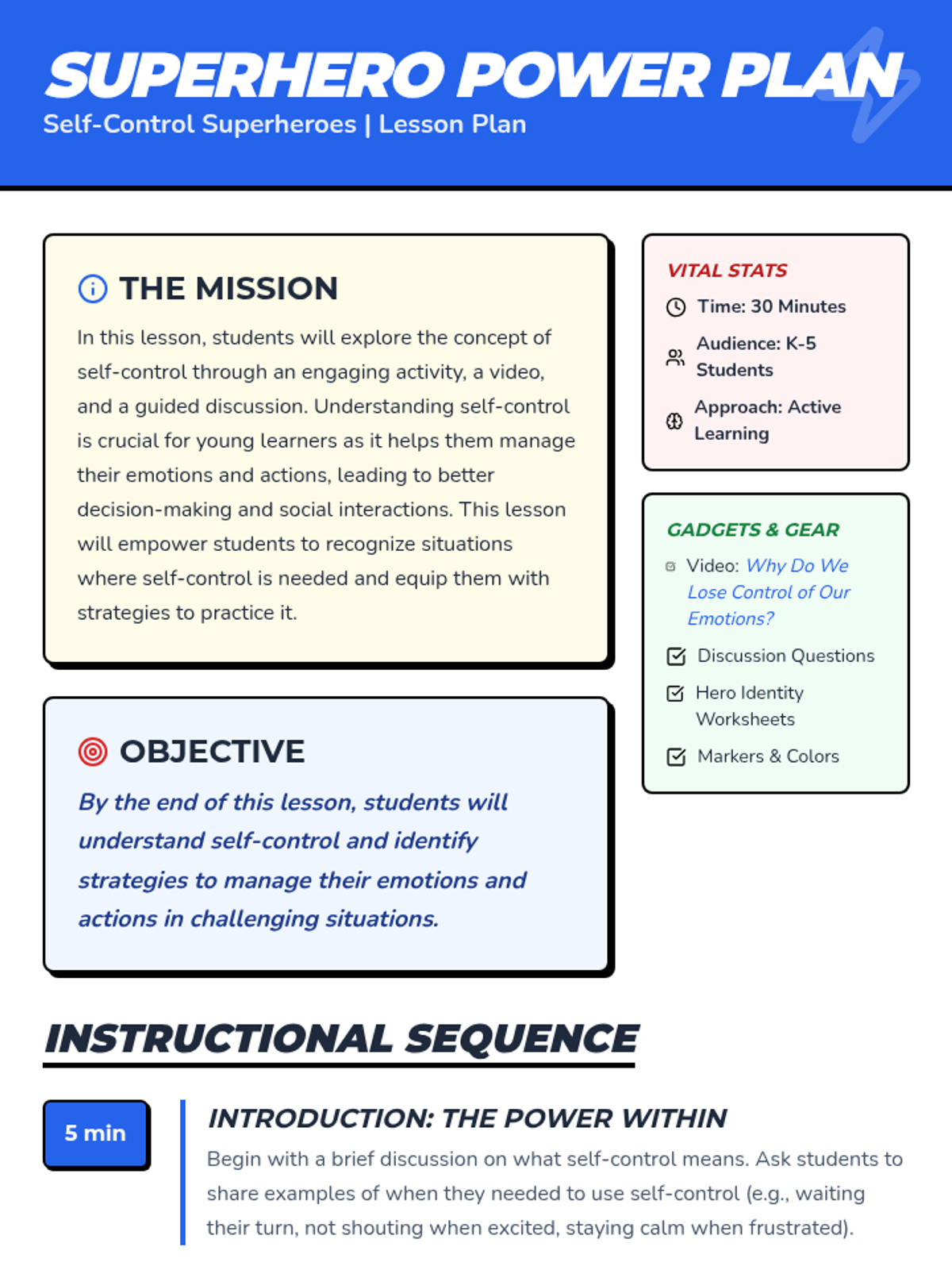 An engaging lesson for K-5 students to explore self-control through superhero-themed activities, a video, and guided discussions. Students learn to recognize emotions and apply strategies to stay in control of their actions.