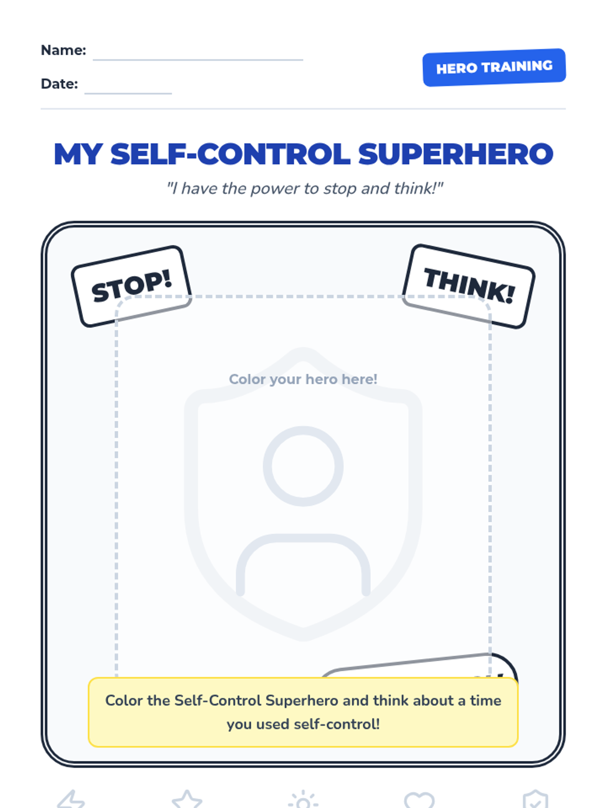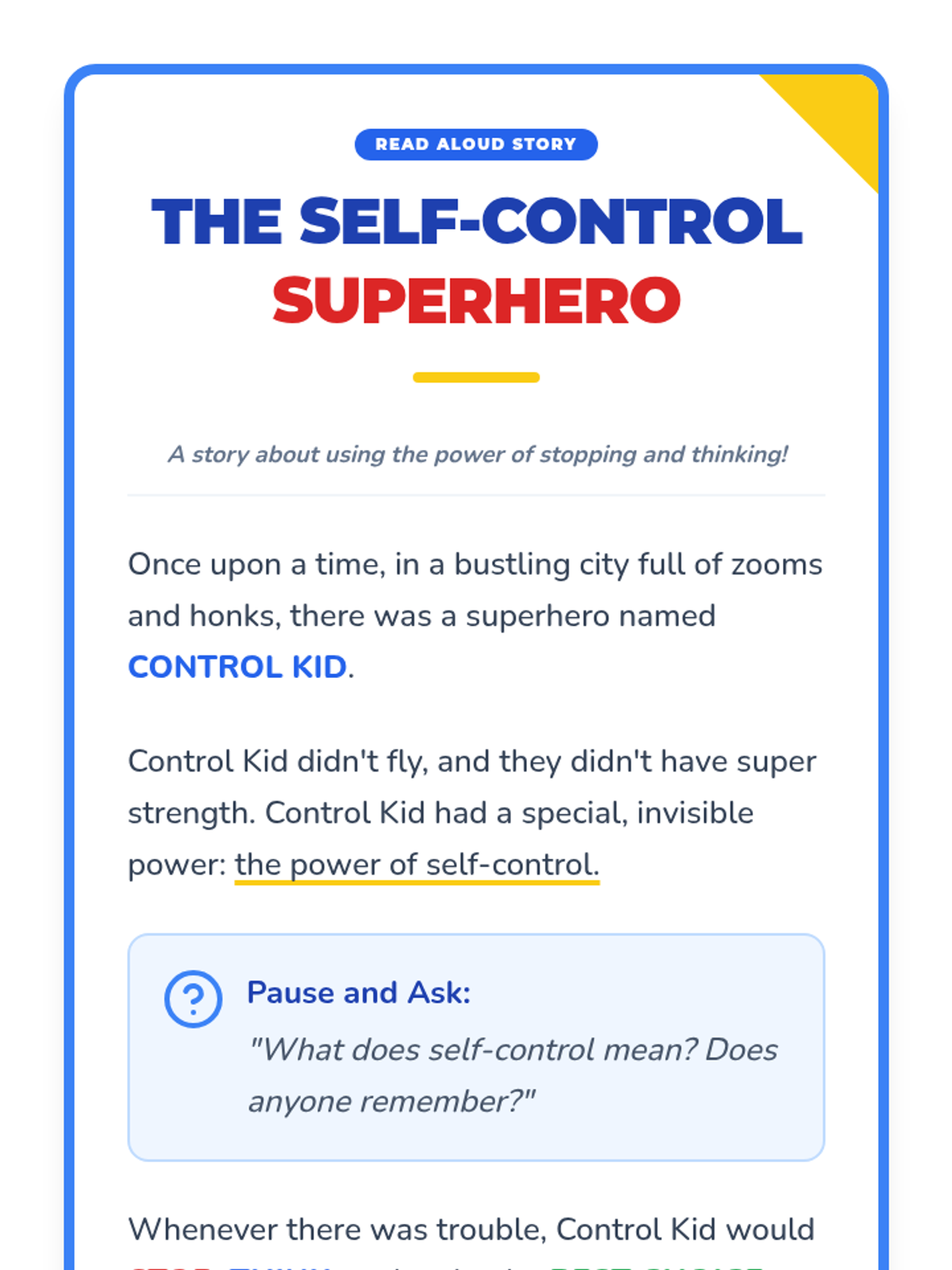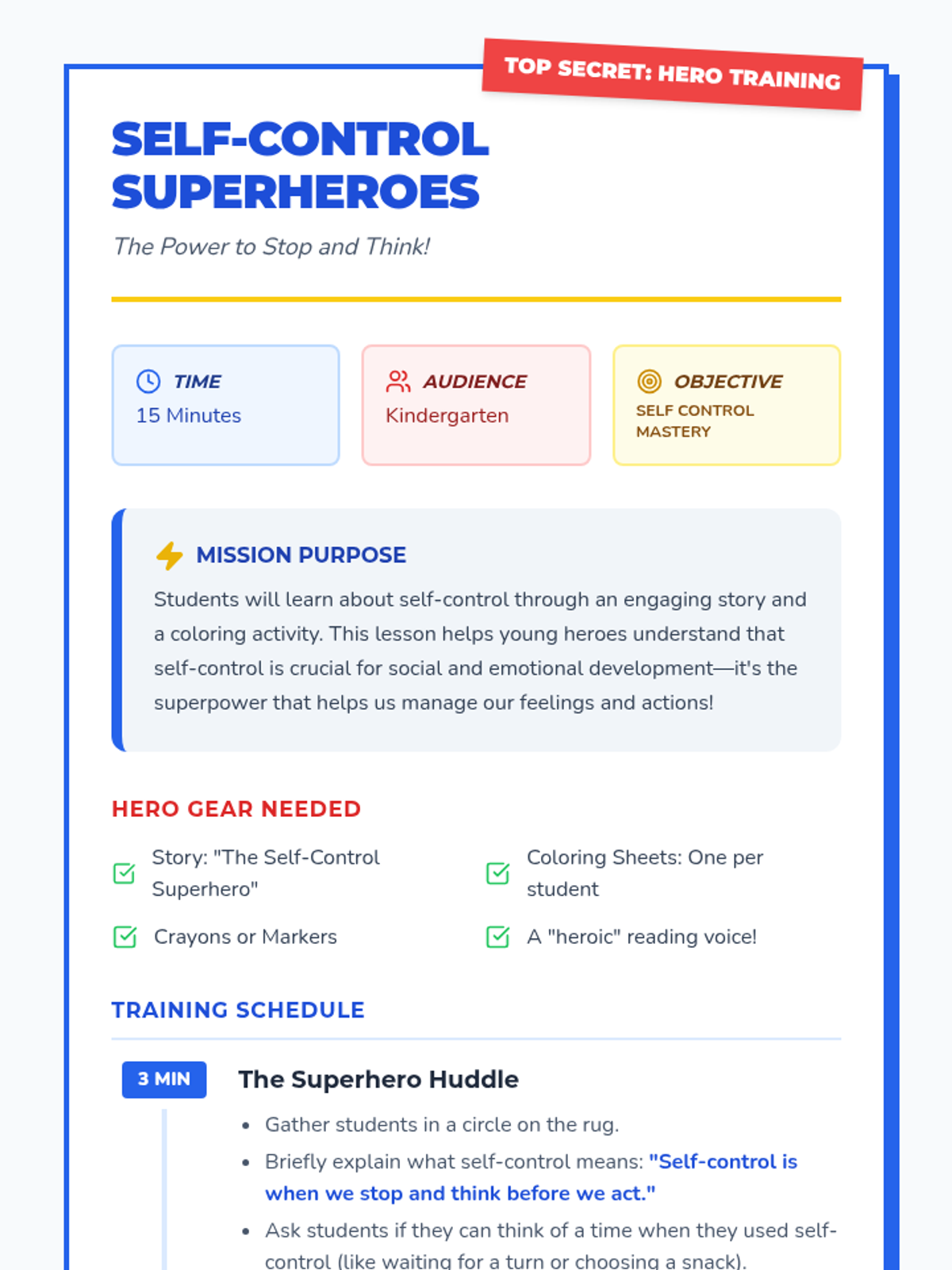 A 15-minute Kindergarten lesson introducing self-control through a superhero story and a creative coloring activity. Students learn that self-control is the power to stop and think before acting.