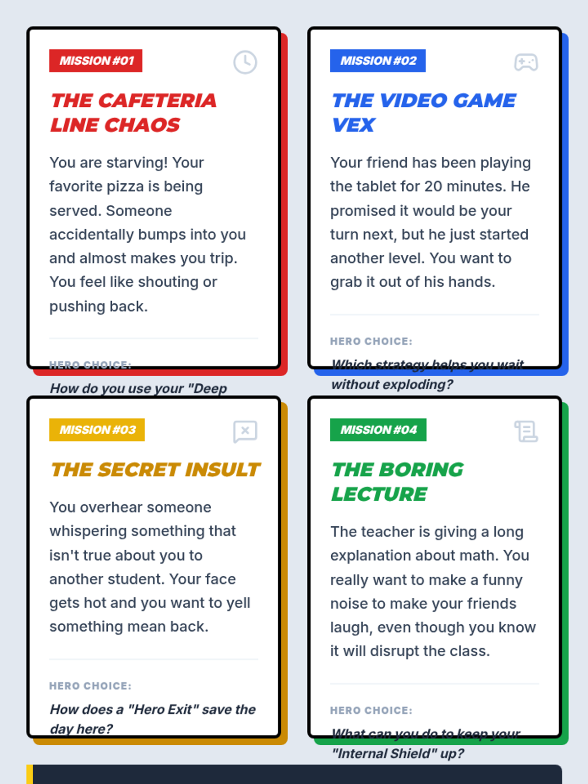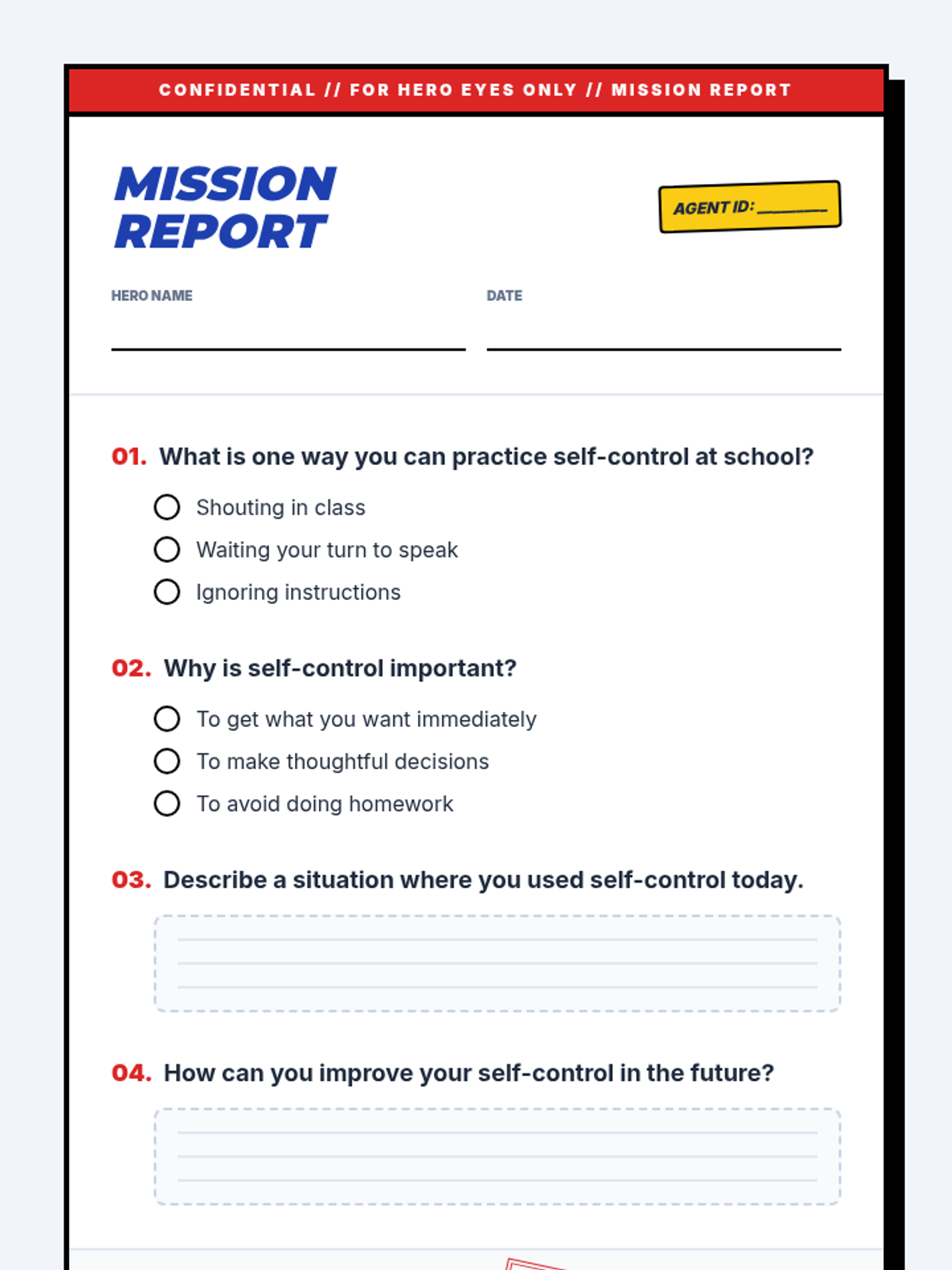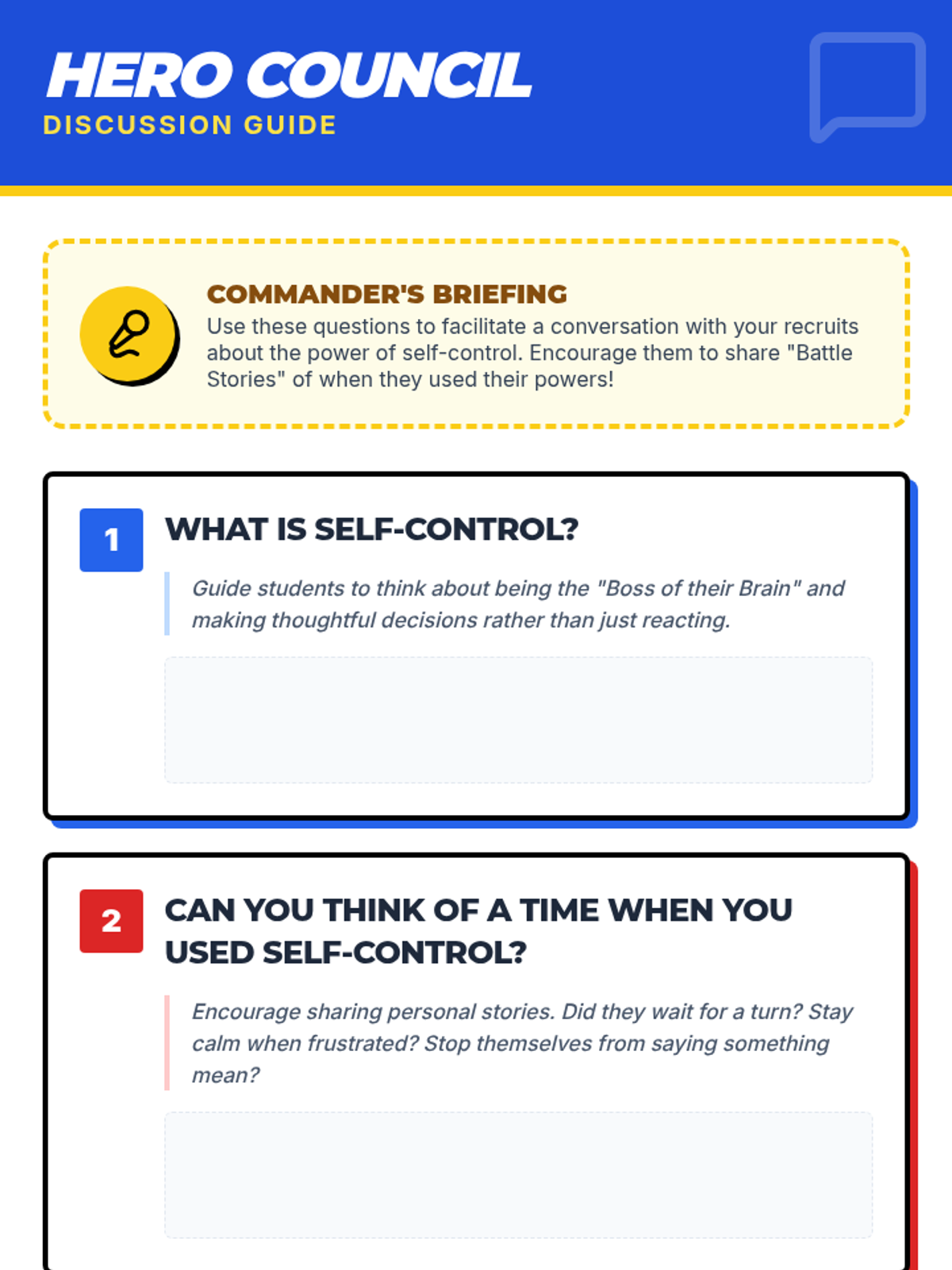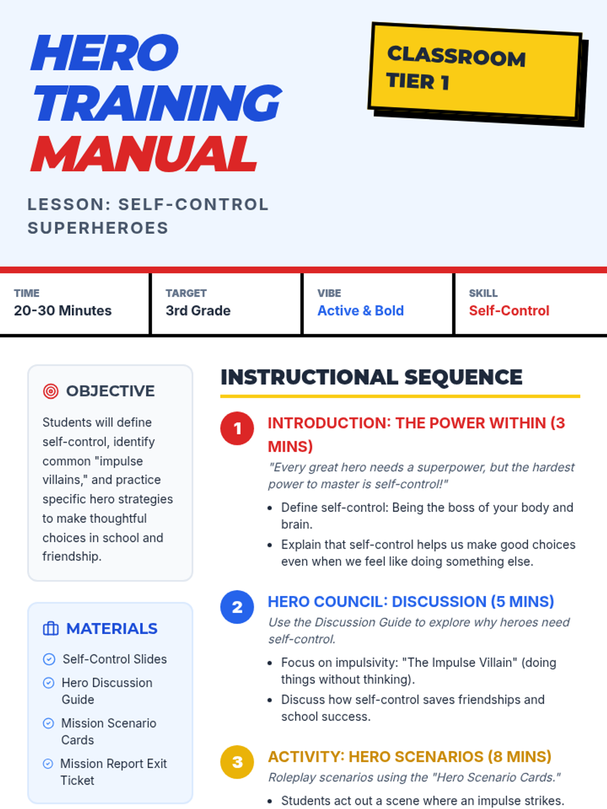 A high-energy, comic-book themed lesson designed for 3rd grade boys to explore self-control, impulsivity, and decision-making through superhero-themed scenarios and challenges.