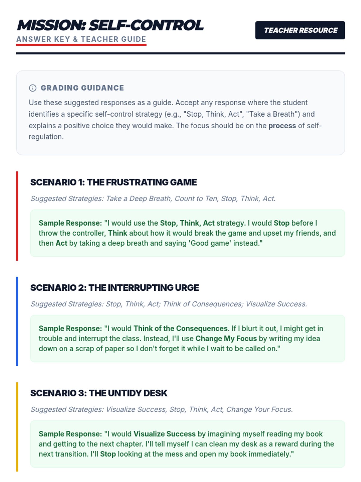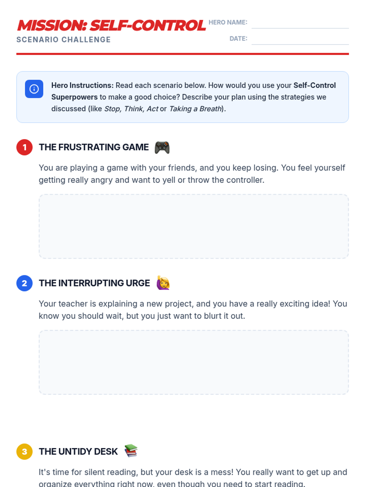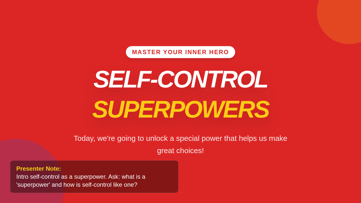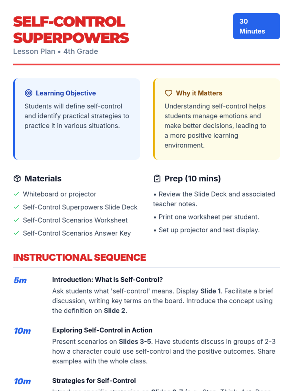 A 30-minute lesson for 4th-grade students that teaches the concept of self-control using a superhero theme. Students will learn practical strategies like 'Stop, Think, Act' and apply them to various classroom and social scenarios.