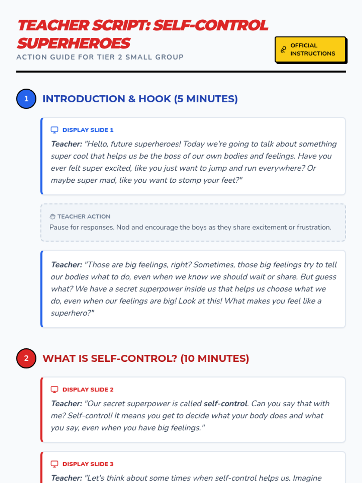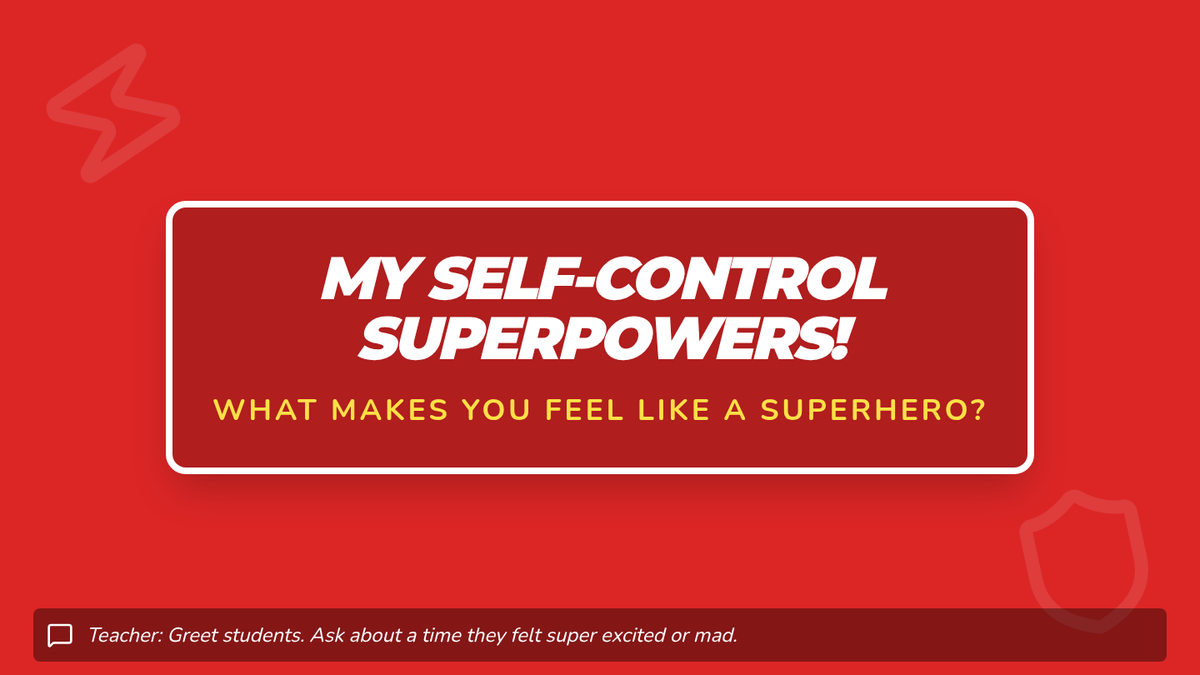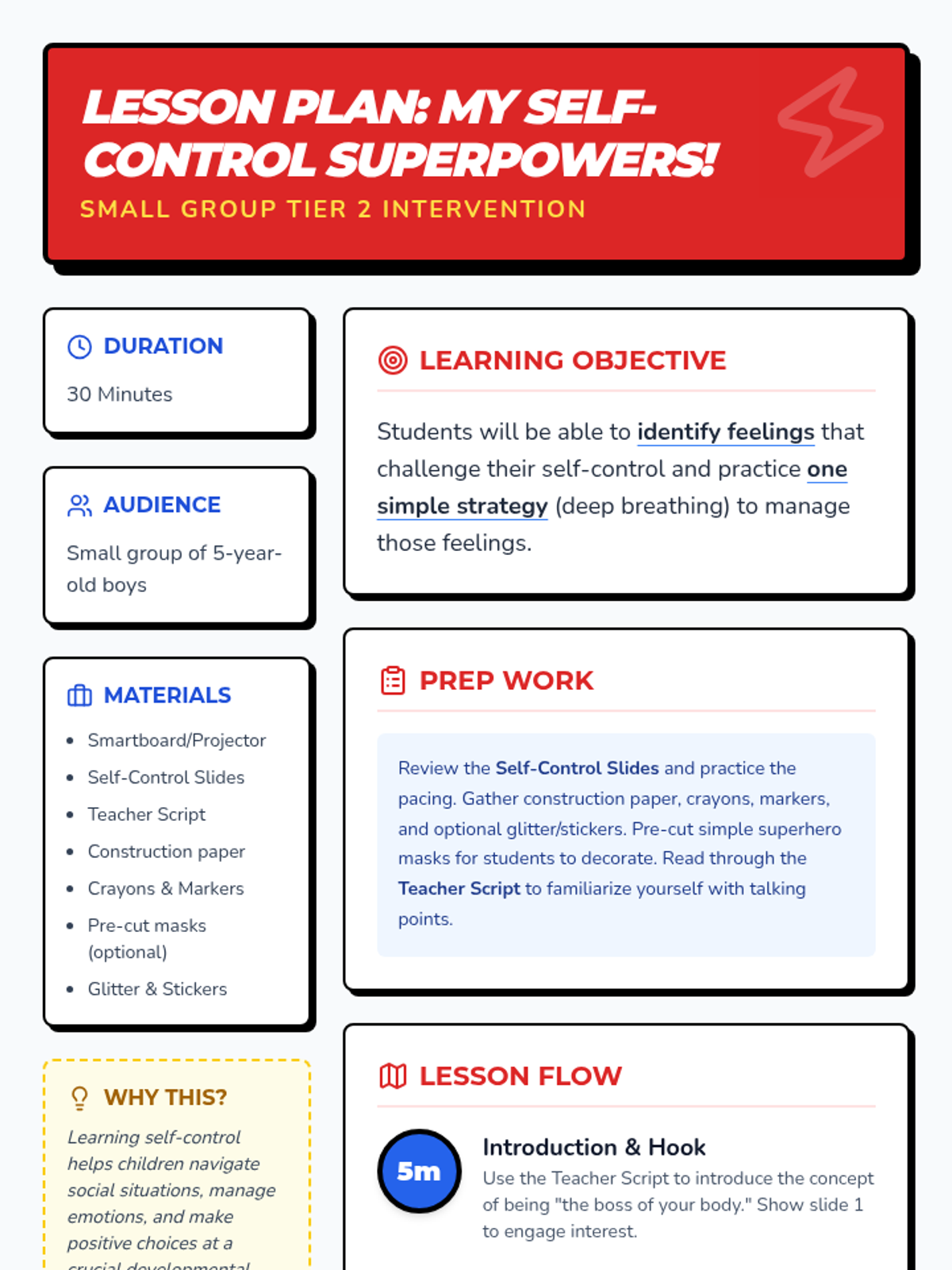A 30-minute Tier 2 group lesson for 5-year-old boys to learn emotional regulation and self-control through a superhero theme, featuring interactive slides and a mask-making activity.