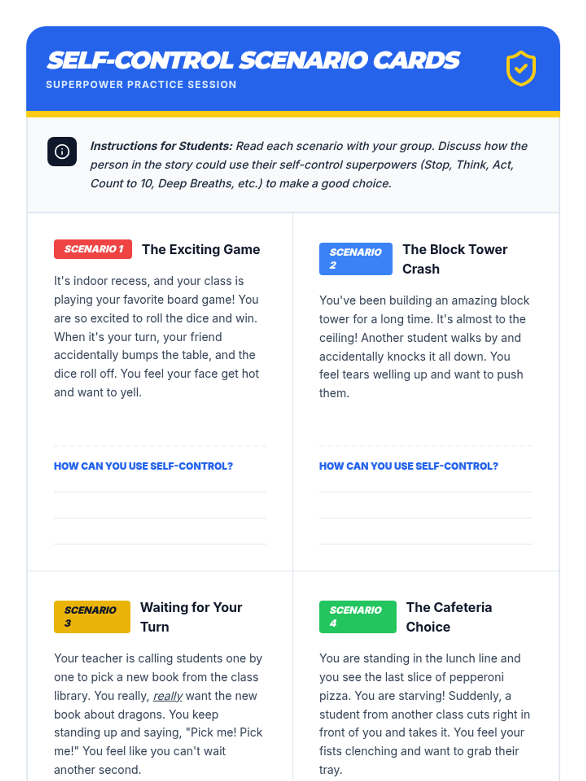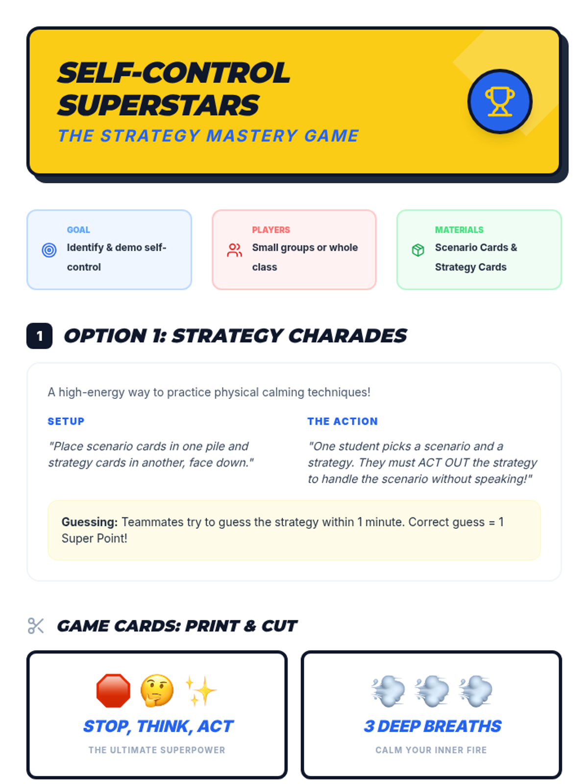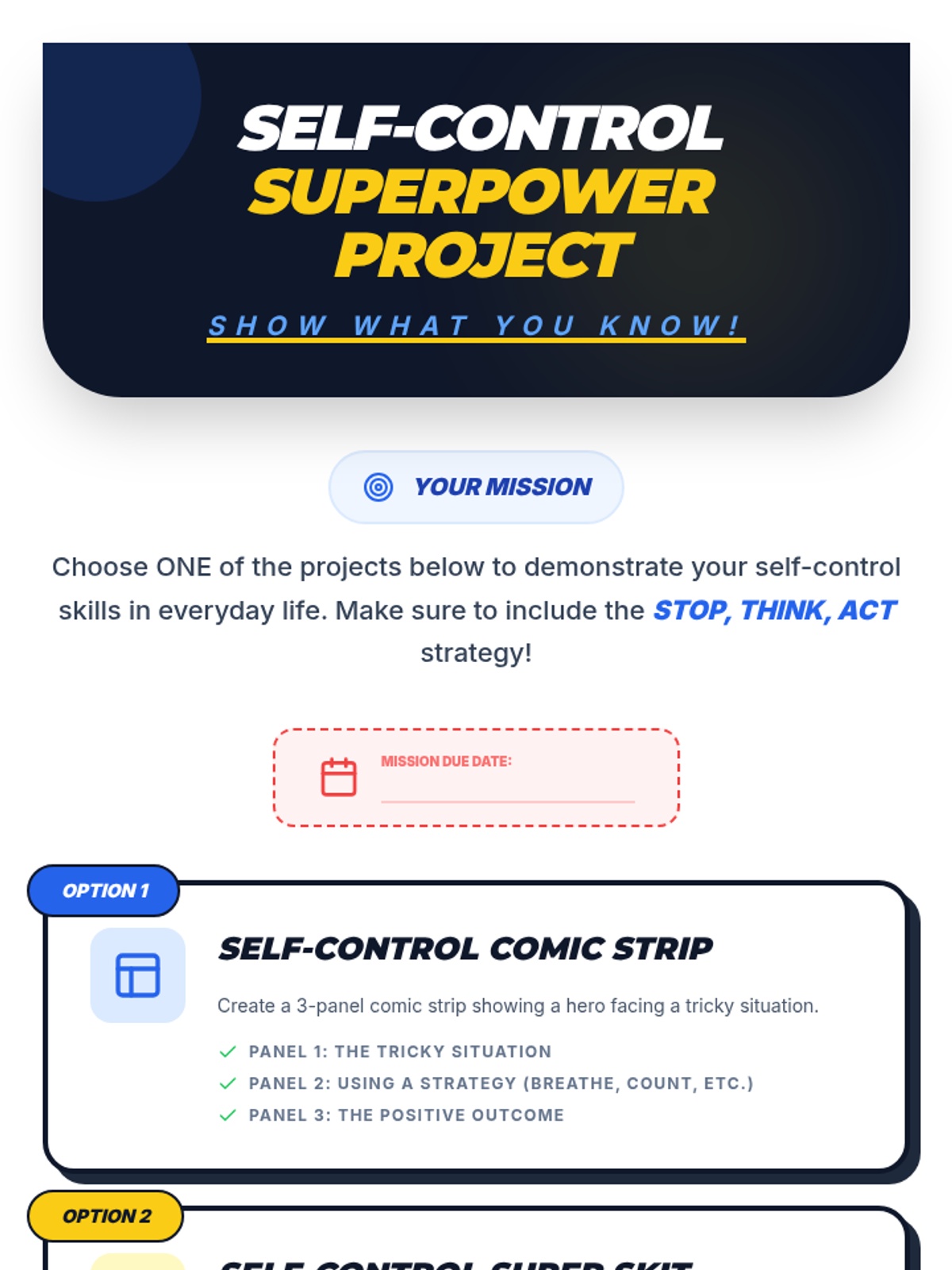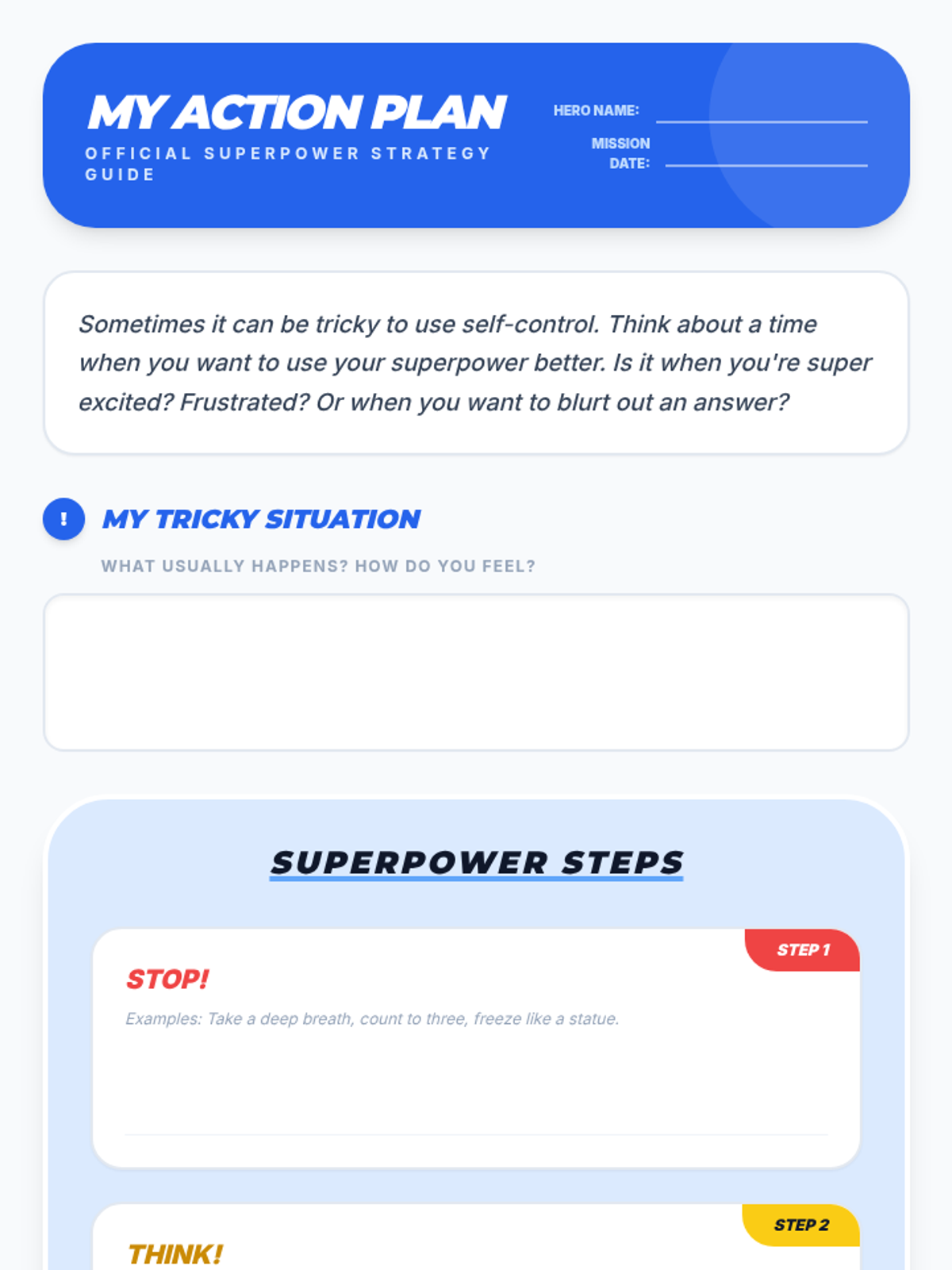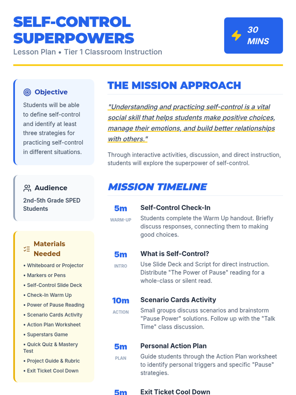 This single-session social-emotional learning lesson empowers 2nd-5th grade SPED students to understand and practice self-control through a superhero-themed approach. Students learn the 'Stop, Think, Act' strategy and develop a personal action plan for managing big emotions and impulses.