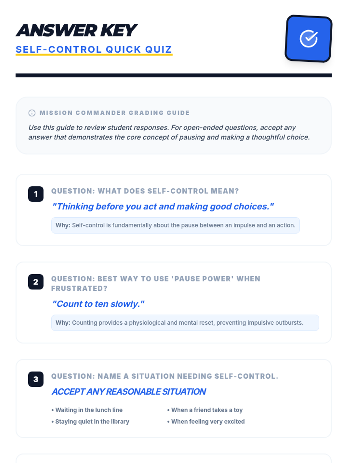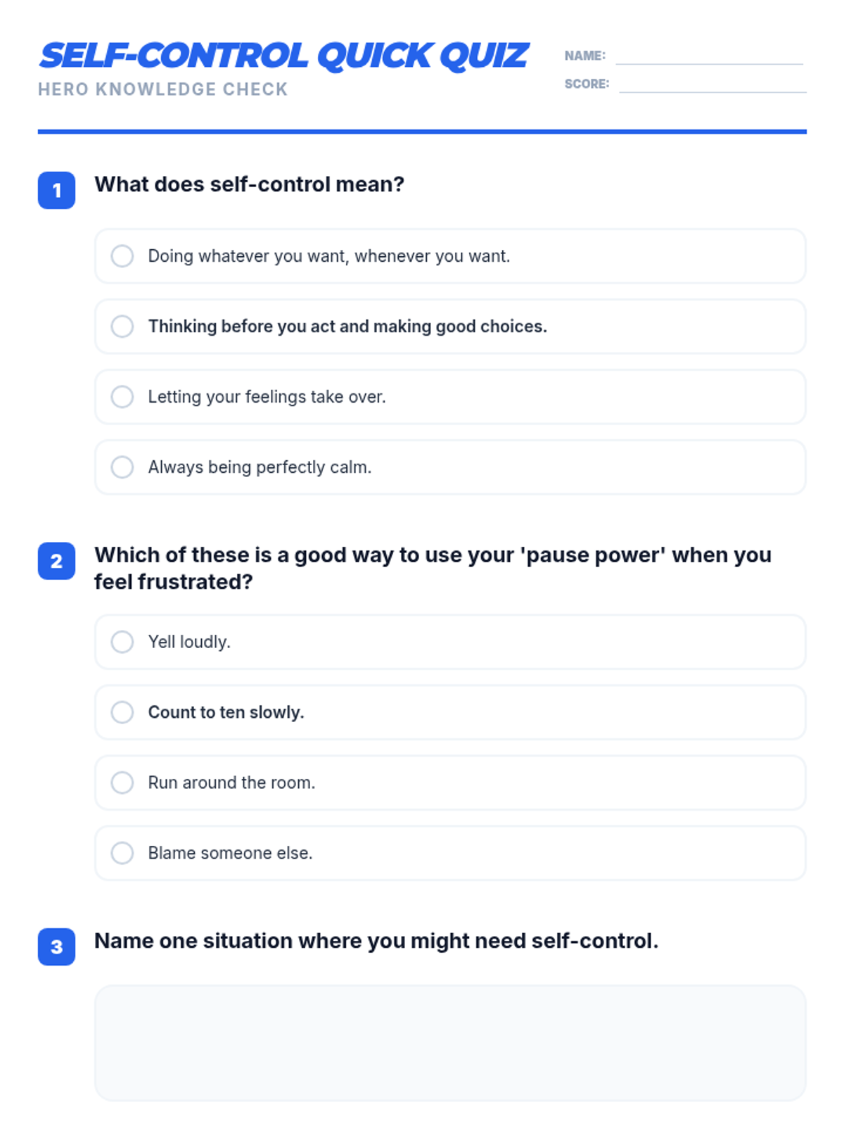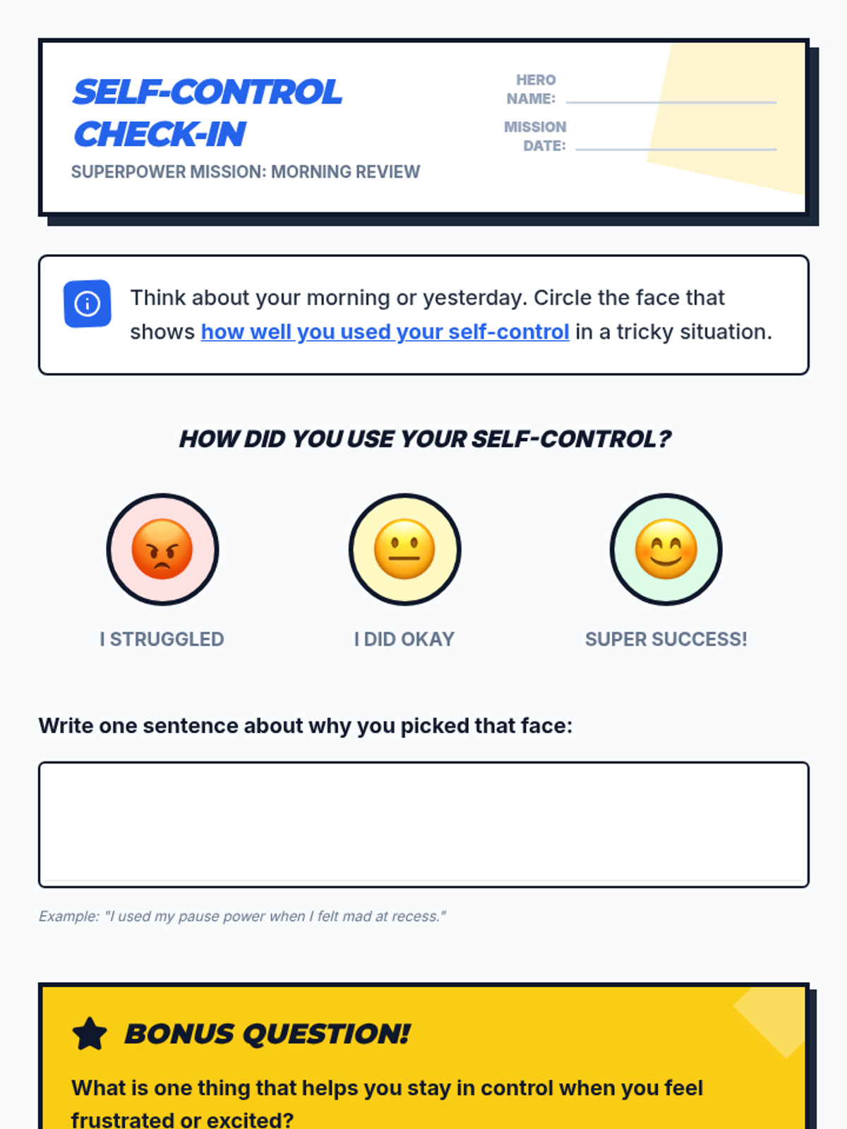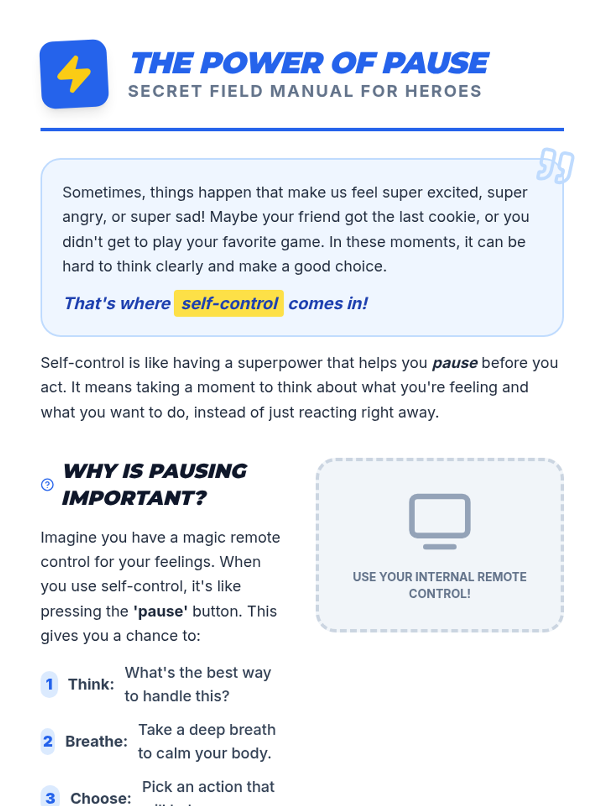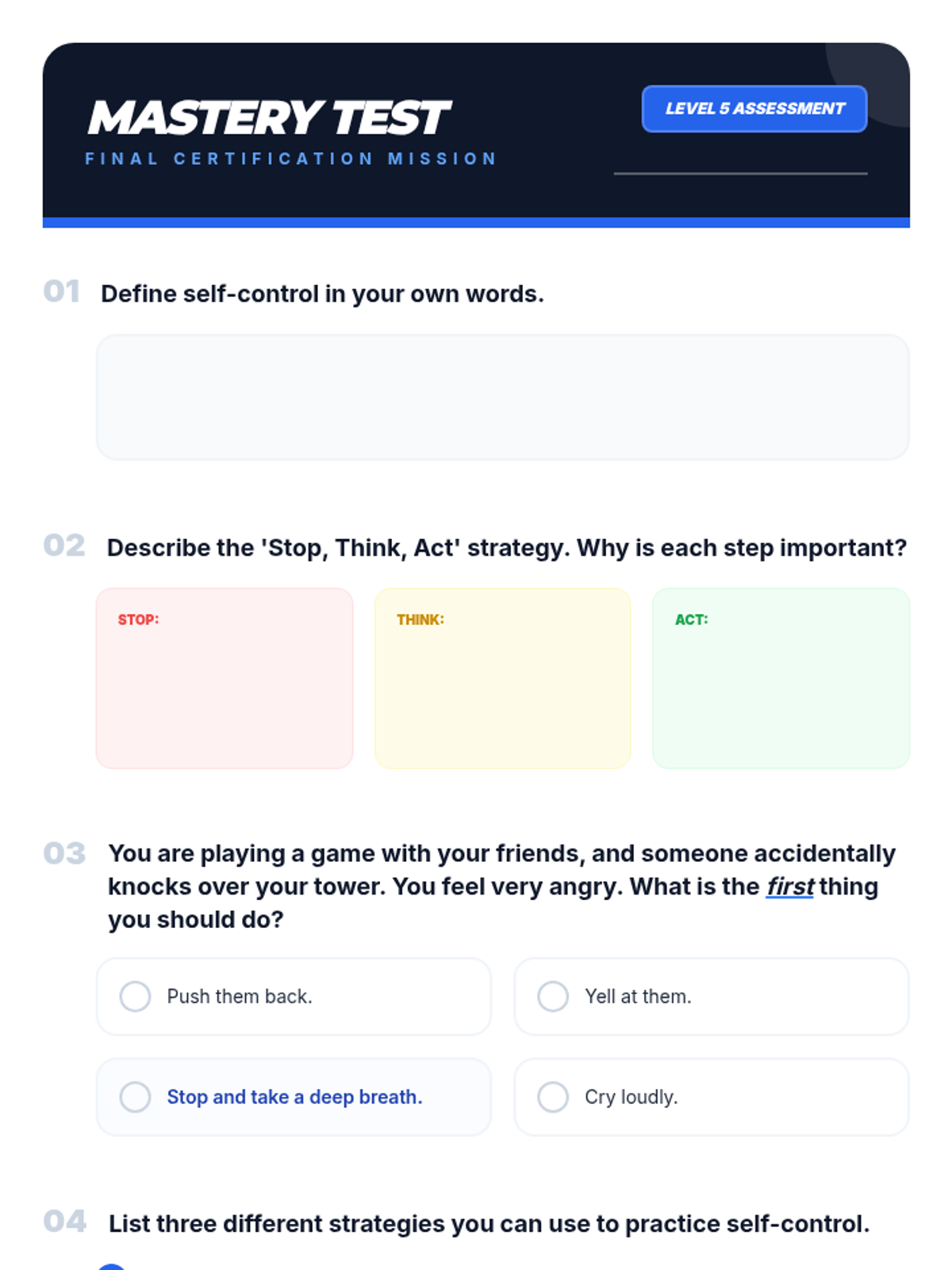 This single-session social-emotional learning lesson empowers 2nd-5th grade SPED students to understand and practice self-control through a superhero-themed approach. Students learn the 'Stop, Think, Act' strategy and develop a personal action plan for managing big emotions and impulses.
