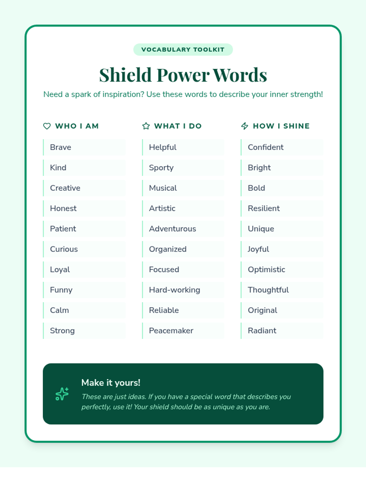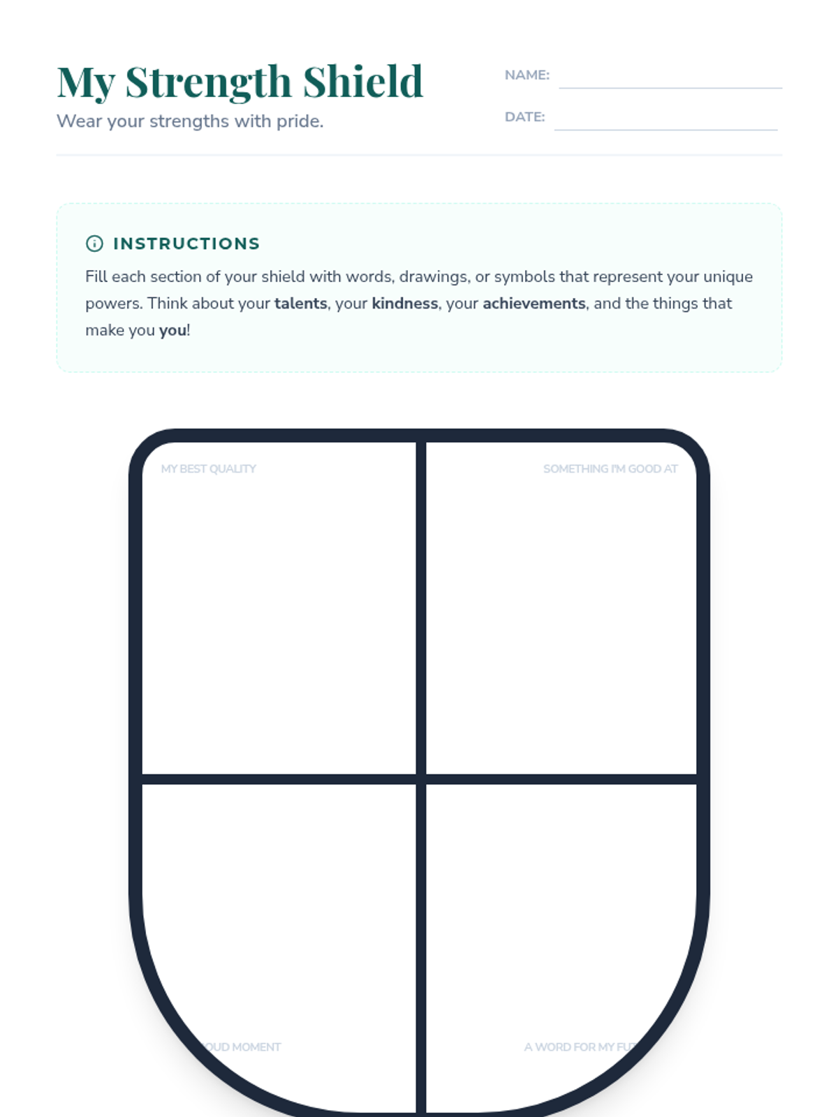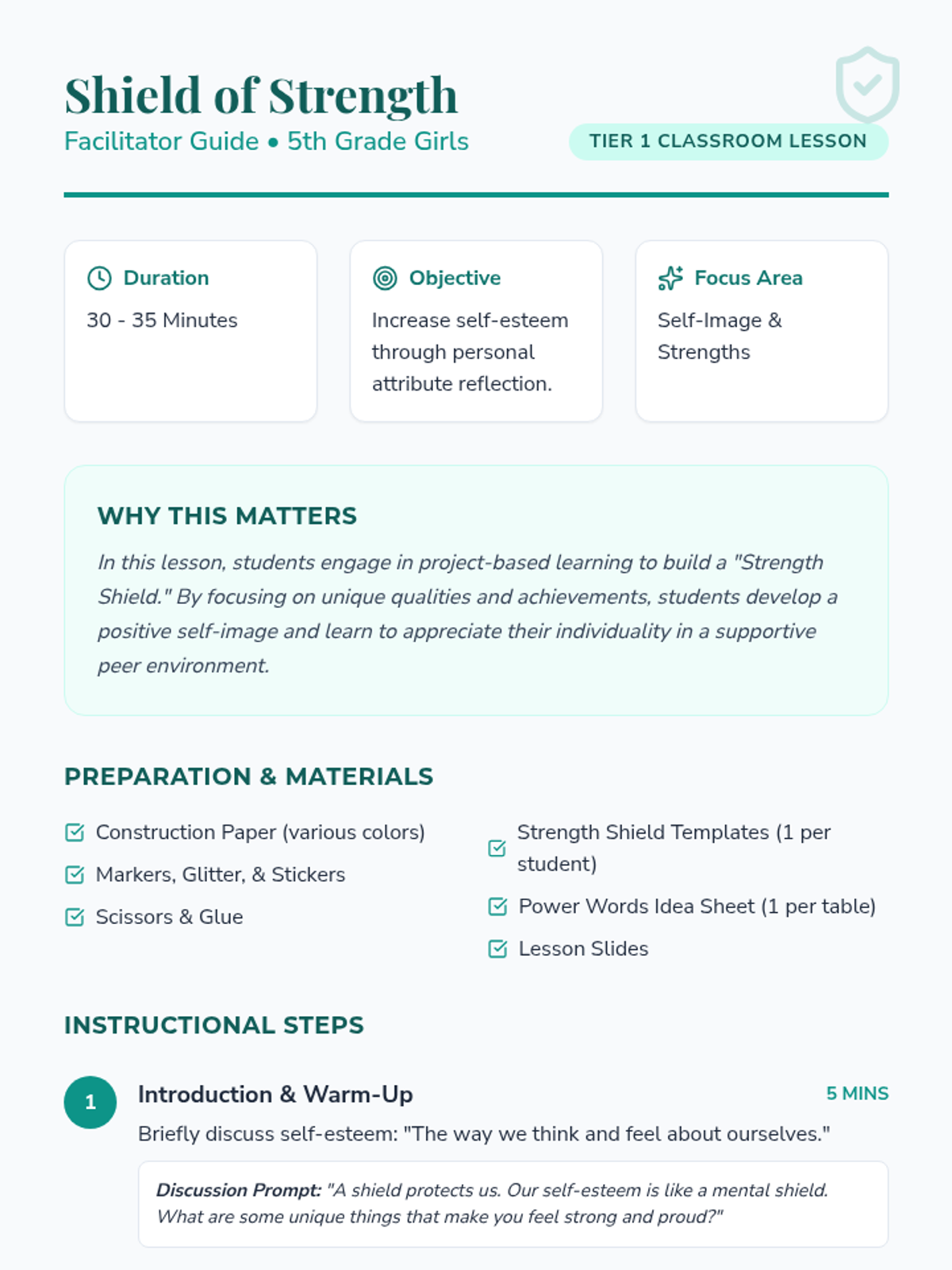A project-based lesson for 5th grade girls to build self-esteem by creating a 'Strength Shield' that represents their unique qualities, achievements, and positive attributes.