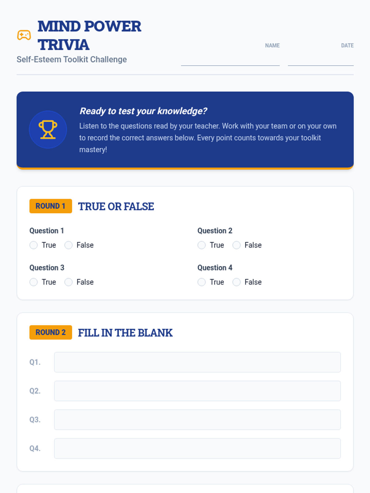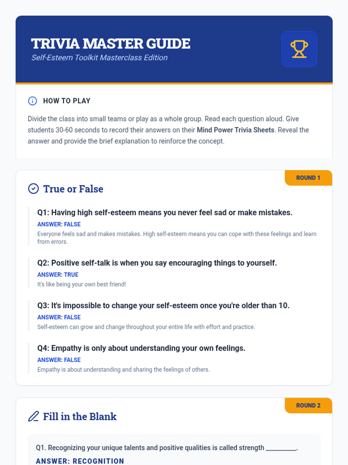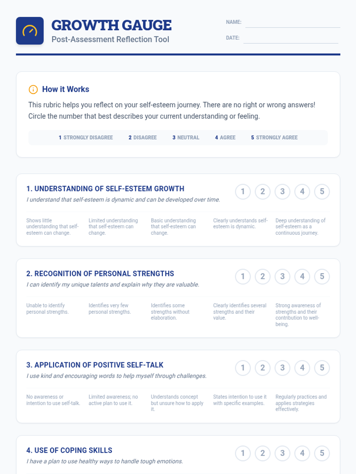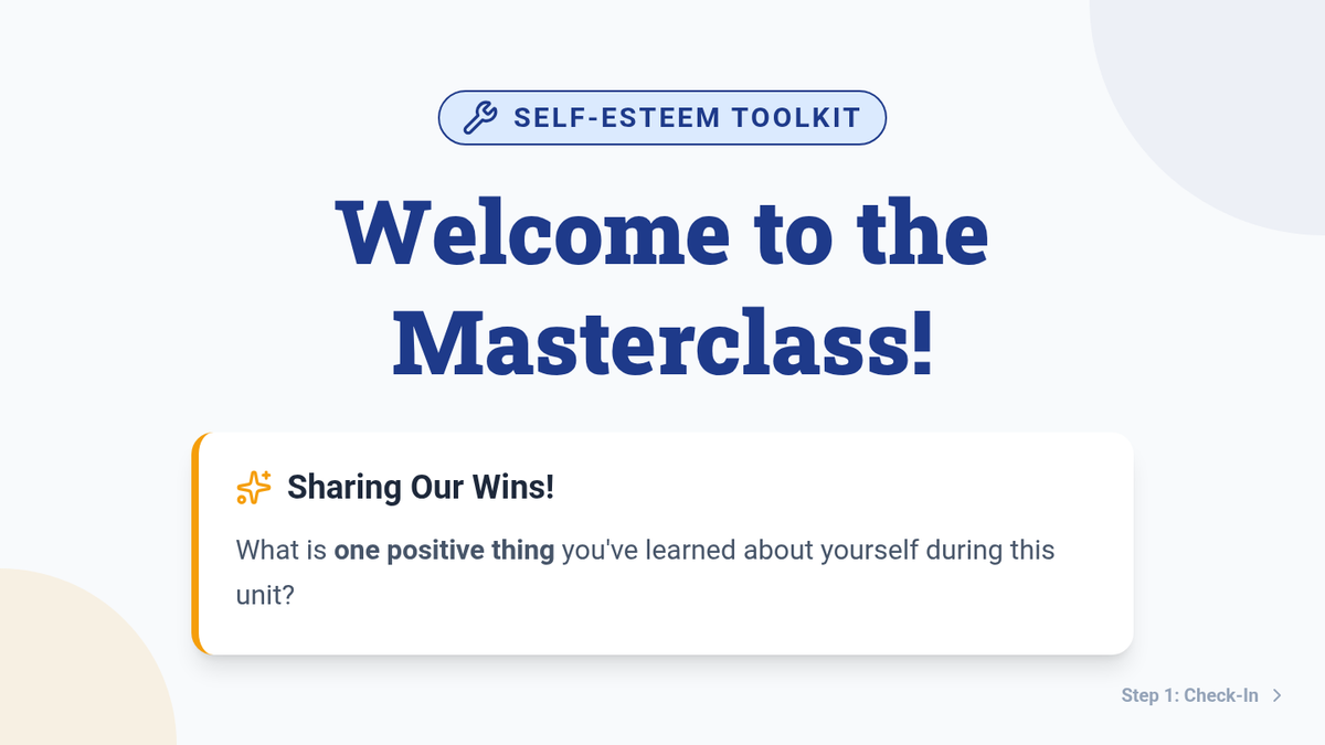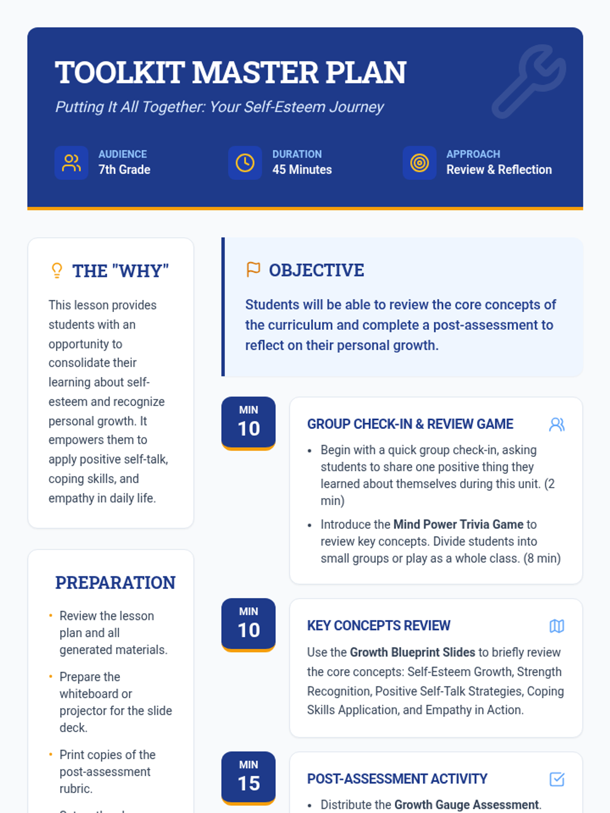 This lesson helps 7th-grade students review core self-esteem concepts and reflect on their growth through a post-assessment. This single session focuses on consolidating learning and celebrating personal progress using a toolkit metaphor.