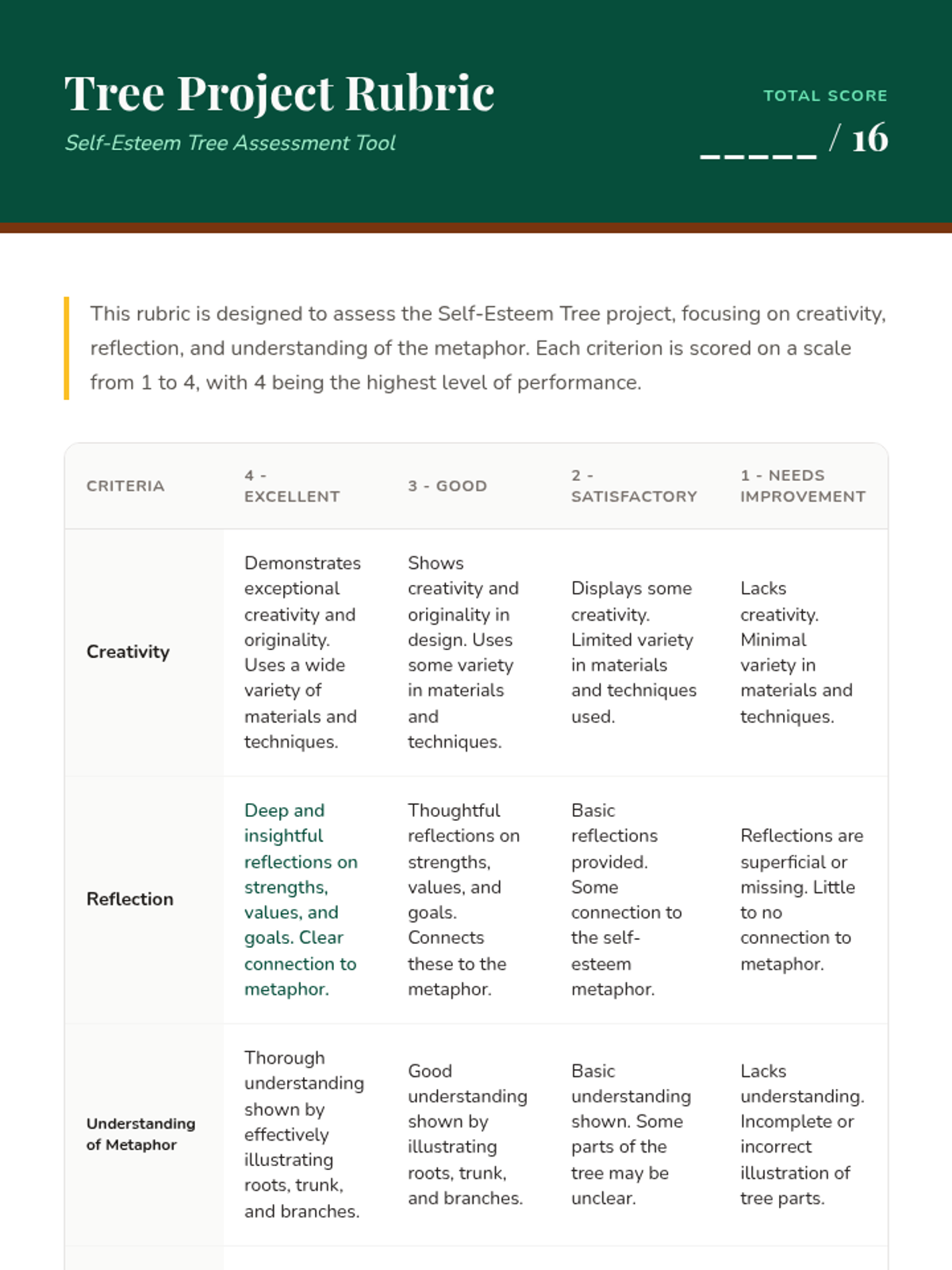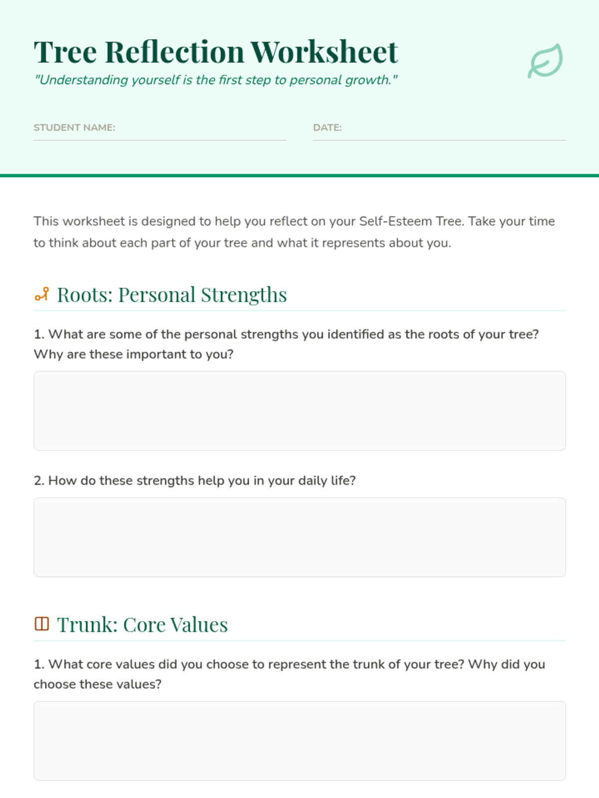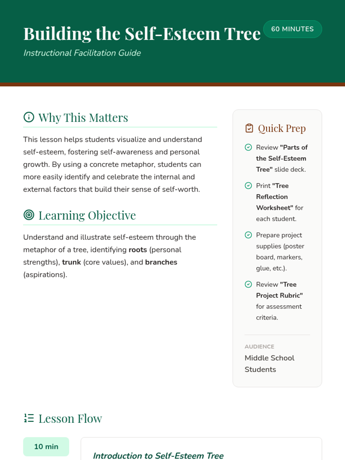 A lesson that uses the metaphor of a tree to help middle school students visualize and understand self-esteem, exploring their personal strengths, core values, and aspirations.