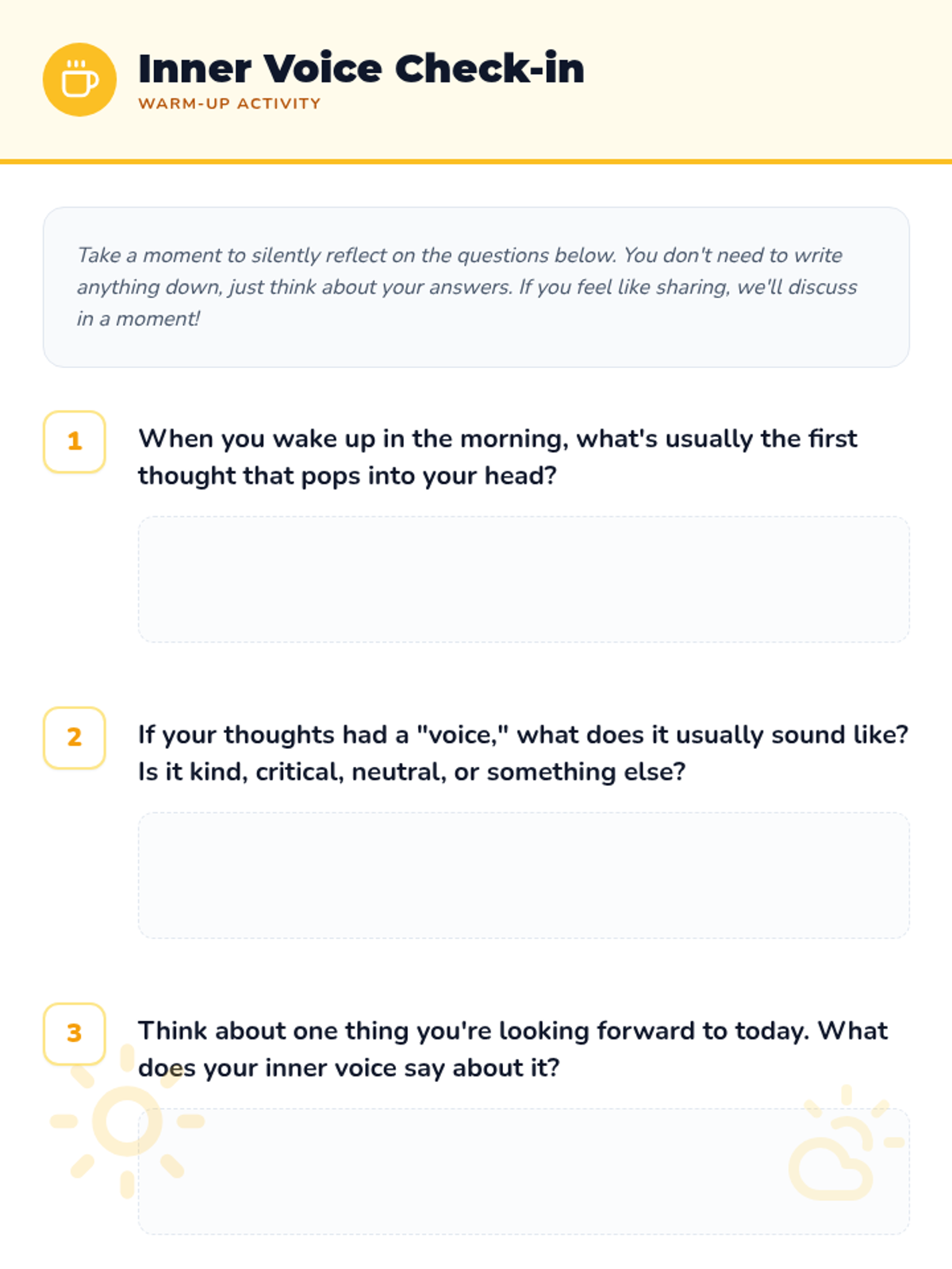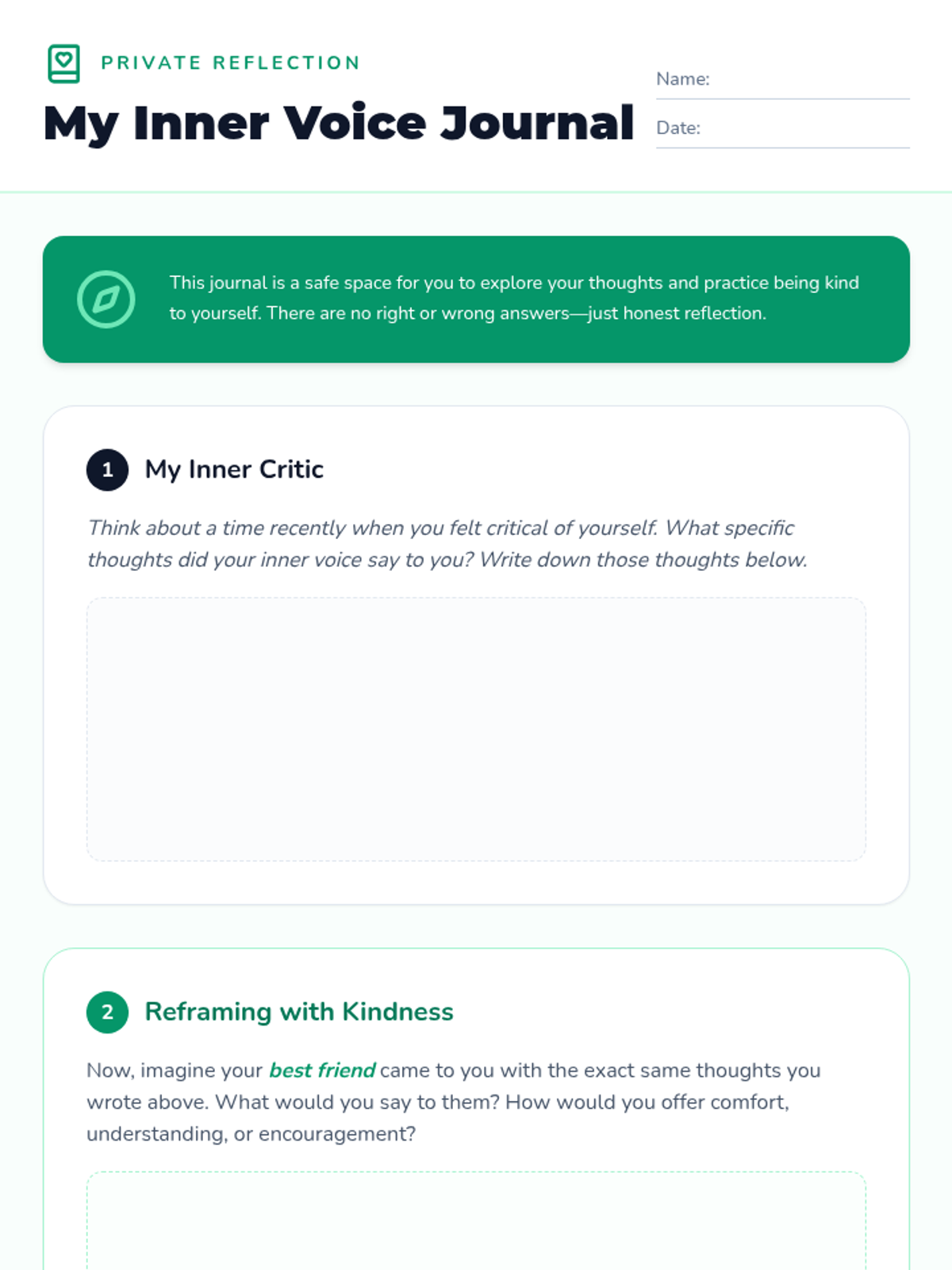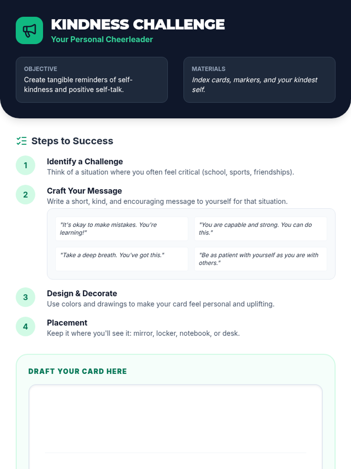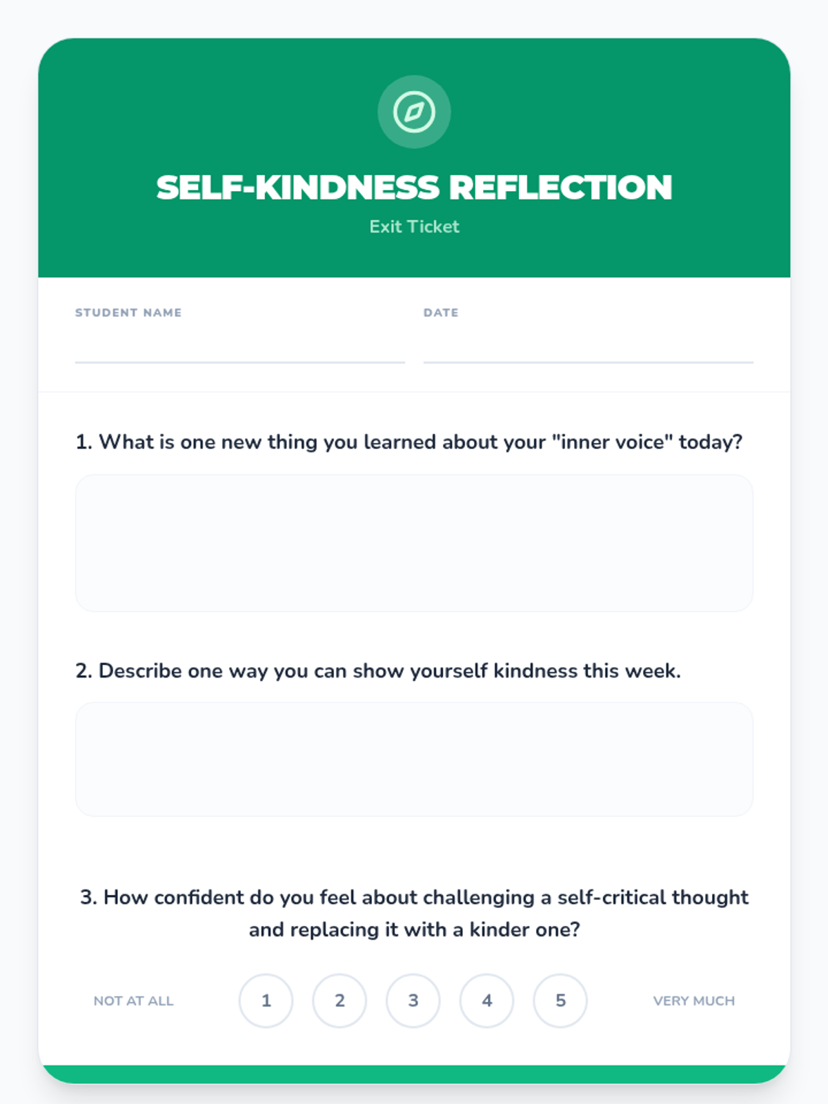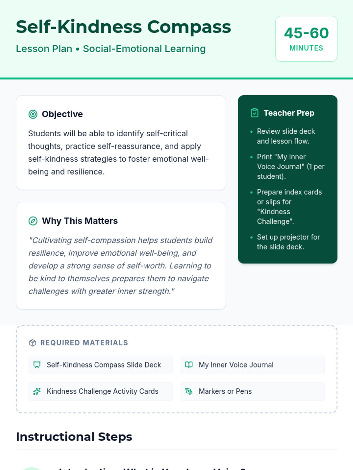A social-emotional learning lesson for grades 5-9 focused on identifying self-critical thoughts and cultivating a kinder, more compassionate inner voice. Students will engage in reflection, journaling, and practical activities to build self-esteem and resilience.