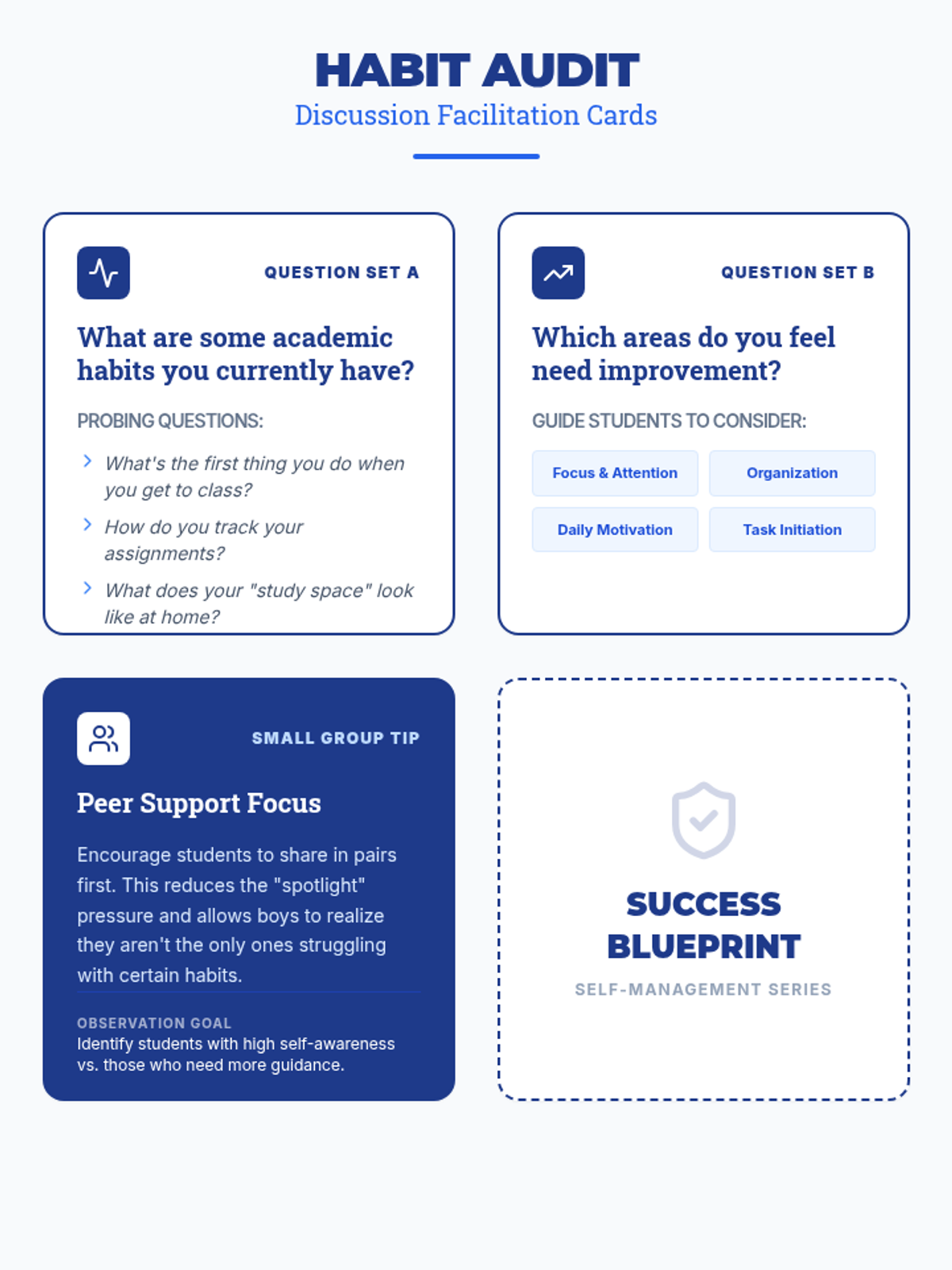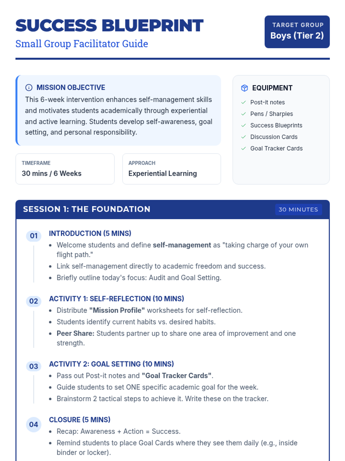A 6-week small group intervention for boys focused on self-management, goal setting, and academic motivation using experiential learning.